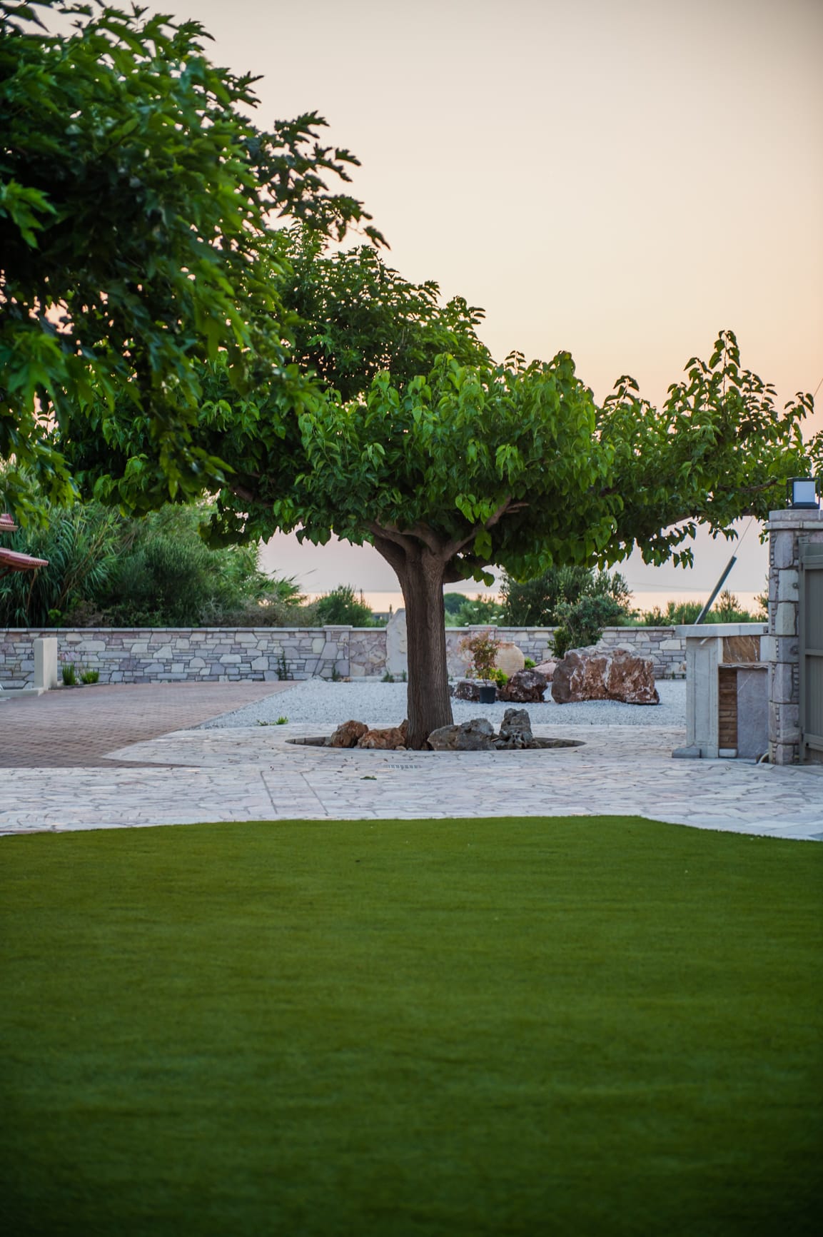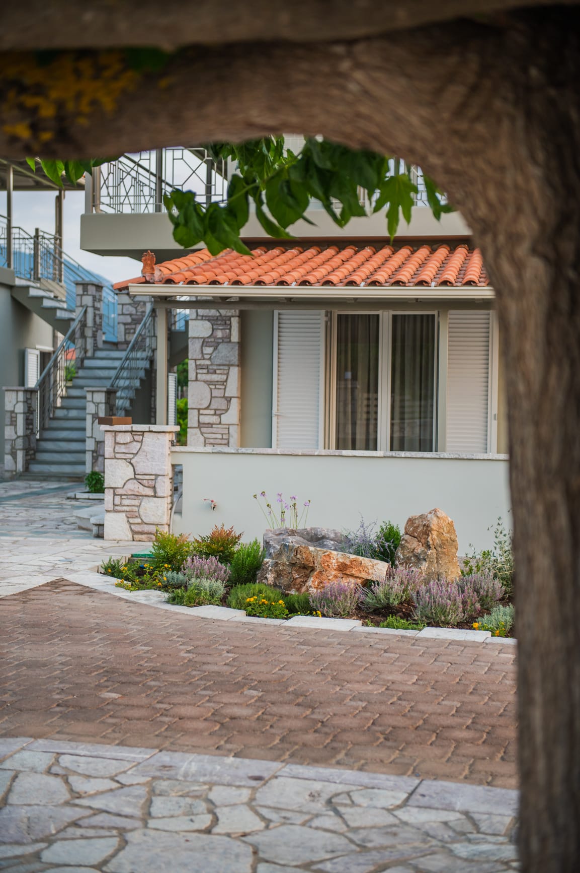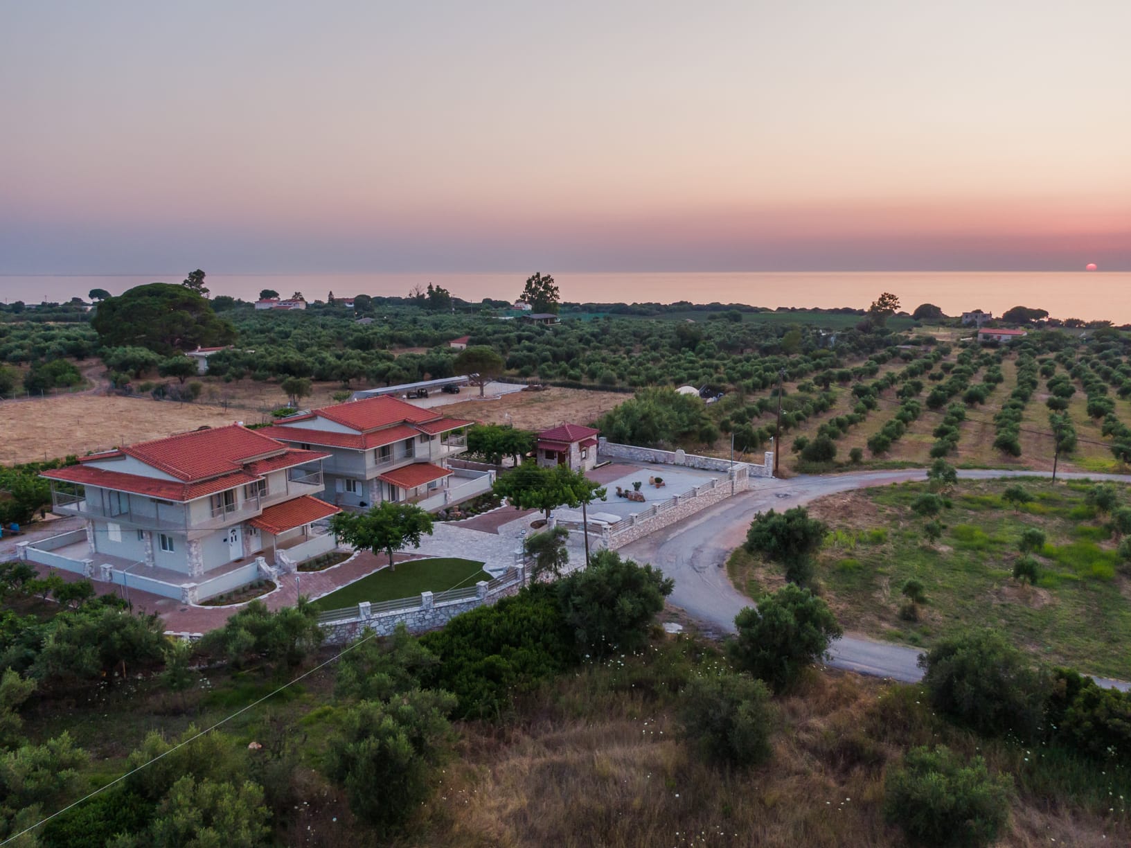 The complex can accommodate up to 33 guests and offers a serene natural environment with a courtyard, garden, vineyard, and organic vegetable garden. Free-roaming animals, such as sheep and goats, enhance the sense of an authentic rural lifestyle in perfect harmony with nature. Several outdoor sitting areas with sea views create ideal spaces for relaxation, reading, meditation, or small private wellness sessions.