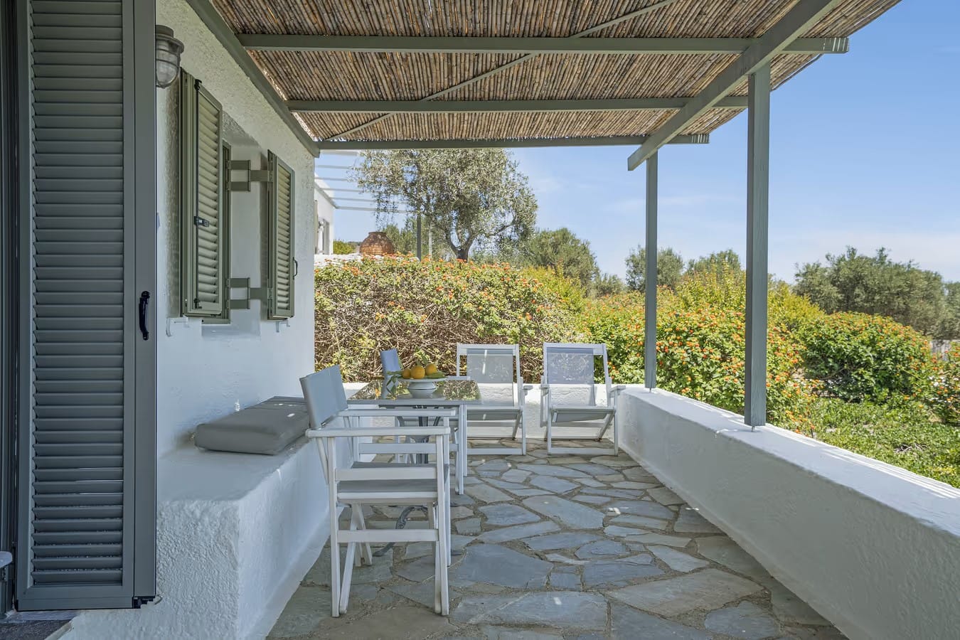 They are luxurious, comfortable and simple, with authentic paintings and handmade articles of blue glass, specially designed to suit individual tastes, for unforgettable holidays, in the local country style, with big verandas covered with pergolas equipped for dinning and rest.