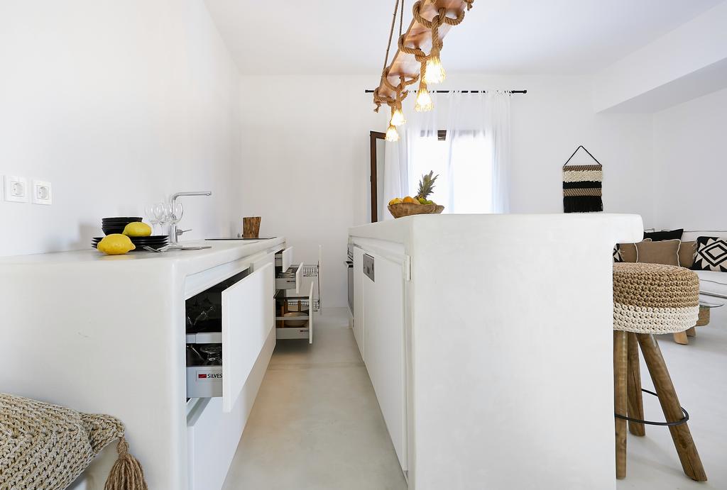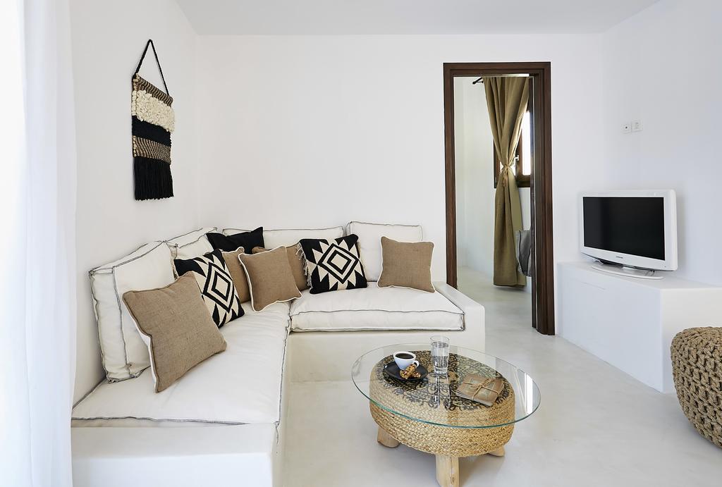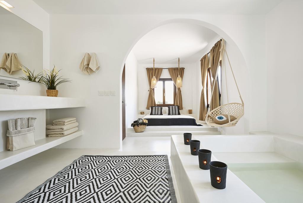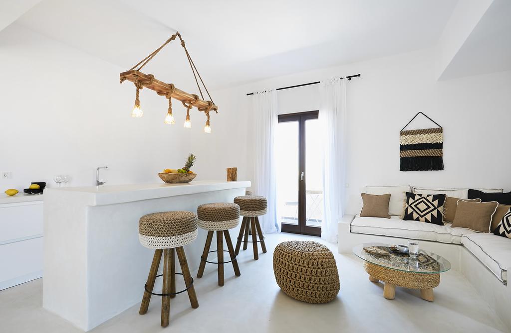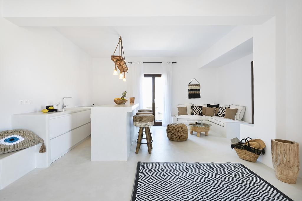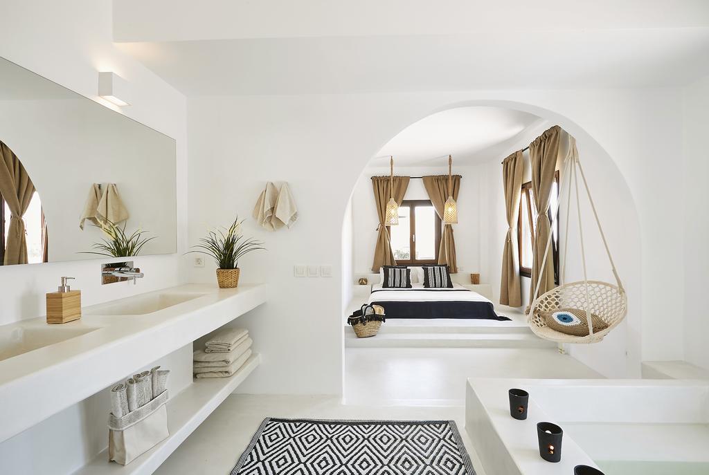 The main living spaces of Le Blanc Suite are in an open layout concept: 110sq.m. living dining and kitchen. Adjacent to the living room is the master bedroom with ensuite bathroom as well as the other two bedrooms with view to the magnificent village of "Pyrgos". Windows run the length of the house, brightening the space with natural light. The large 50 sq.m veranda with infinity view, and the large dining table is designed to offer tranquility and relaxation all day long.
