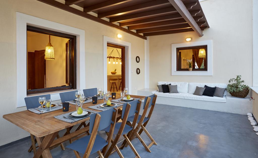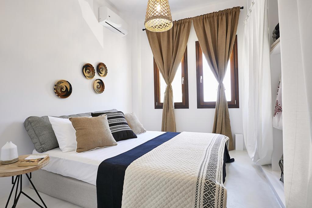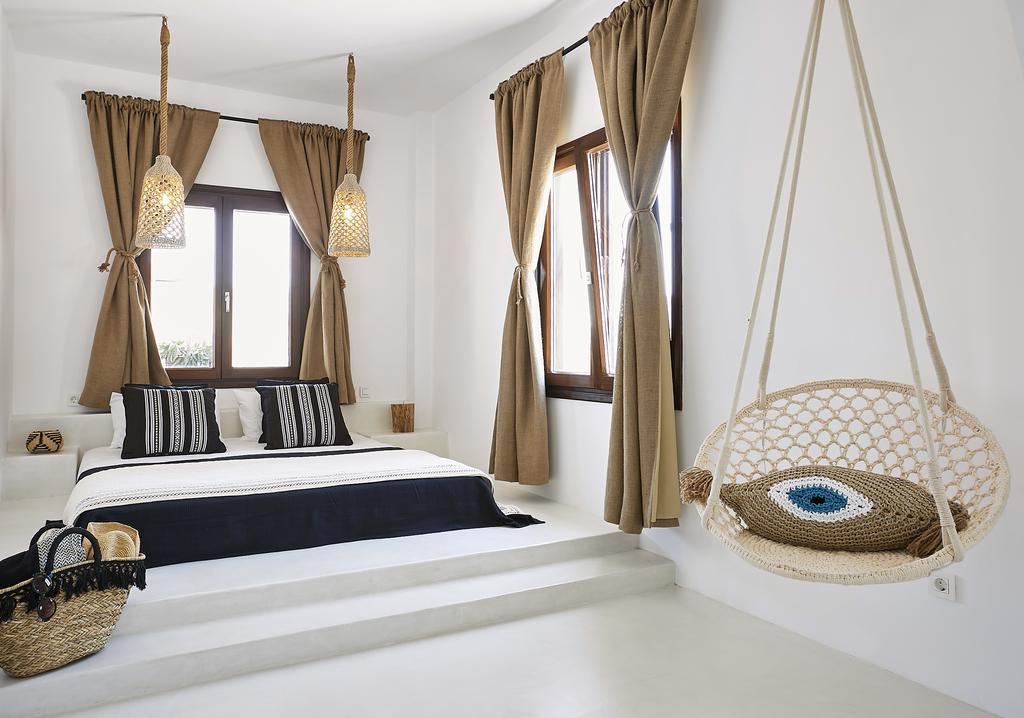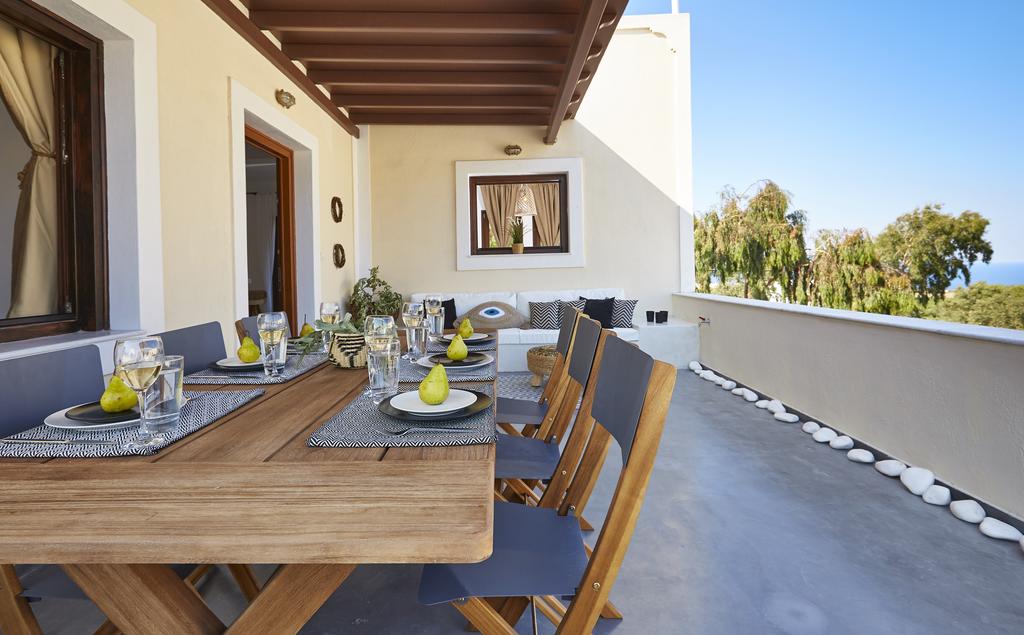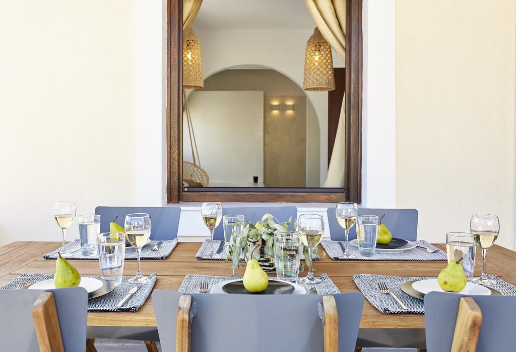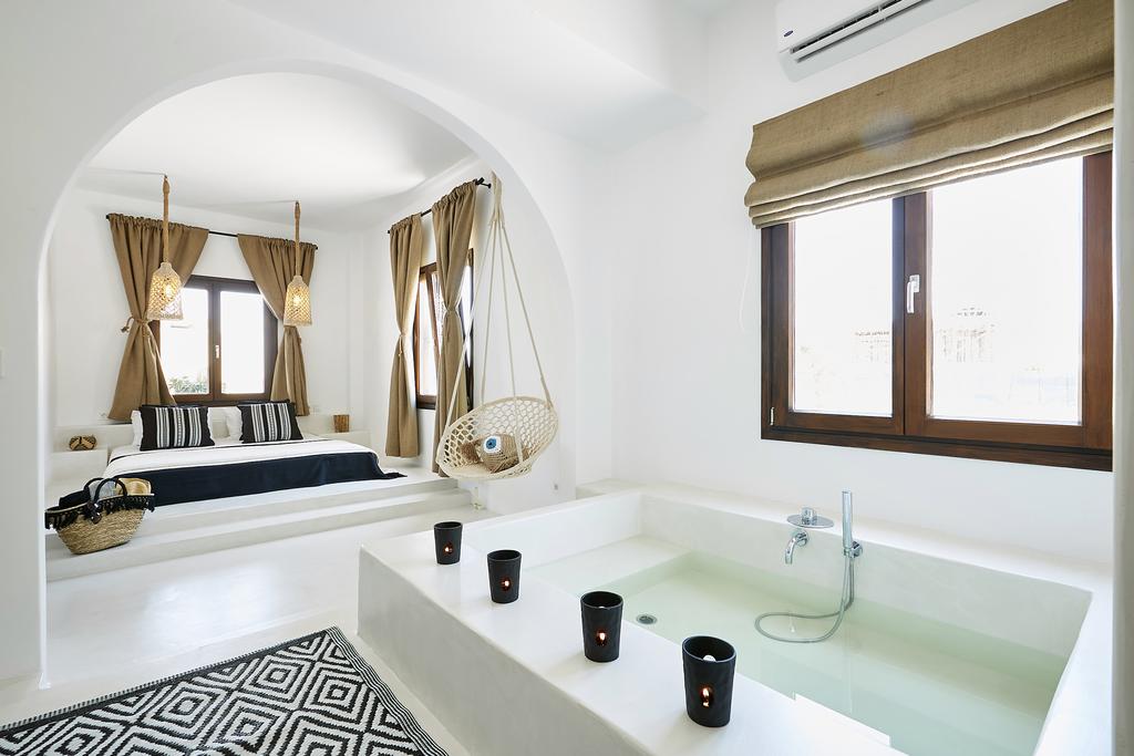 The main living spaces of Le Blanc Suite are in an open layout concept: 110sq.m. living dining and kitchen. Adjacent to the living room is the master bedroom with ensuite bathroom as well as the other two bedrooms with view to the magnificent village of "Pyrgos". Windows run the length of the house, brightening the space with natural light. The large 50 sq.m veranda with infinity view, and the large dining table is designed to offer tranquility and relaxation all day long.
