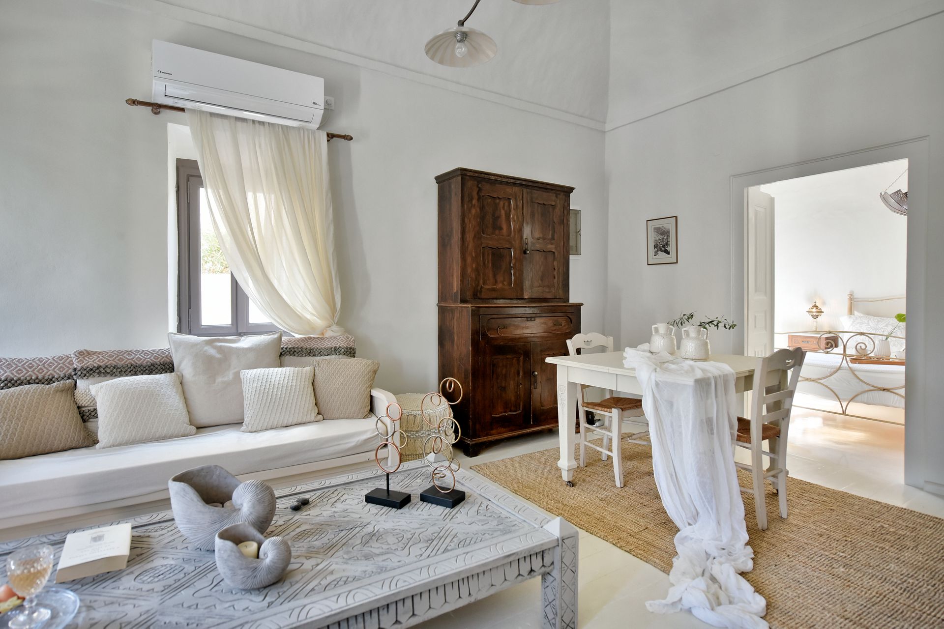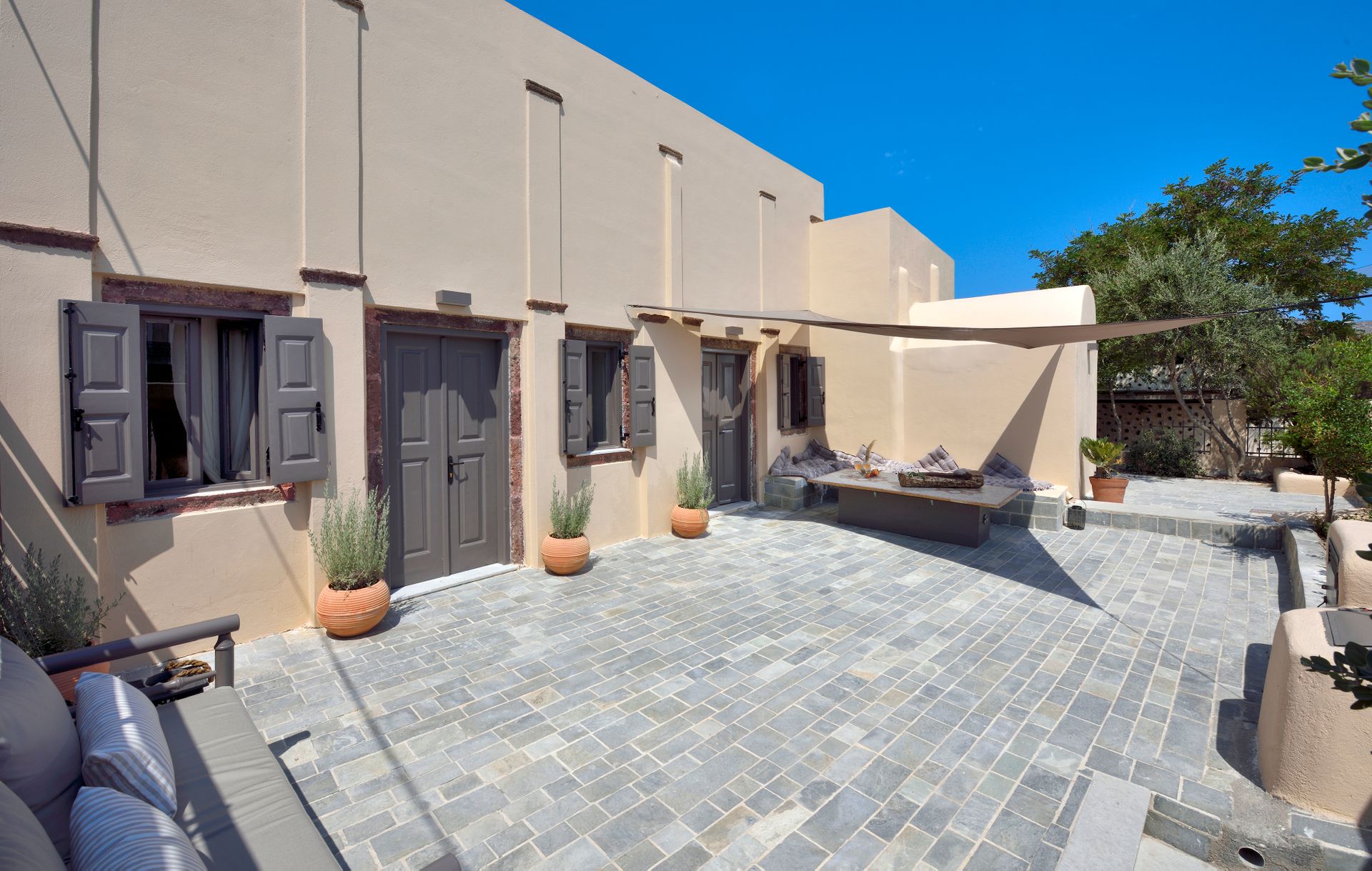 The guests may relax at the comfortable courtyard of the Mansion or enjoy the breathtaking view of the island from its traditional Terrace. Free Wi-Fi TV is available in the Villa.