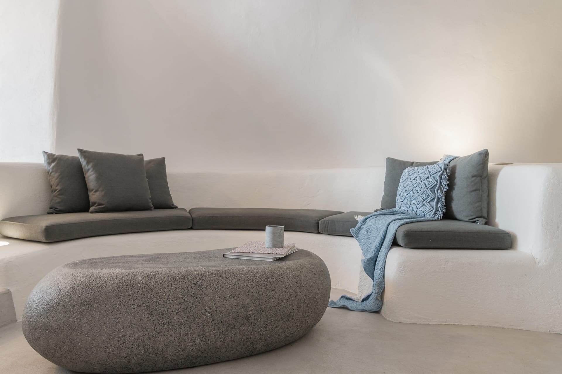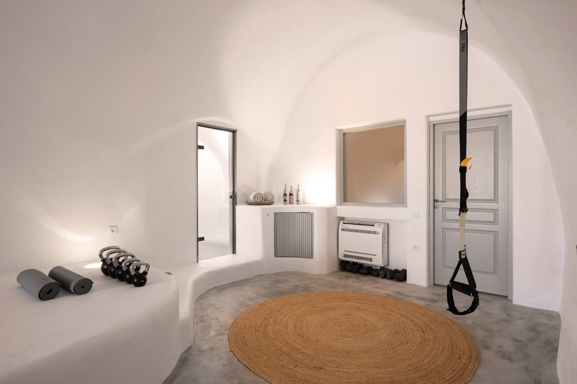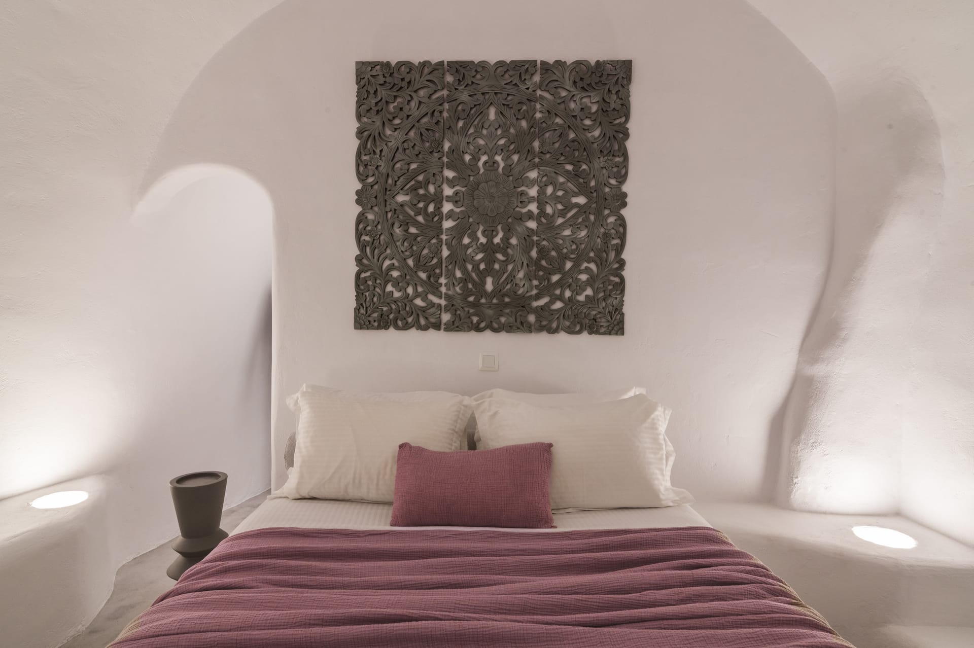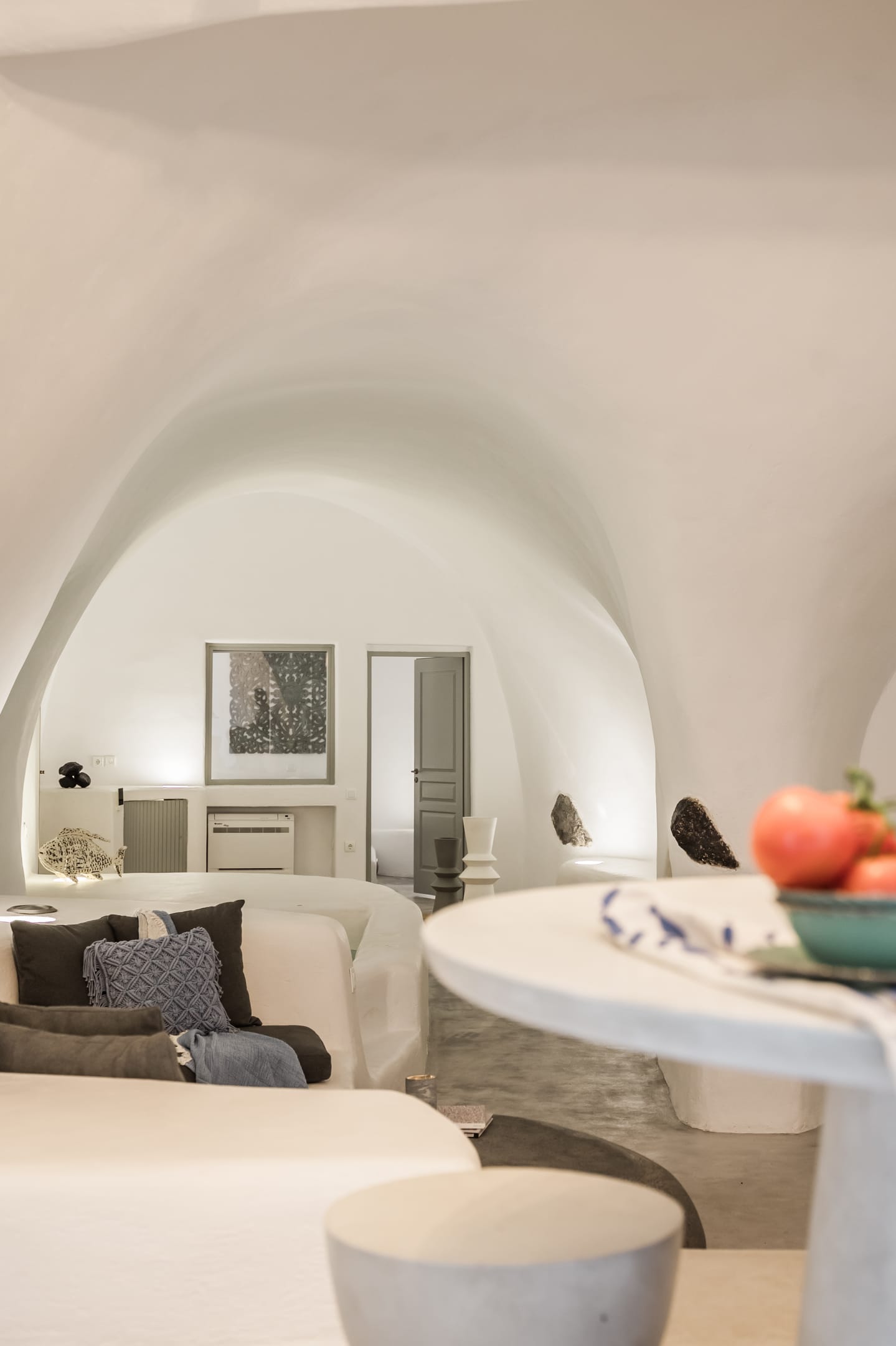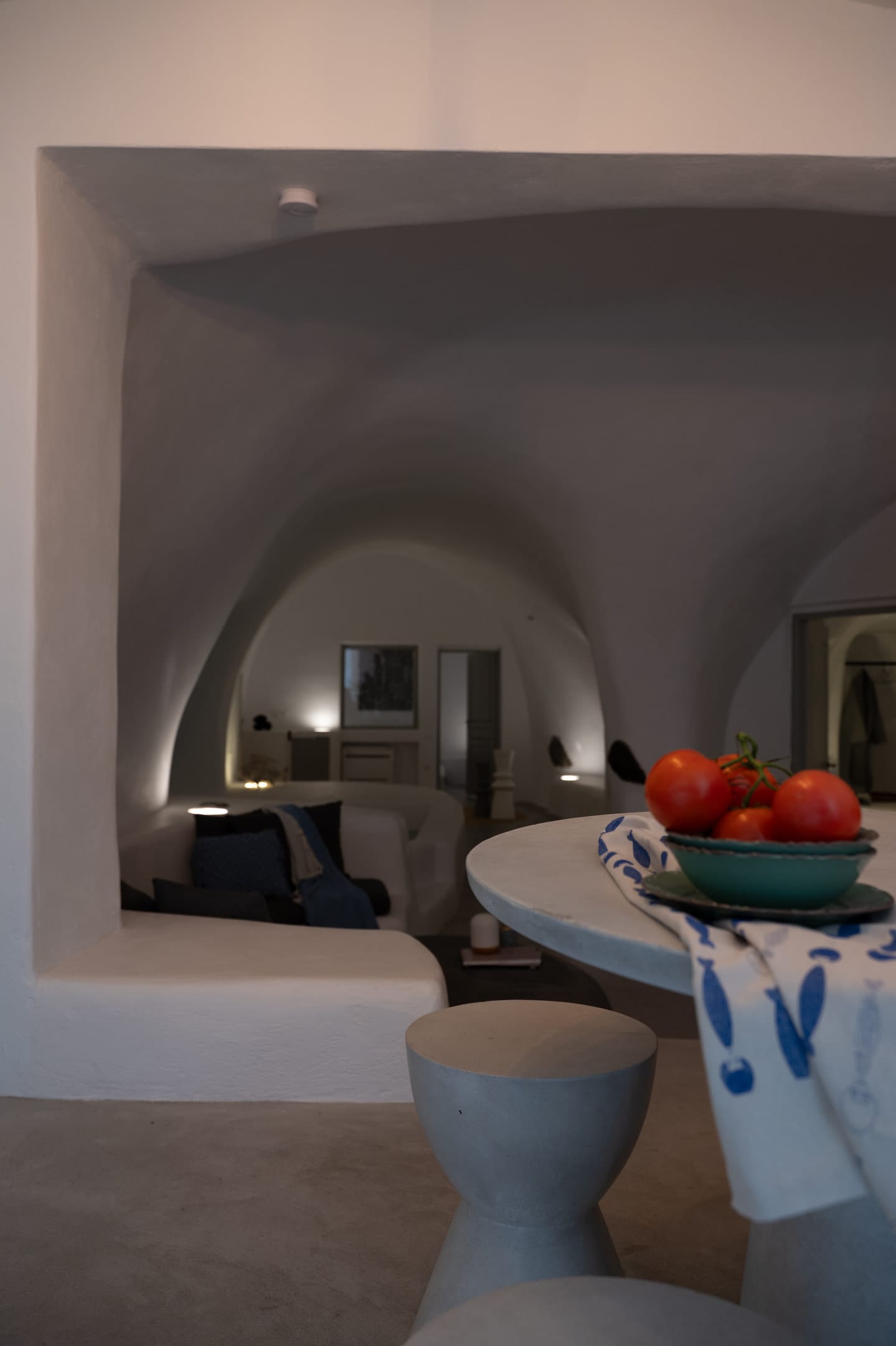 Cave House Villa – A minimal luxury villa nestled in the peaceful village of Megalochori, Santorini. Carved into the volcanic rock and inspired by traditional Cycladic architecture, the villa masterfully blends timeless elements with modern design. It features two king-size bedrooms with orthopedic mattresses, two full bathrooms, a heated jacuzzi, private hammam, mini gym, a fully equipped kitchen, and a cozy lounge area.
