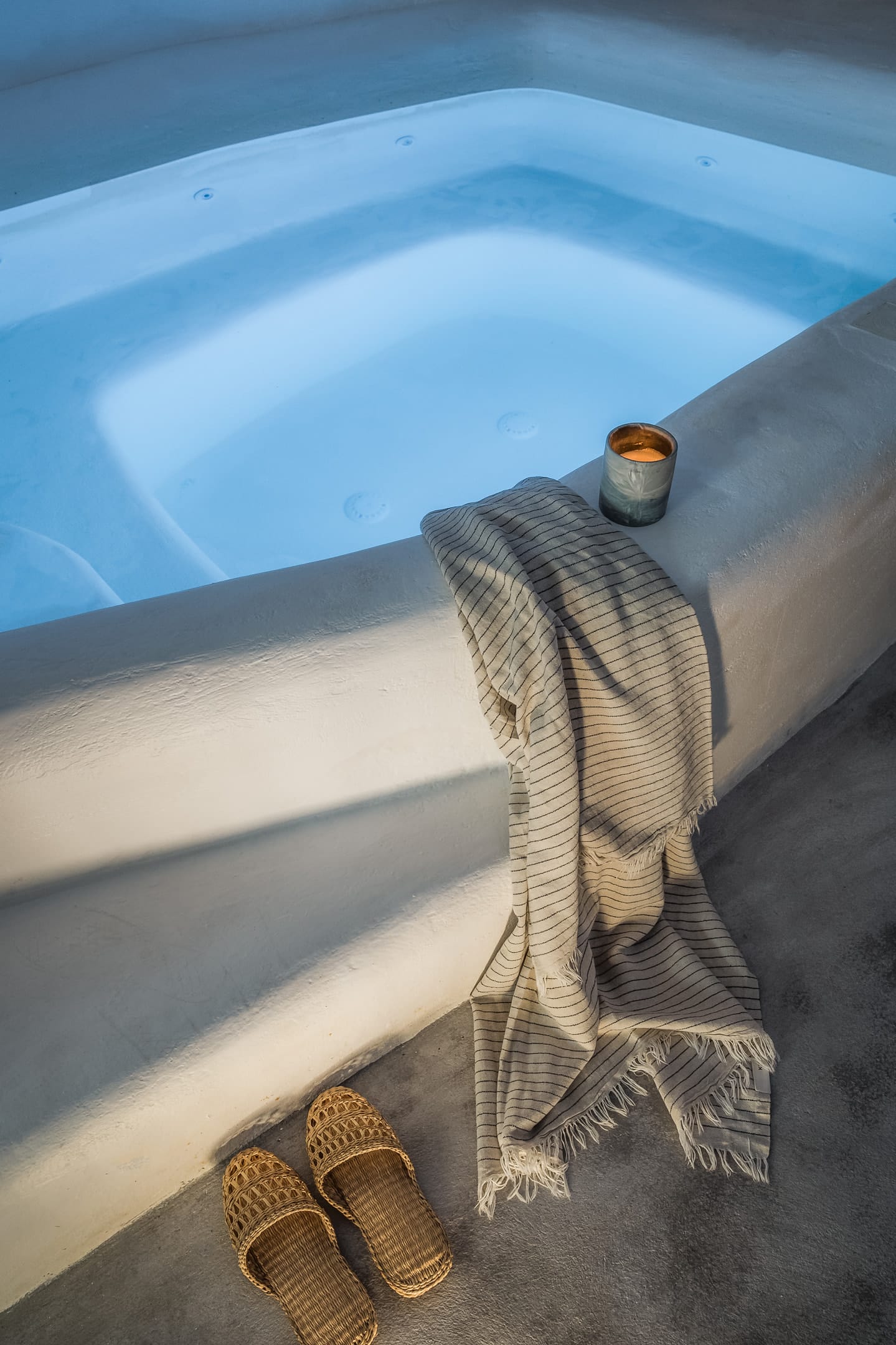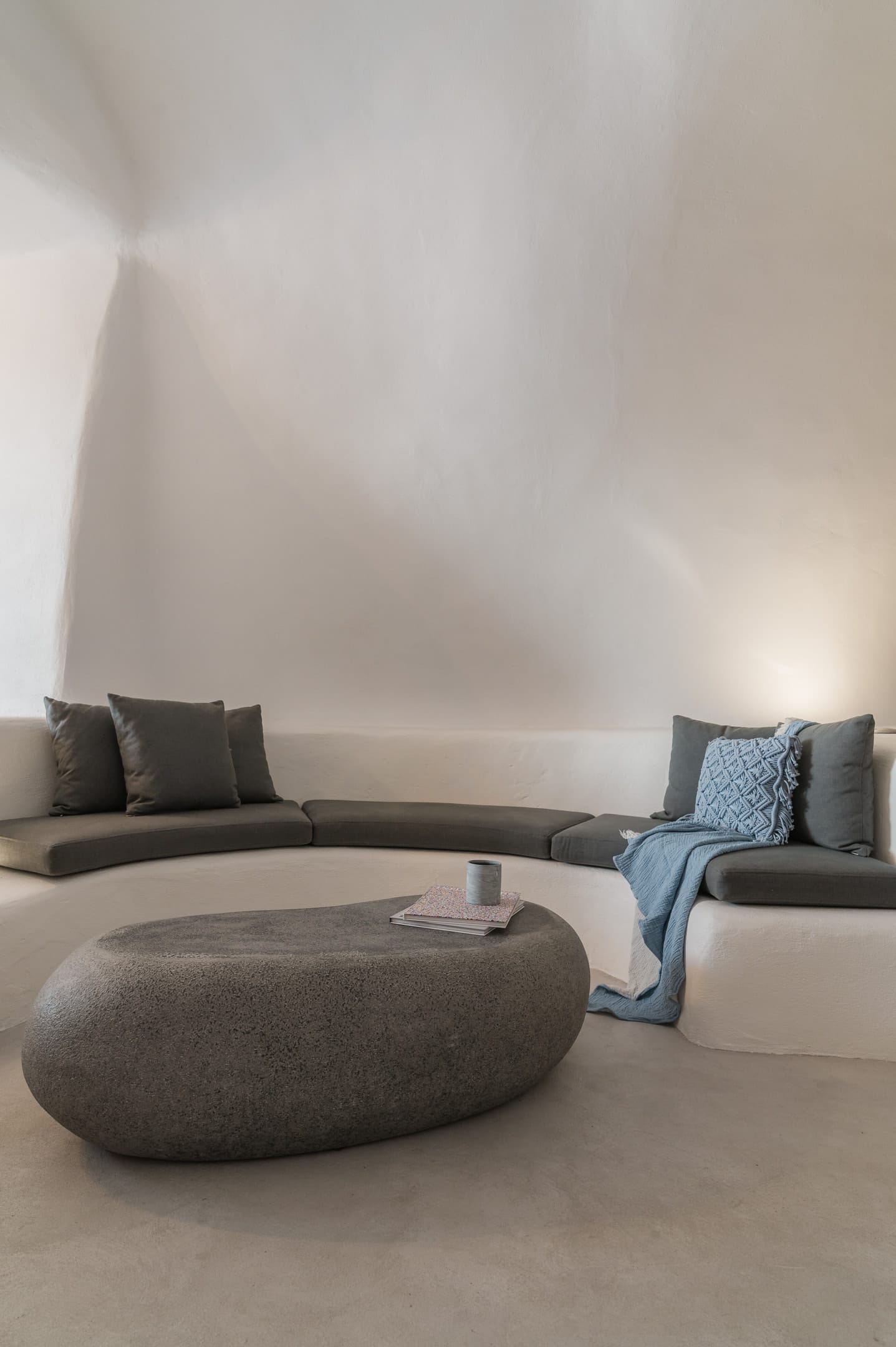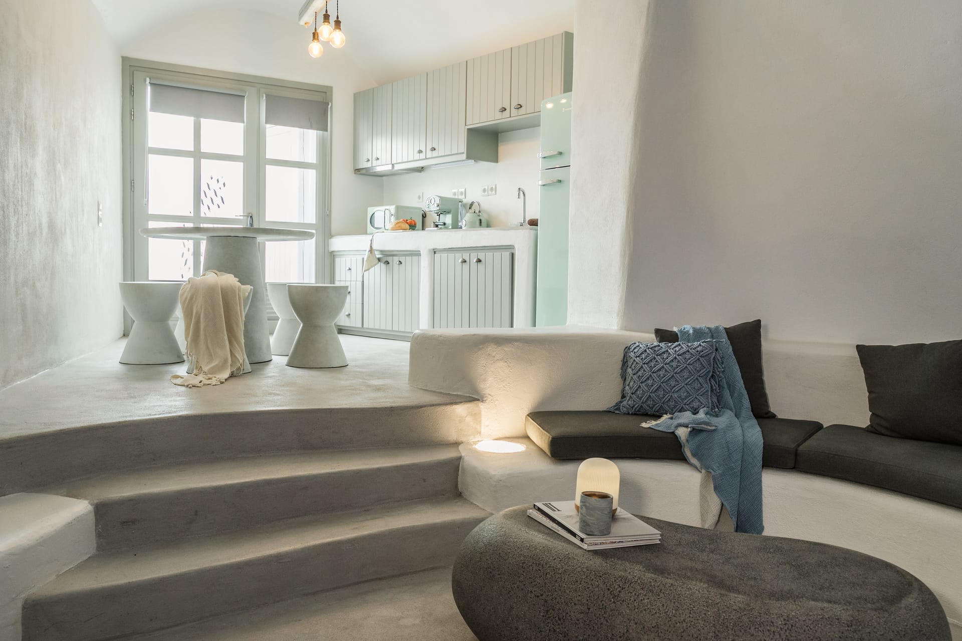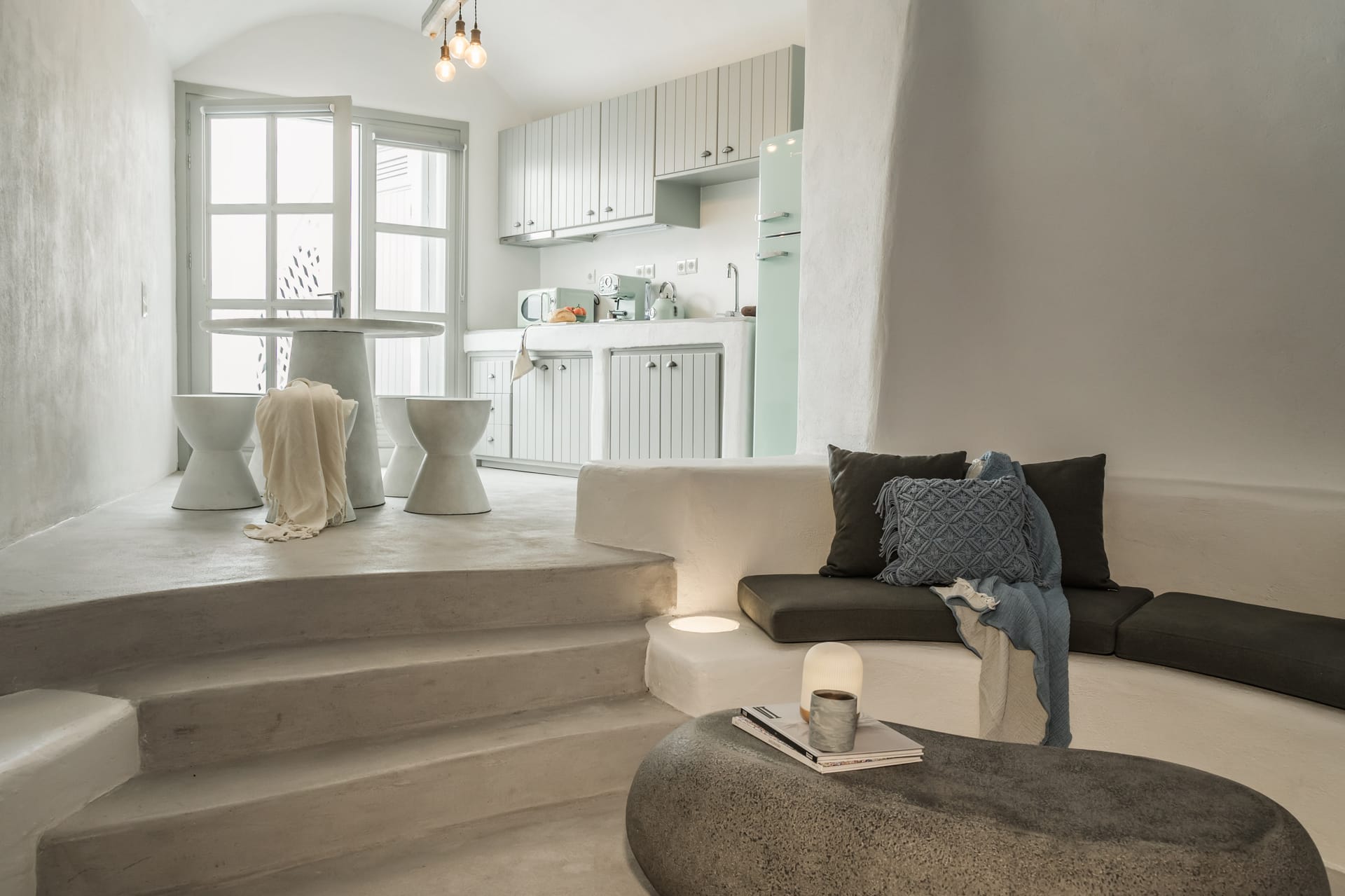 Cave House Villa – A minimal luxury villa nestled in the peaceful village of Megalochori, Santorini. Carved into the volcanic rock and inspired by traditional Cycladic architecture, the villa masterfully blends timeless elements with modern design. It features two king-size bedrooms with orthopedic mattresses, two full bathrooms, a heated jacuzzi, private hammam, mini gym, a fully equipped kitchen, and a cozy lounge area.