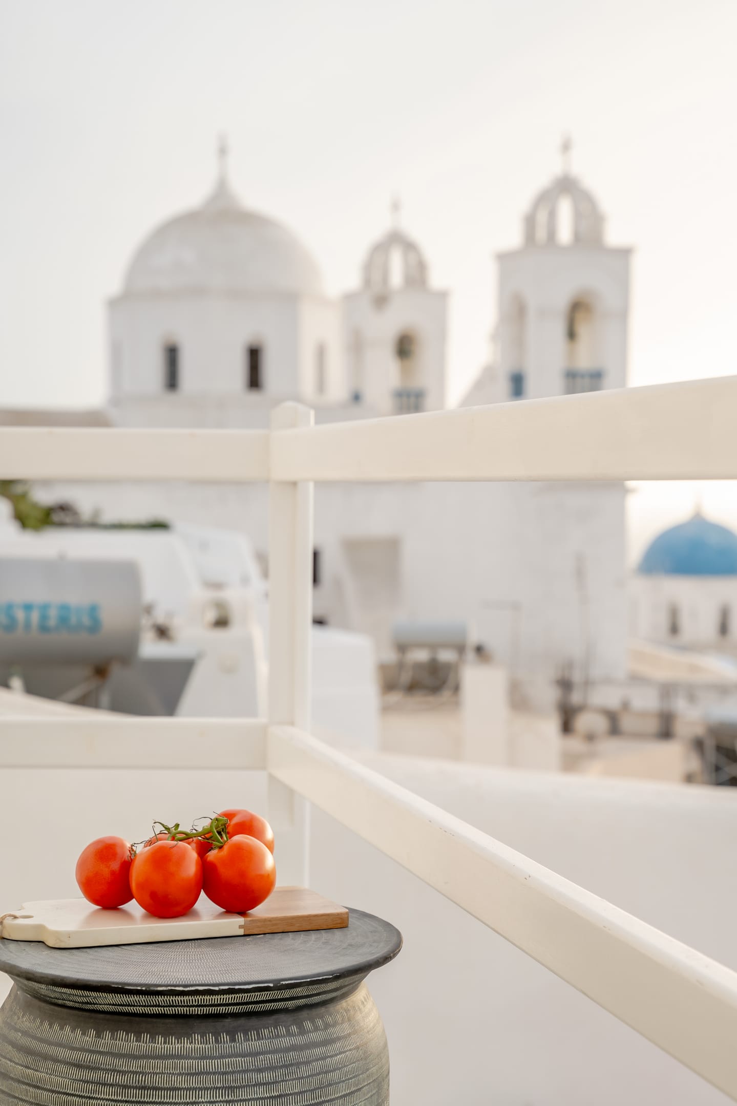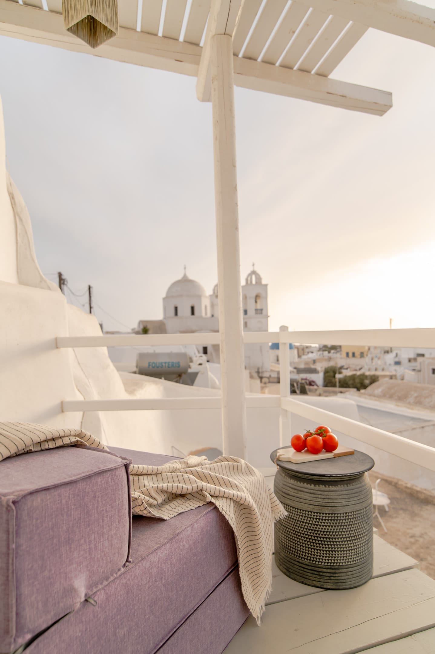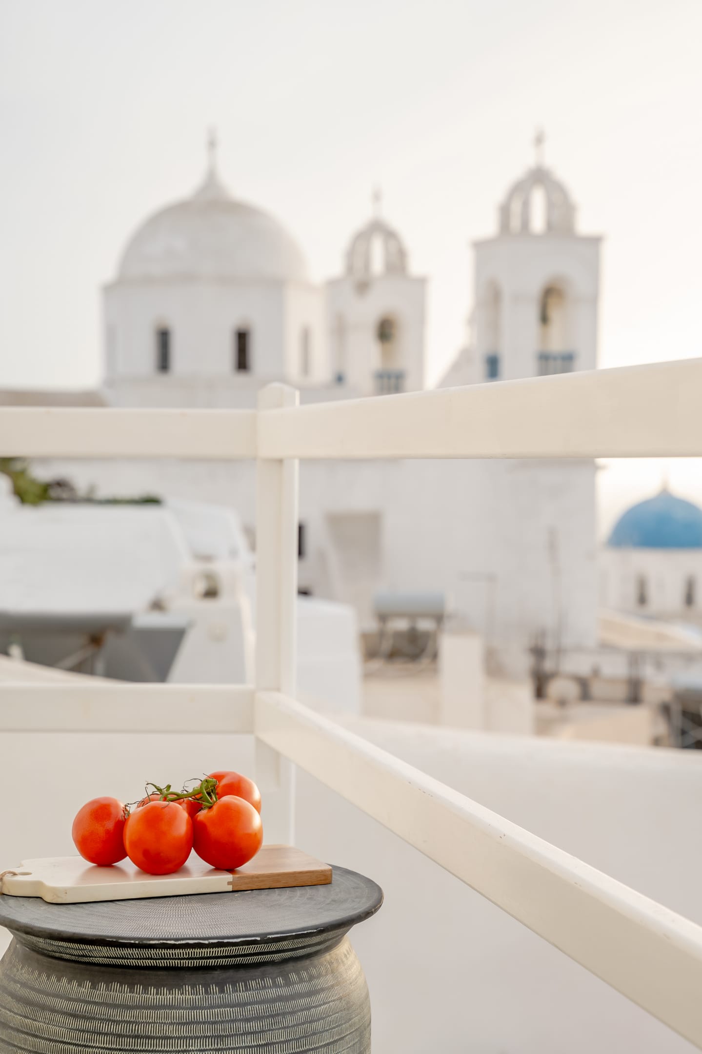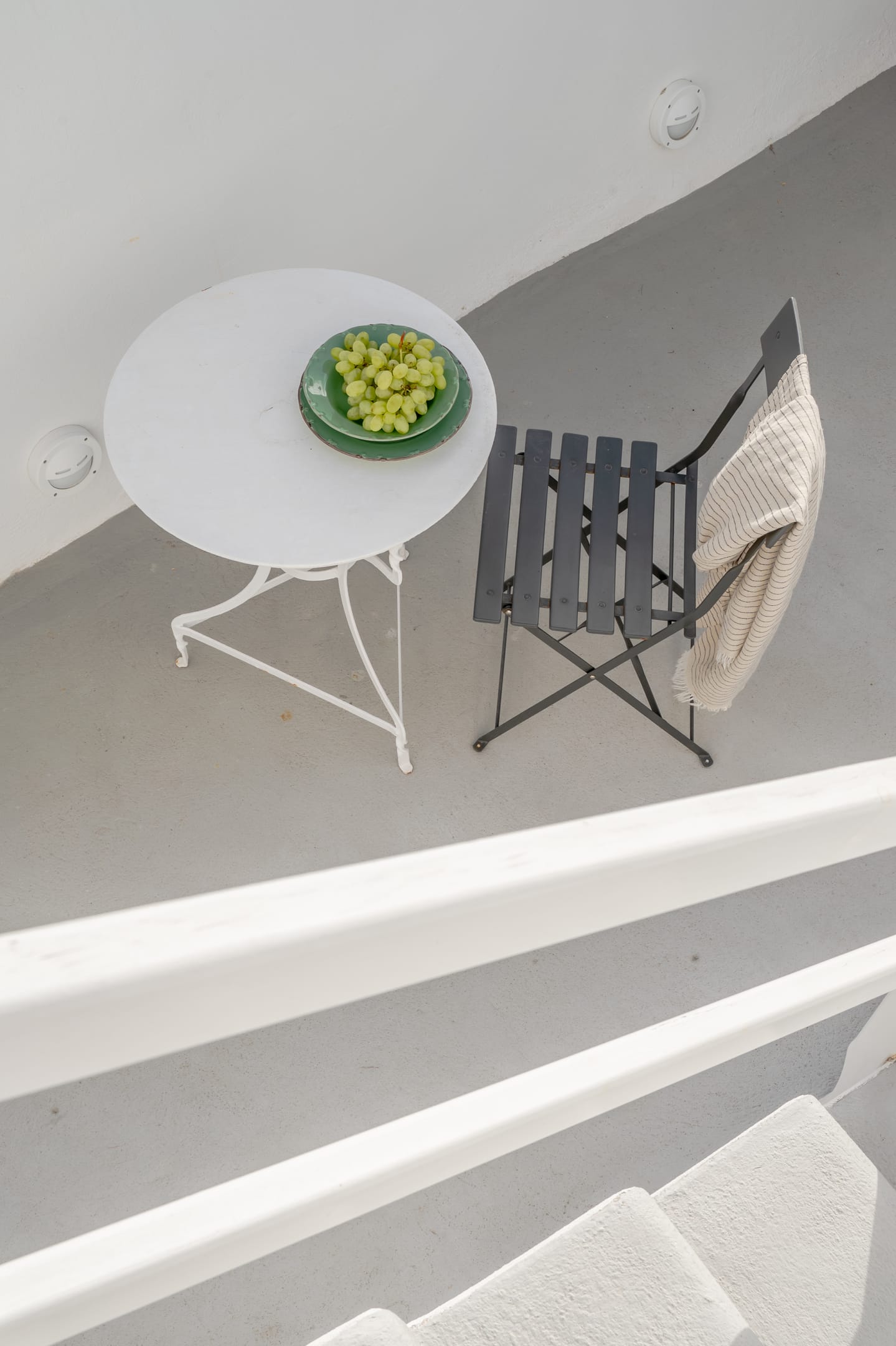 The spacious veranda and rooftop terrace open up to panoramic views of the caldera, the Aegean Sea, and Santorini’s iconic sunsets. The whitewashed, minimalist palette and curated amenities elevate both the aesthetic and the essence of the experience.