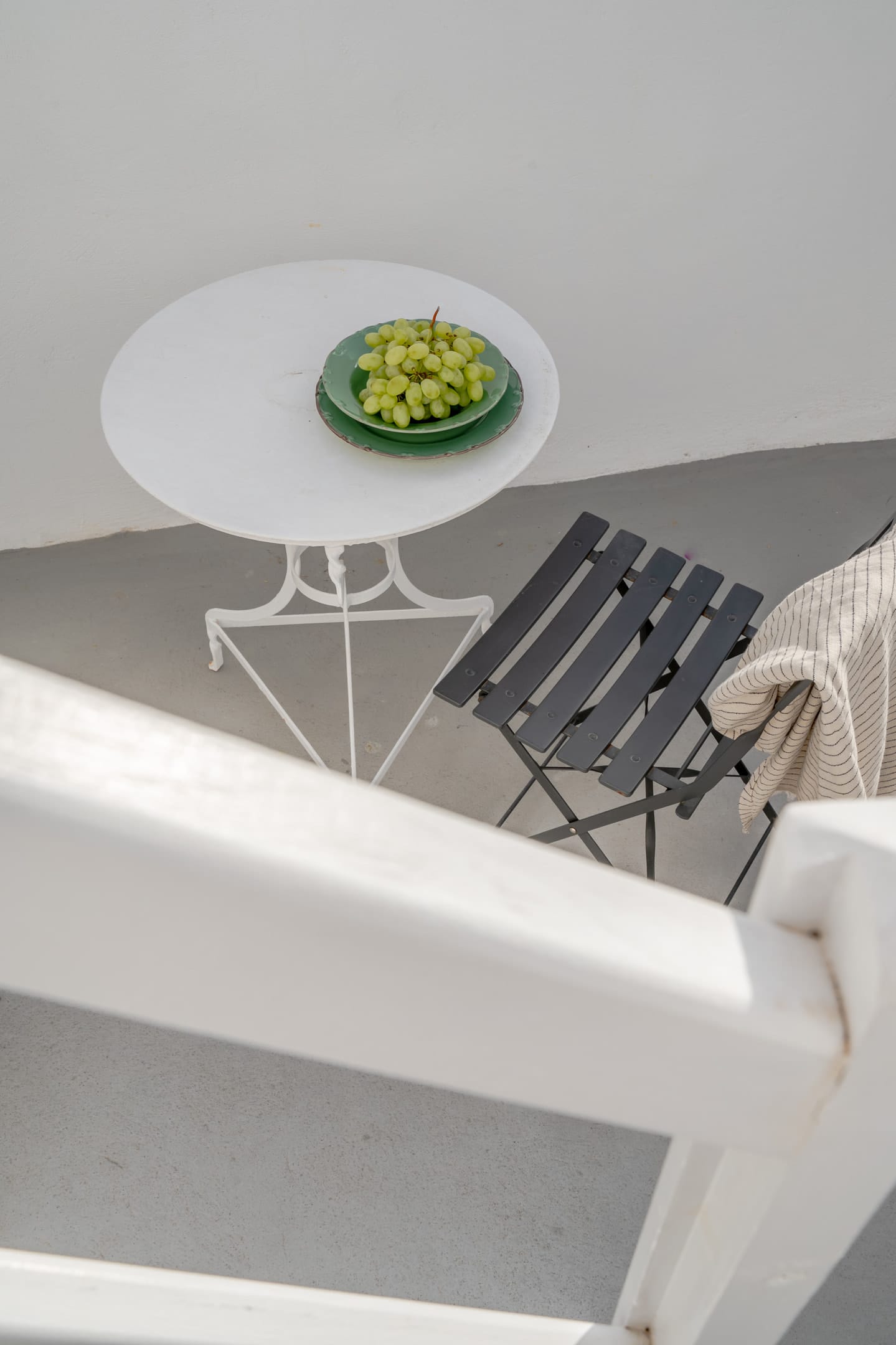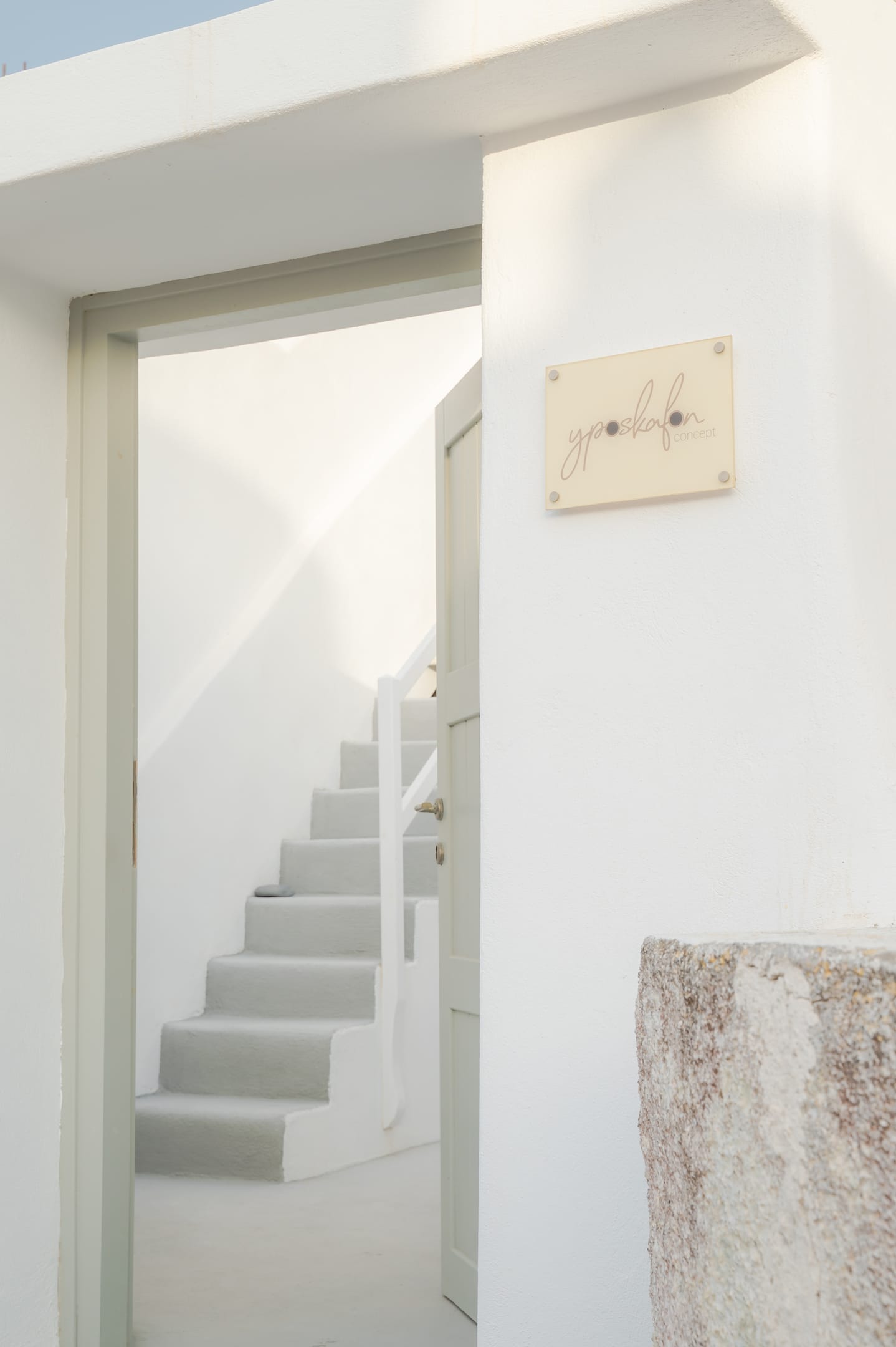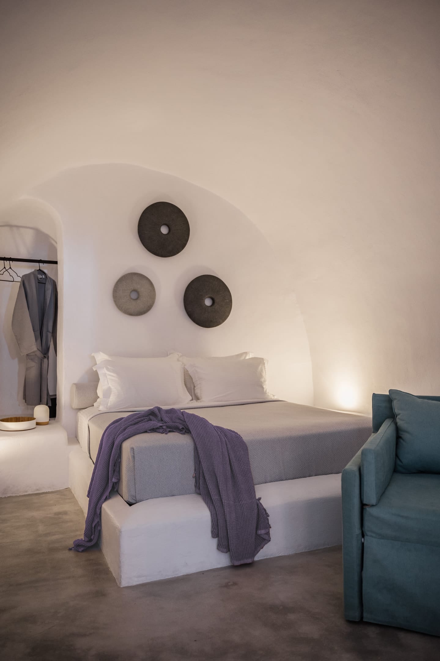 The spacious veranda and rooftop terrace open up to panoramic views of the caldera, the Aegean Sea, and Santorini’s iconic sunsets. The whitewashed, minimalist palette and curated amenities elevate both the aesthetic and the essence of the experience.