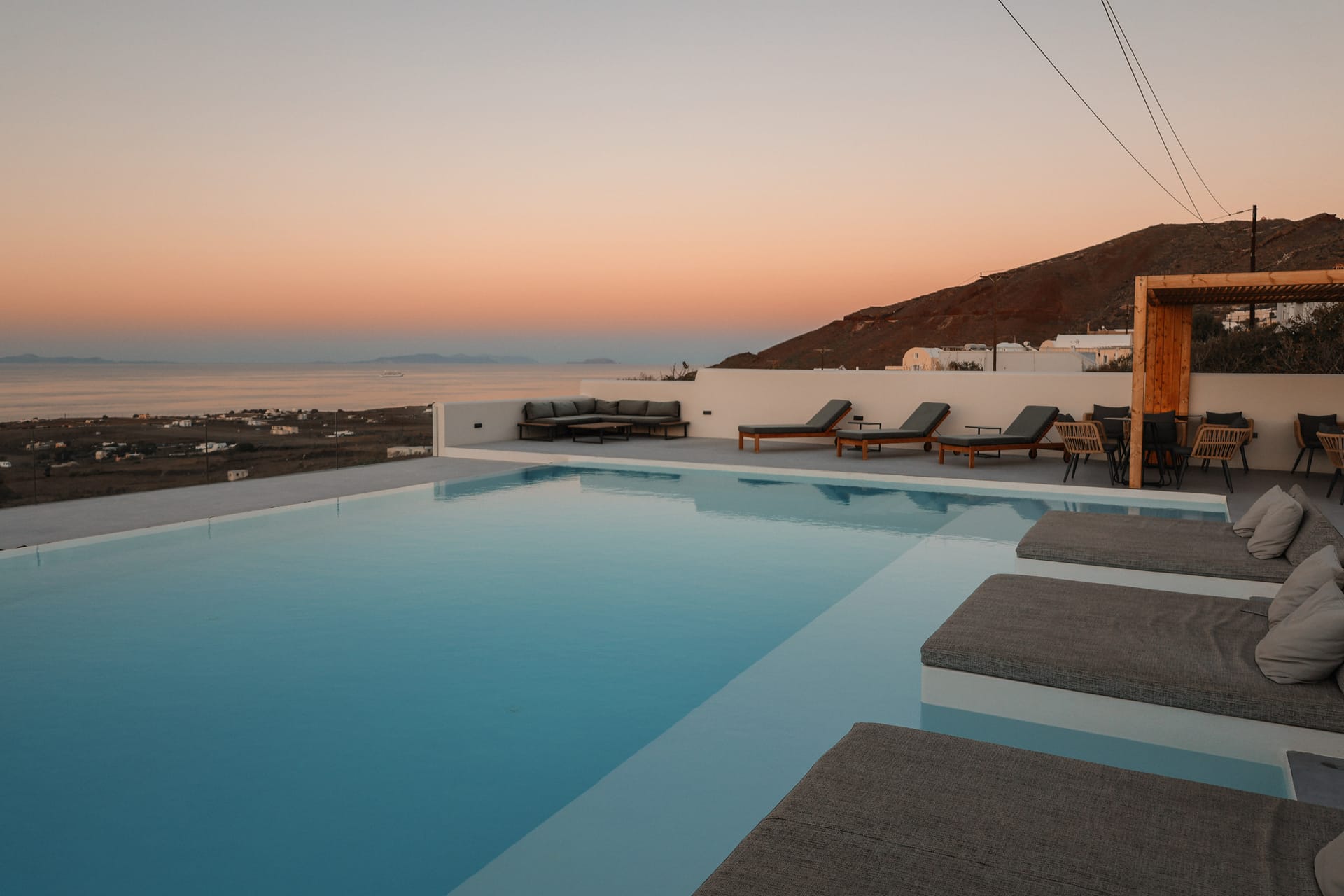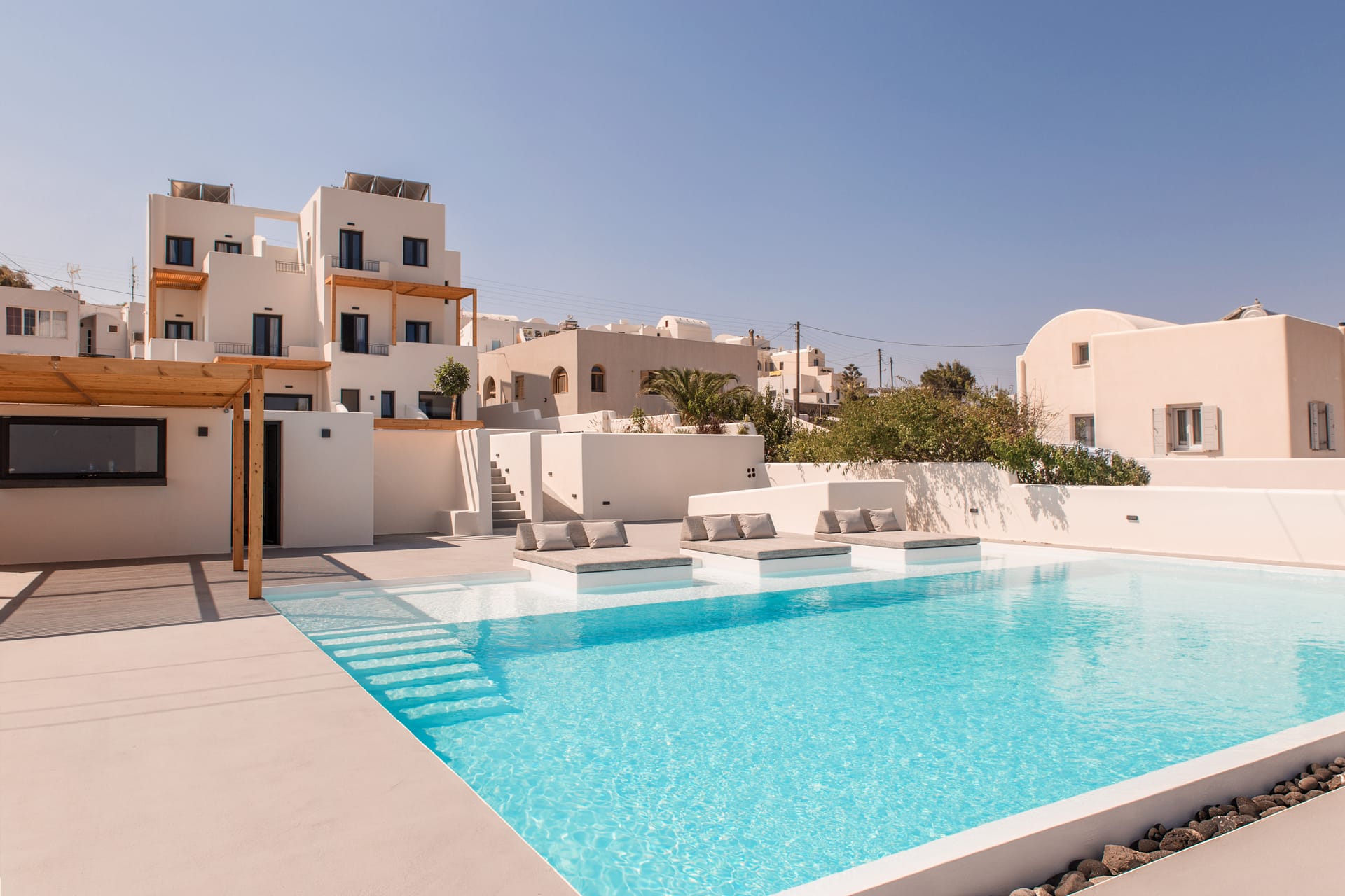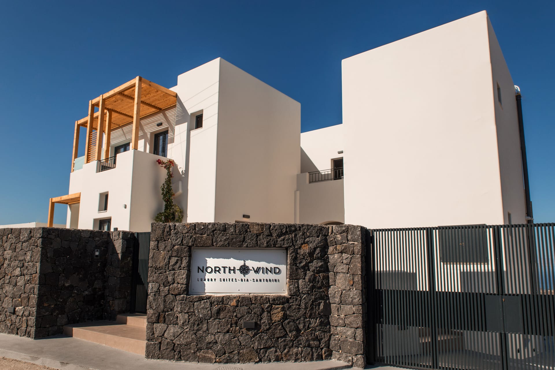 Each suite at Northwind is designed for comfort and privacy, featuring a private veranda and a hot tub. Guests can also relax by the pool and lounge area, which offers unobstructed views of the surrounding vineyards, the sea, and the famous Santorini sunsets. The hotel's location in the village of Oia provides a perfect balance of seclusion and accessibility, situated a short distance from the bustling main strip of the caldera and its iconic cliffside.