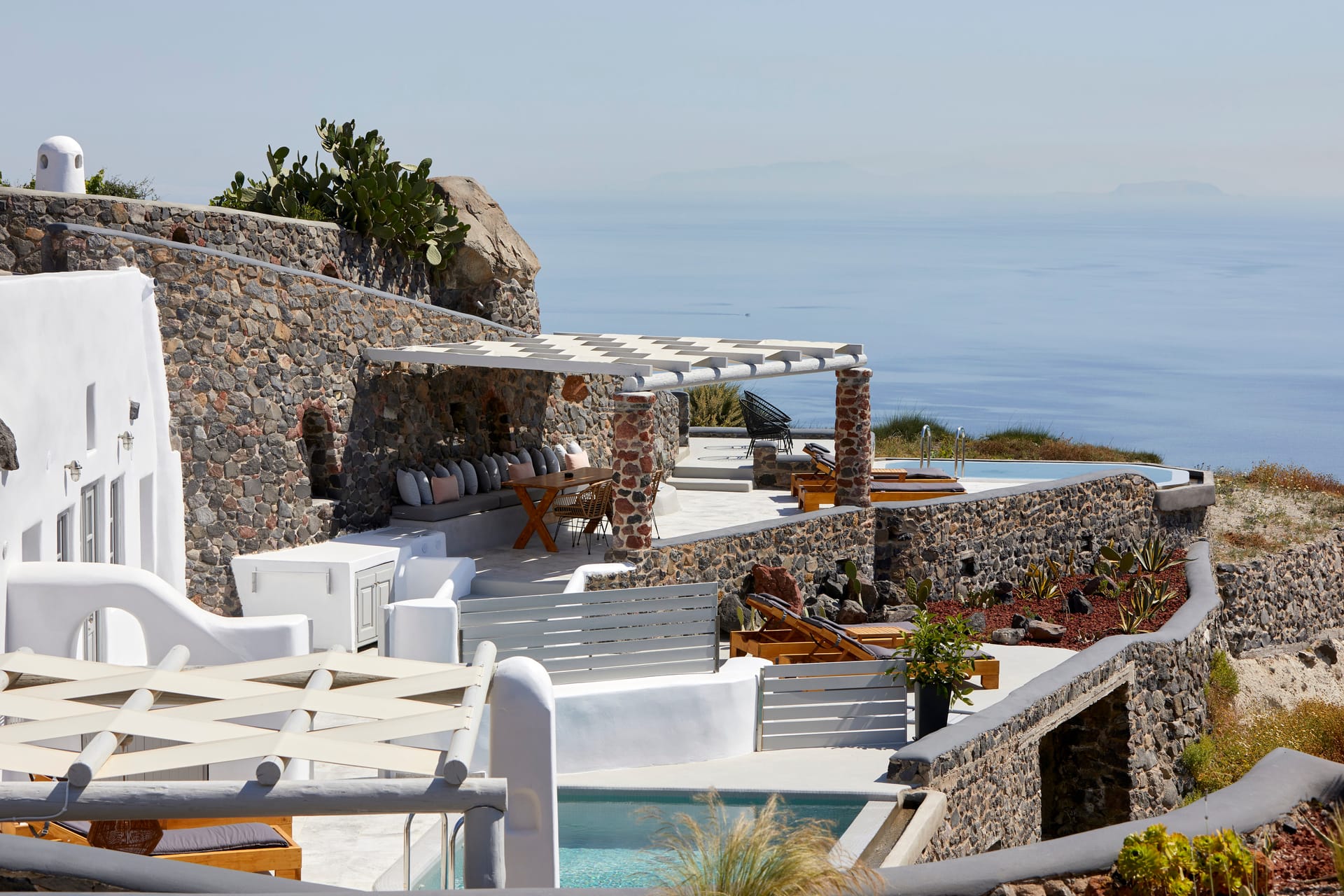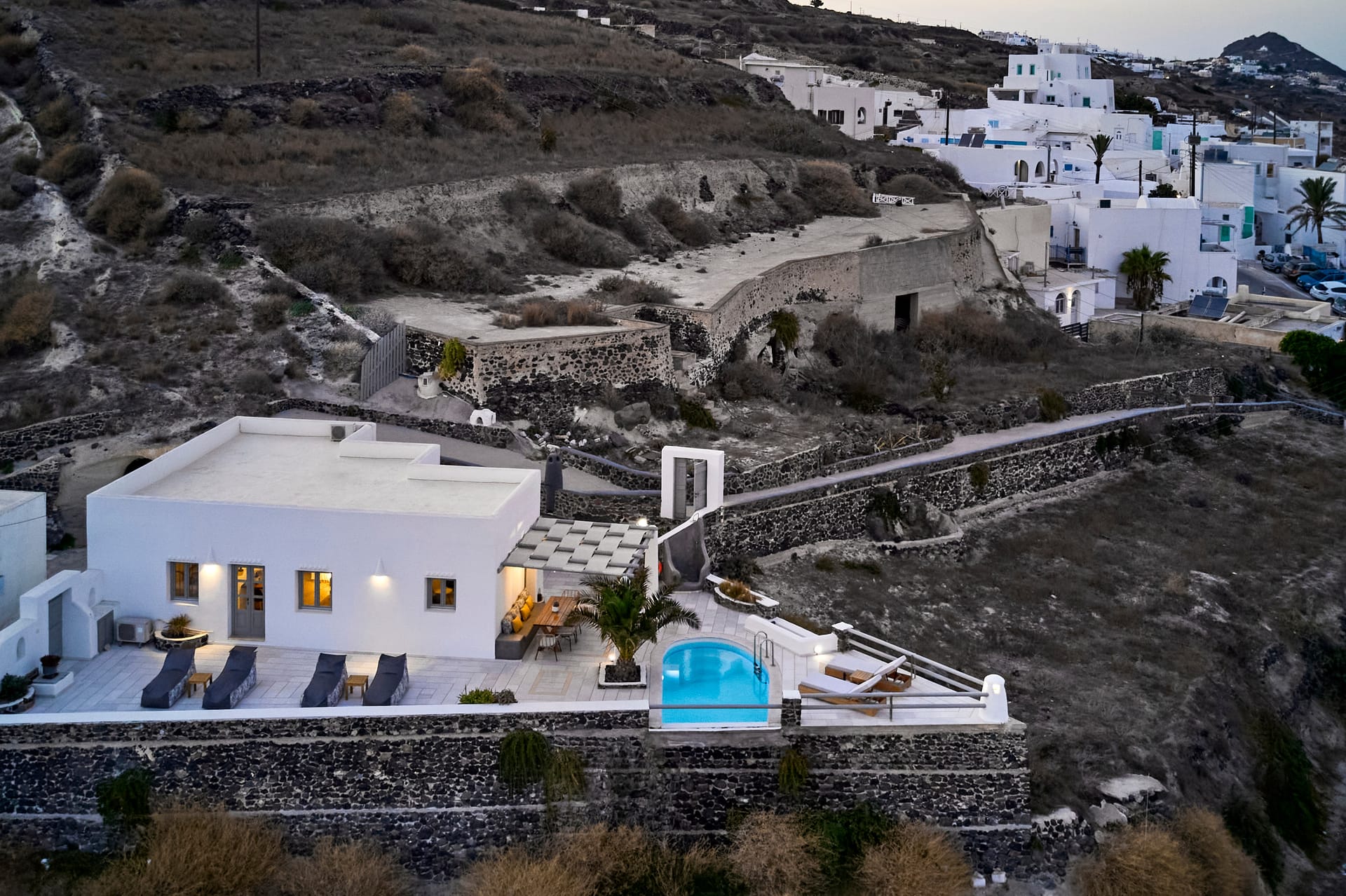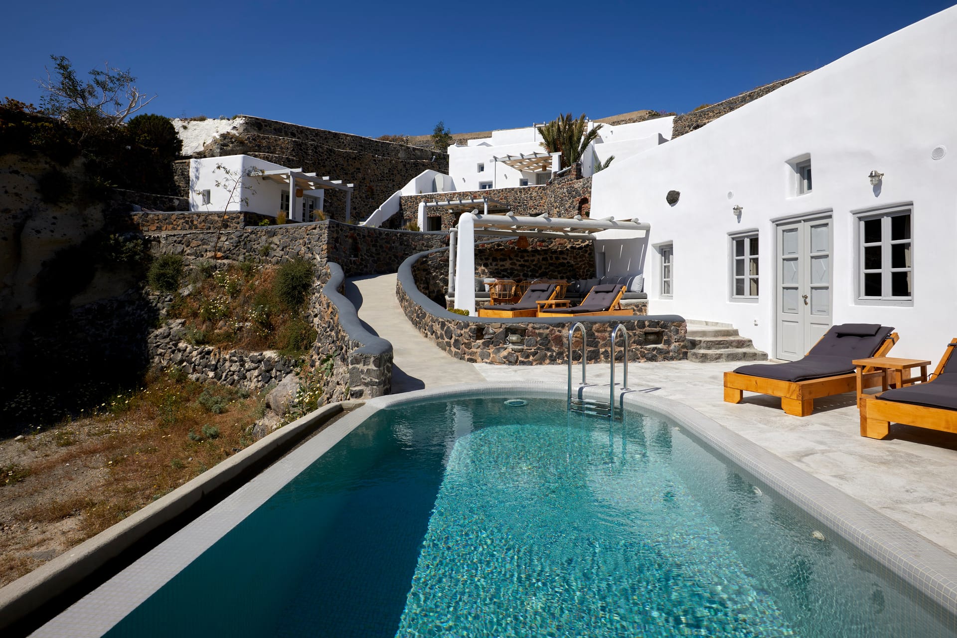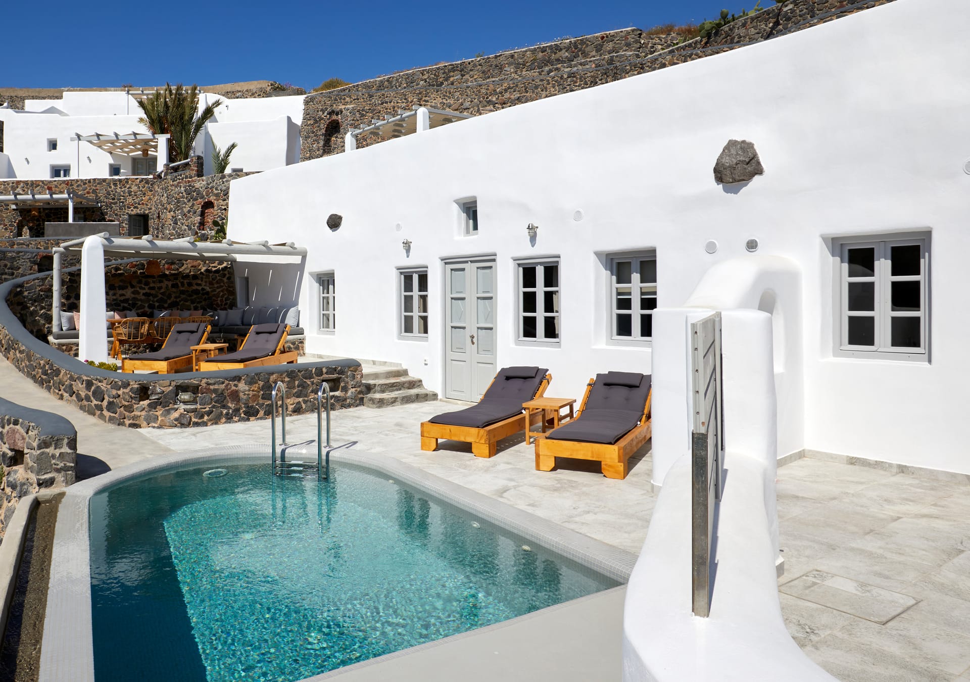 Traditionally built in an amphitheatrical location, they are fully equipped, with a minimal design featuring all wonderful elements of a sophisticated Cycladic aesthetic.