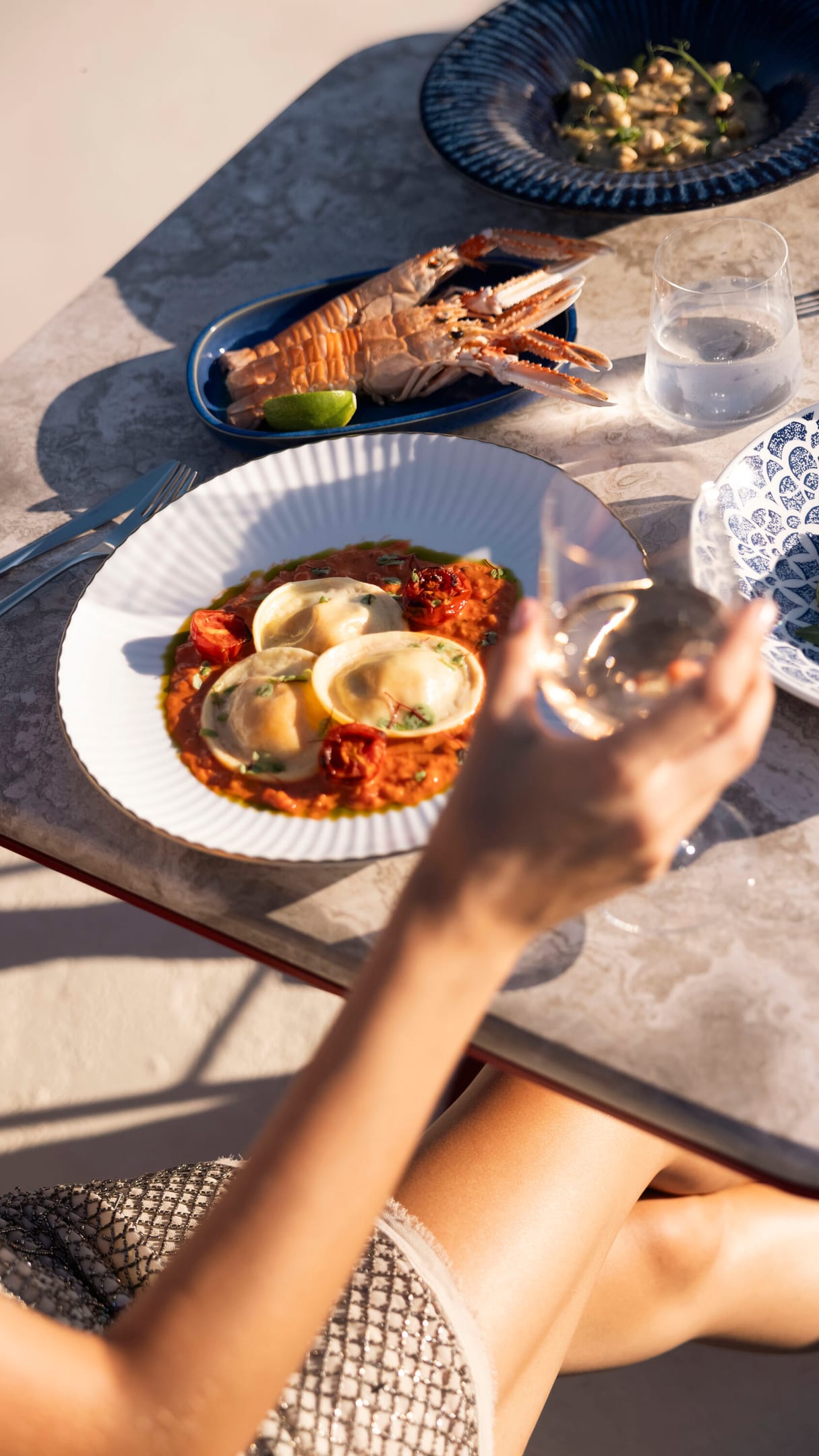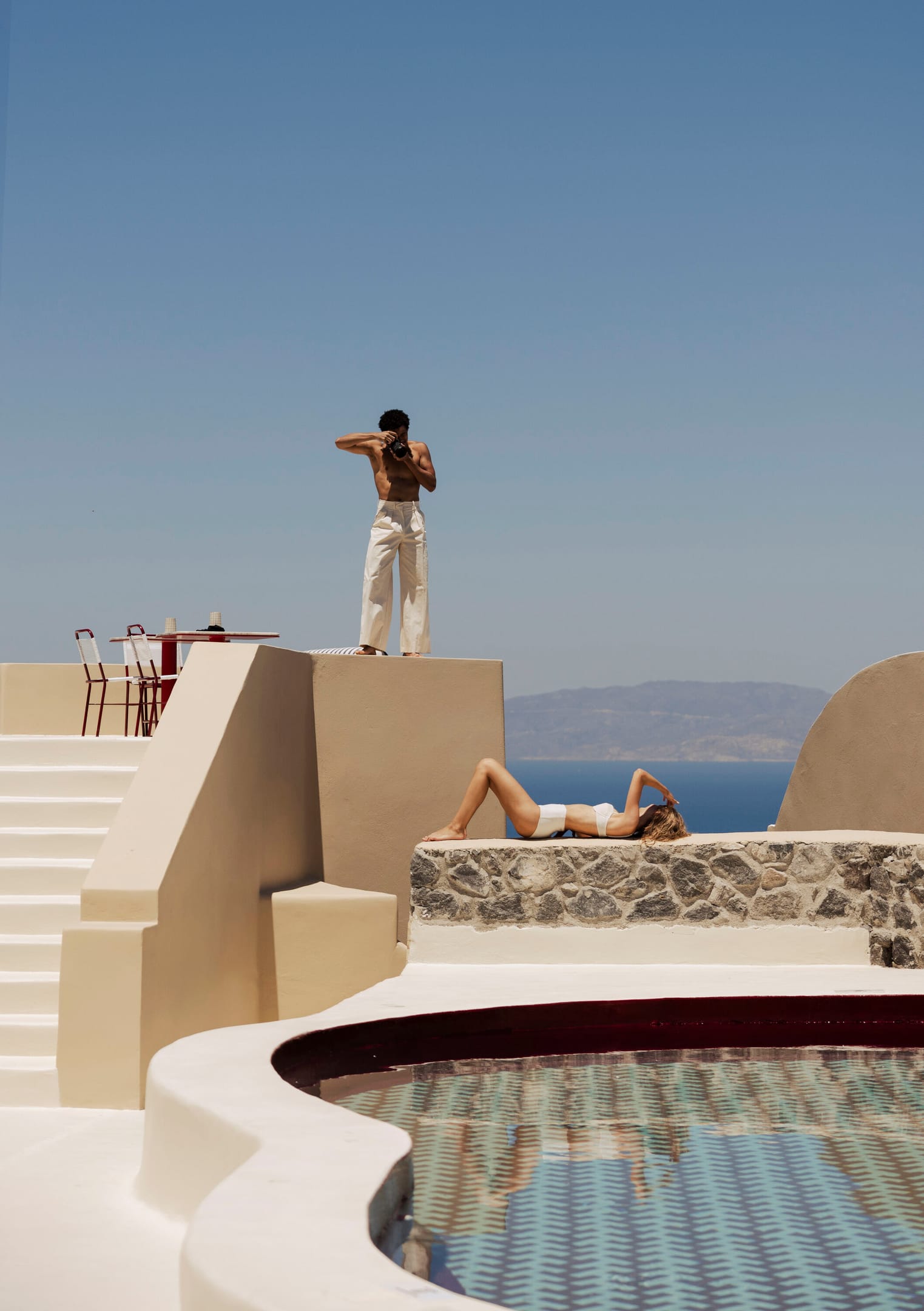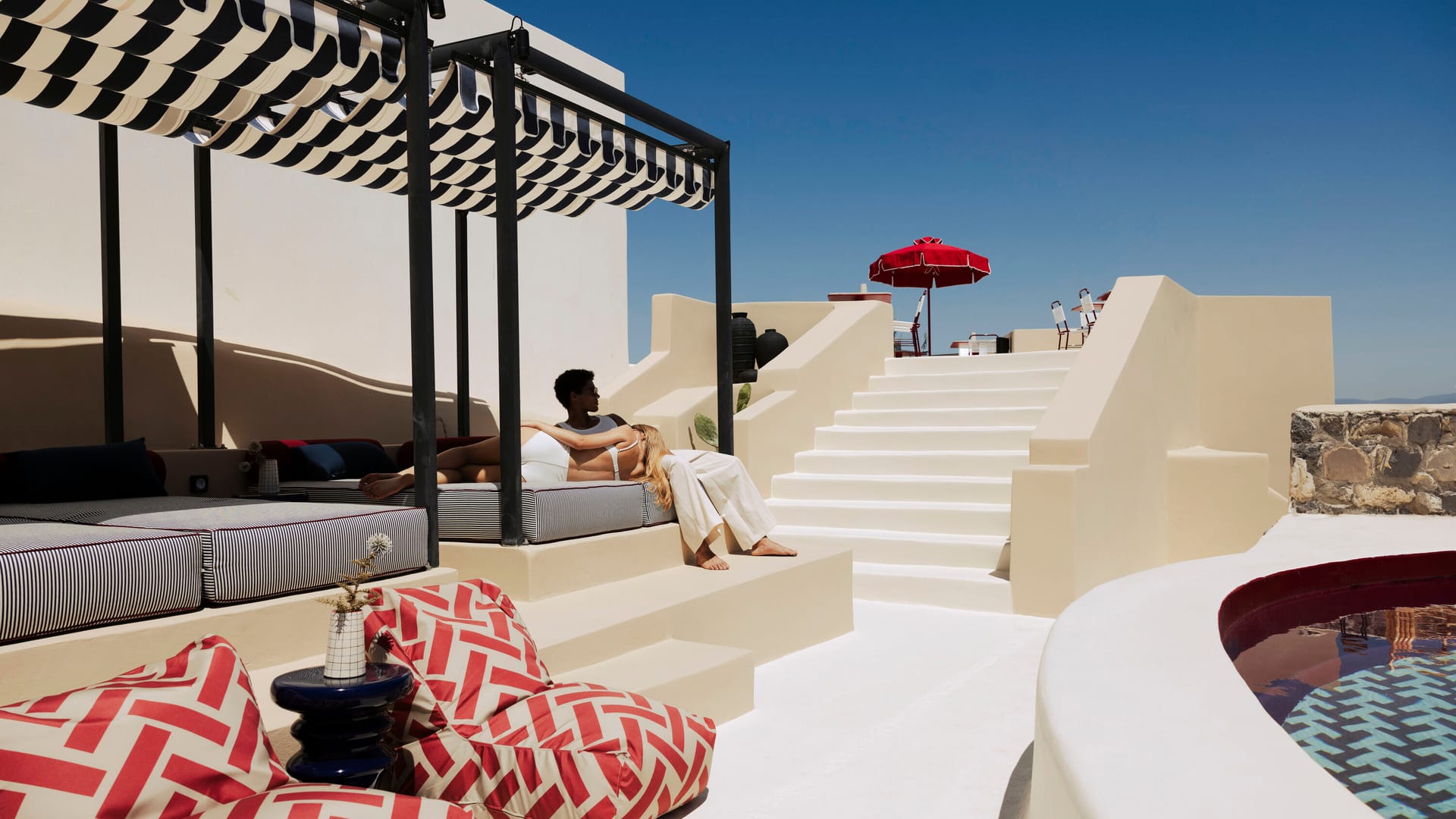 Carved cave suites and sea-facing rooms include options with kitchens, private terraces, lofts, or indoor Jacuzzis. Onsite features include a central pool, Antonino’s open-air Italian restaurant, Neema Boutique (resortwear by Greek and global designers), and a dedicated open air wellness space for yoga sessions.