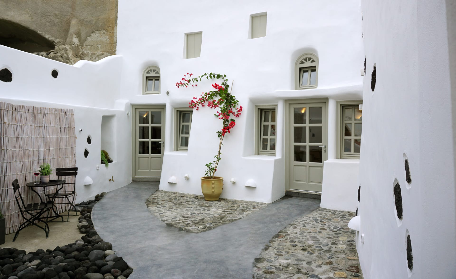 "Niso Cave Suites" is located in Megalochori, Santorini, Greece. It is consisted of 3 suites with a common patio. The suite "Meliti" can accommodate up to 5 guests and has an idoor jacuzzi. The suite "Erato" can accommodate up to 4 guests and has an idoor jacuzzi, too. The 3rd suite is "Spio" with an outdoor jacuzzi, which has capacity of 2 guests.