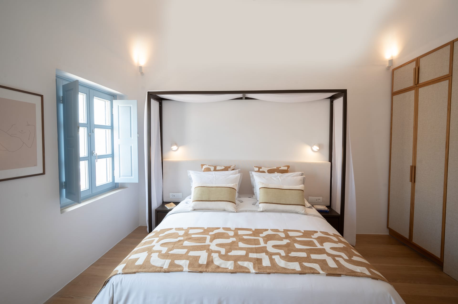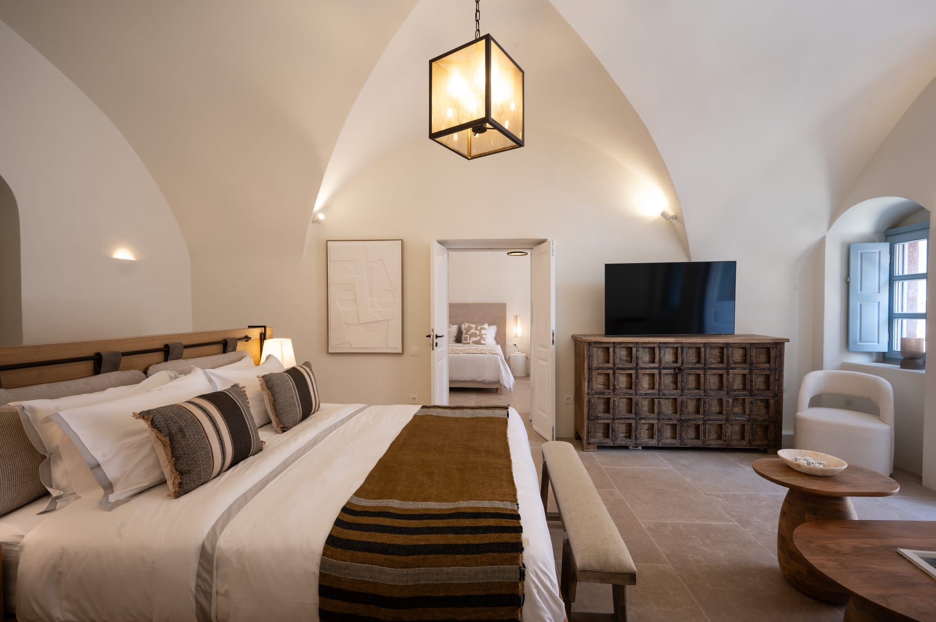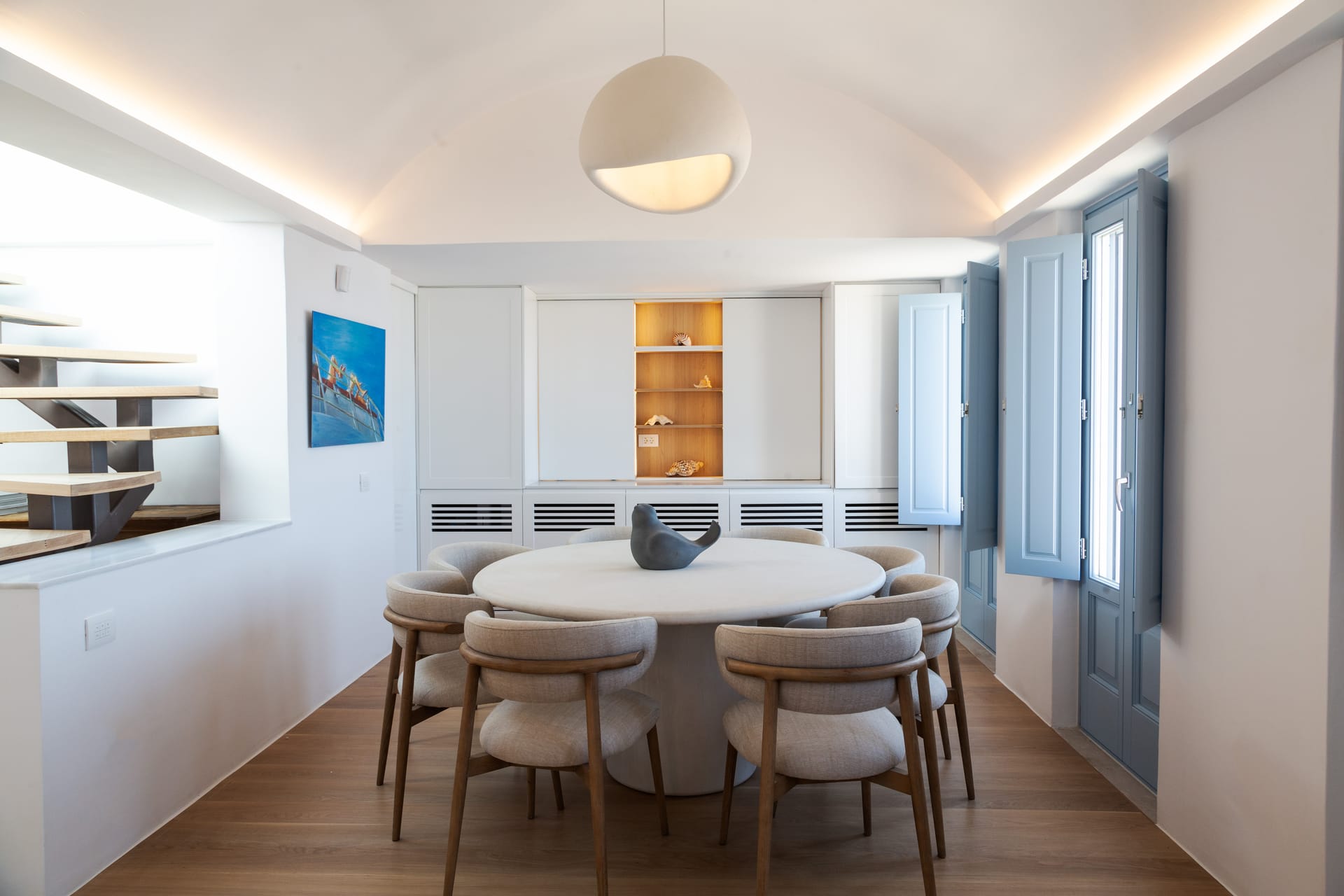 Bestowed with the distinction of a “cultural heritage building,” Villa Oro stands as a stunning example of a traditional 'captain house', where timeless elegance meets modern refinement. Its ornate facades, grand high cross-vaulted ceilings, and meticulously restored details pay tribute to Santorini’s rich maritime history and the legacy of the island’s esteemed shipowners / captains.