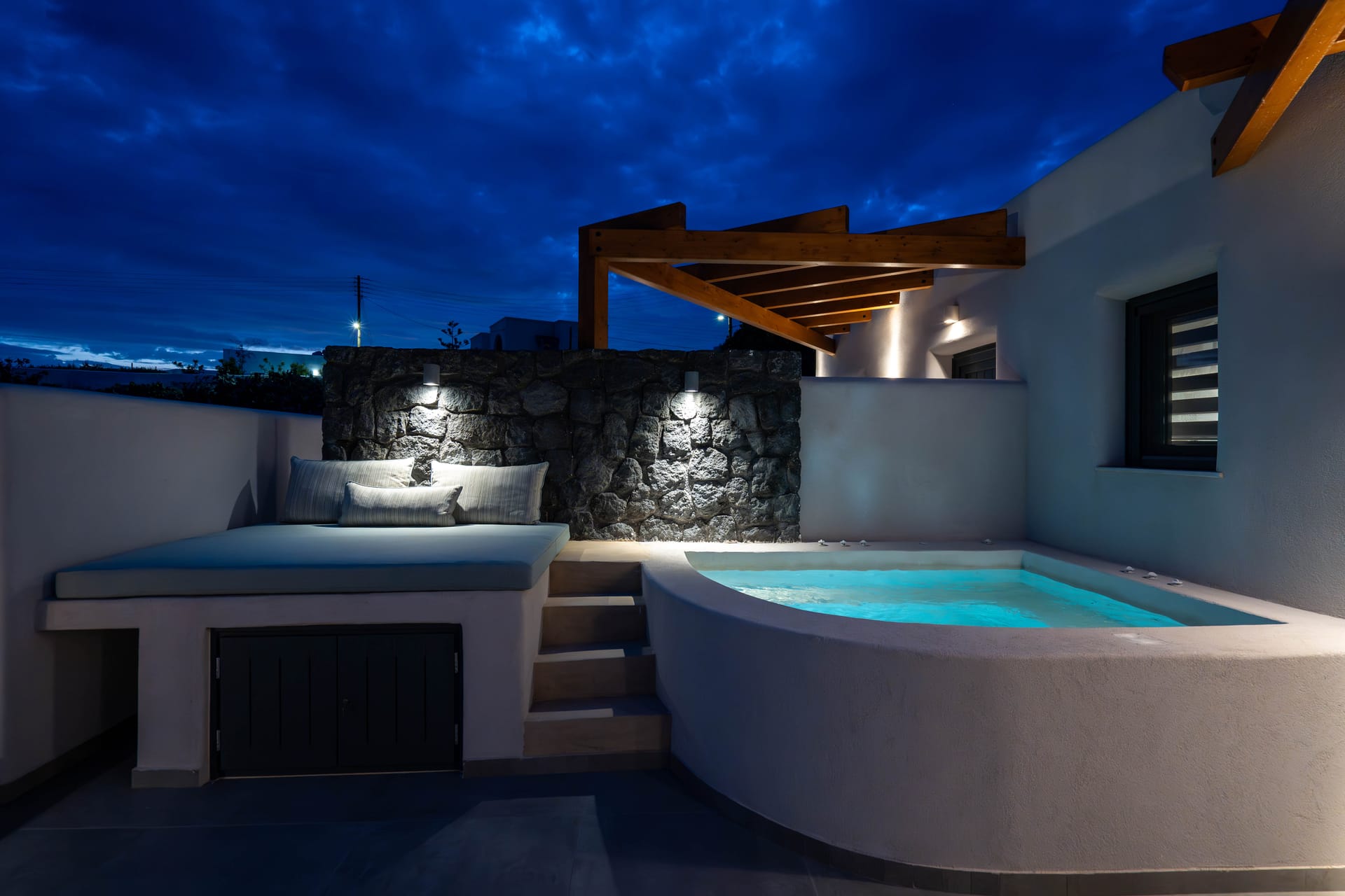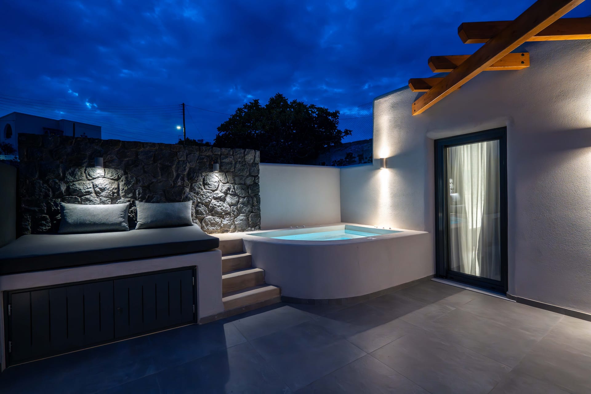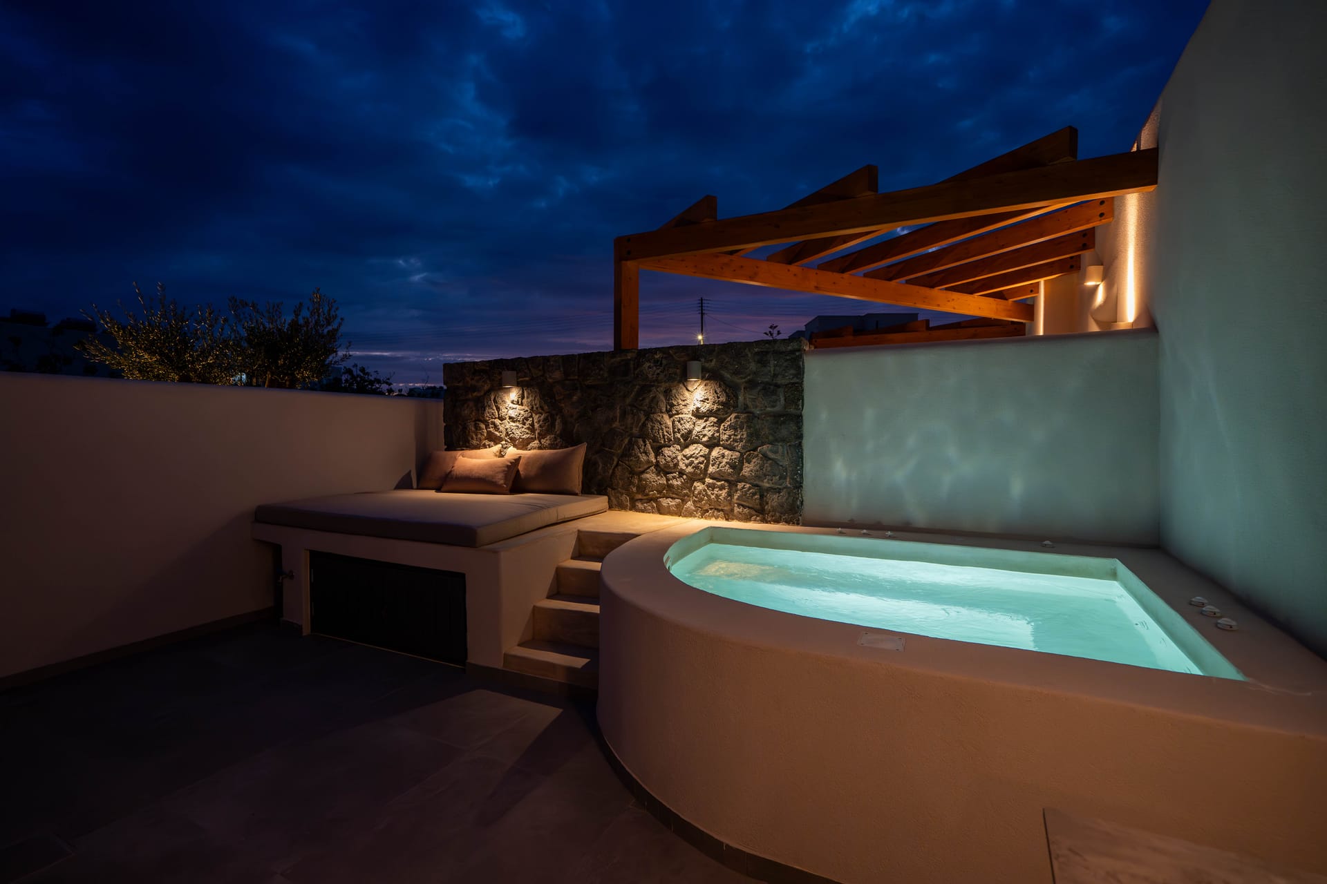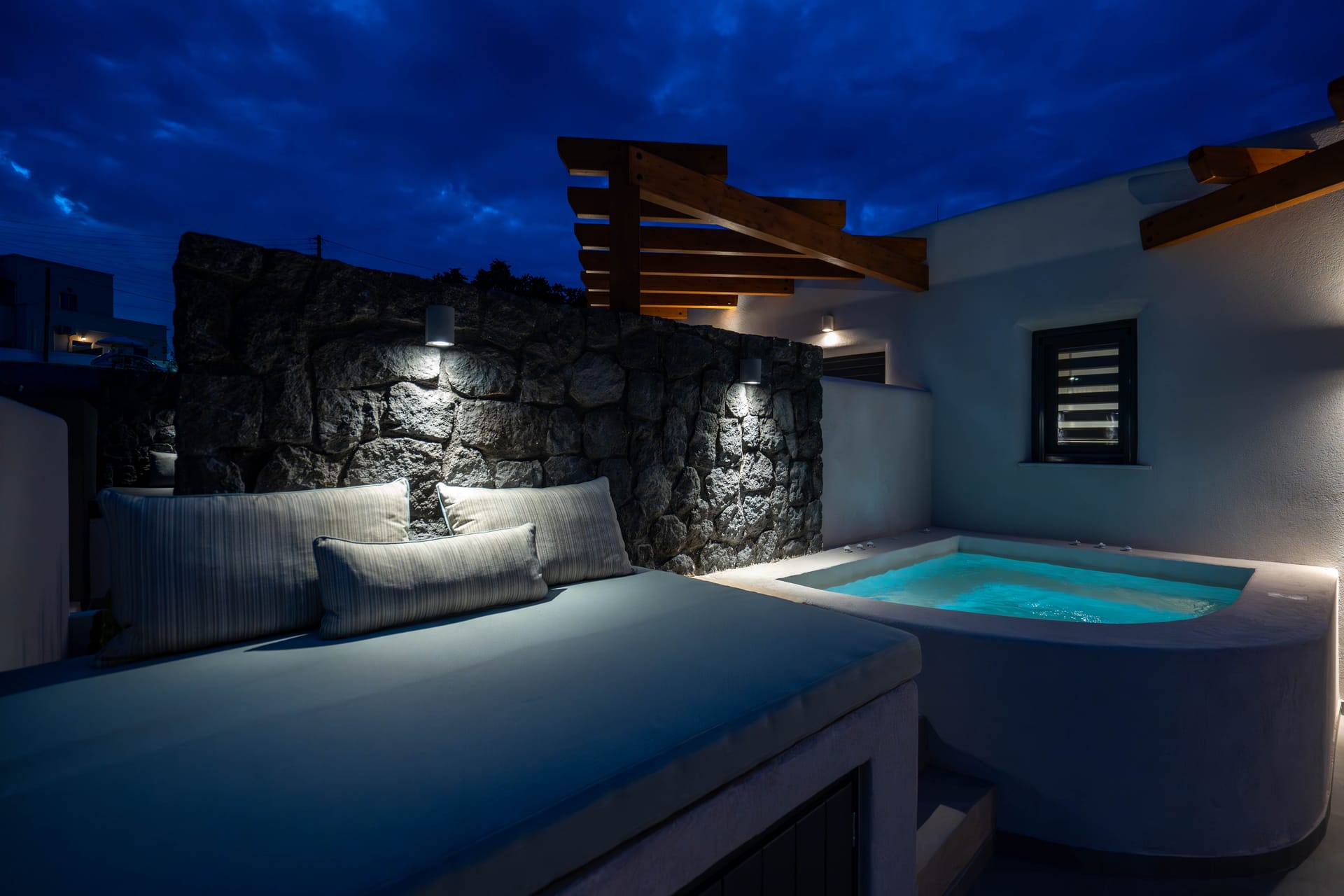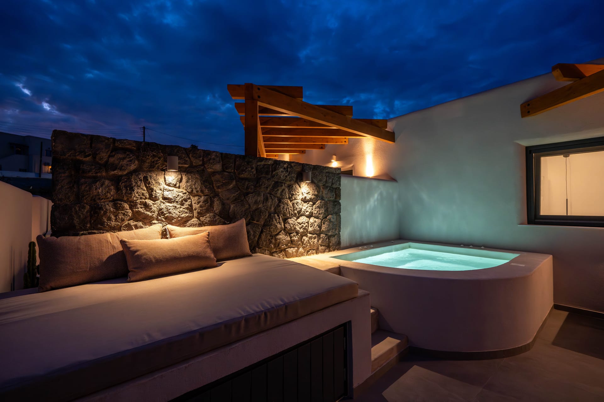 Each suite features a bedroom, dining area, kitchenette, living room, and a balcony with a private jacuzzi. The property also offers a shared pool.