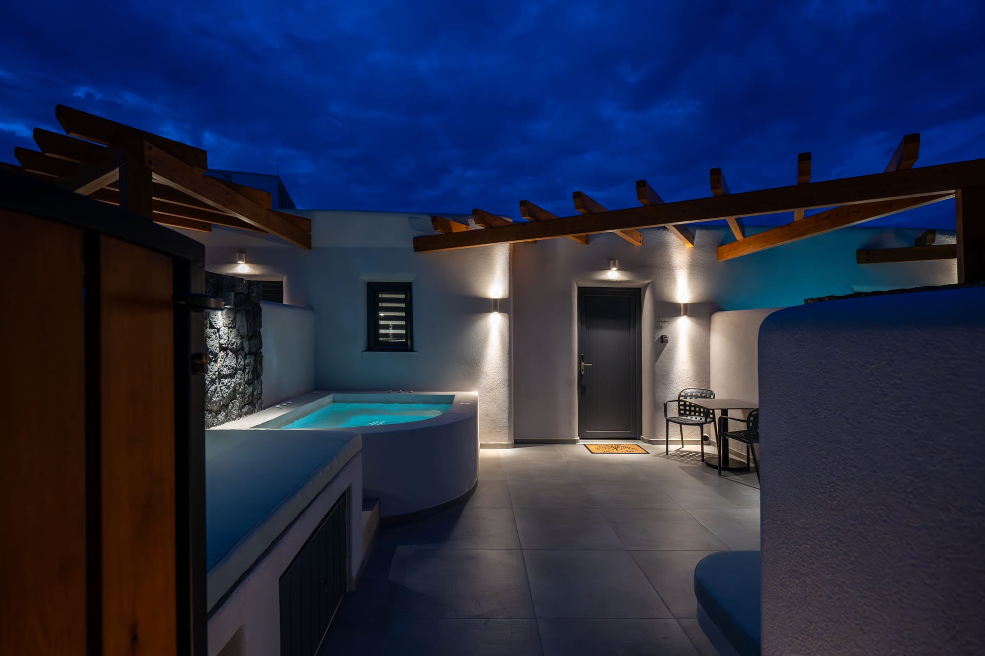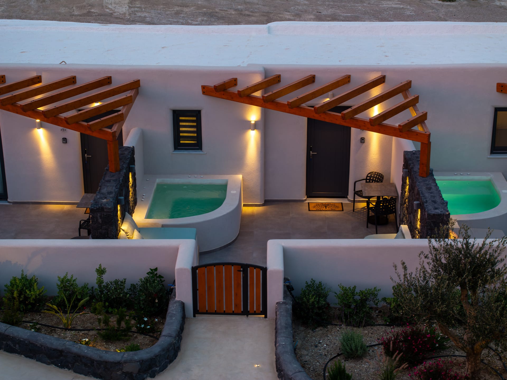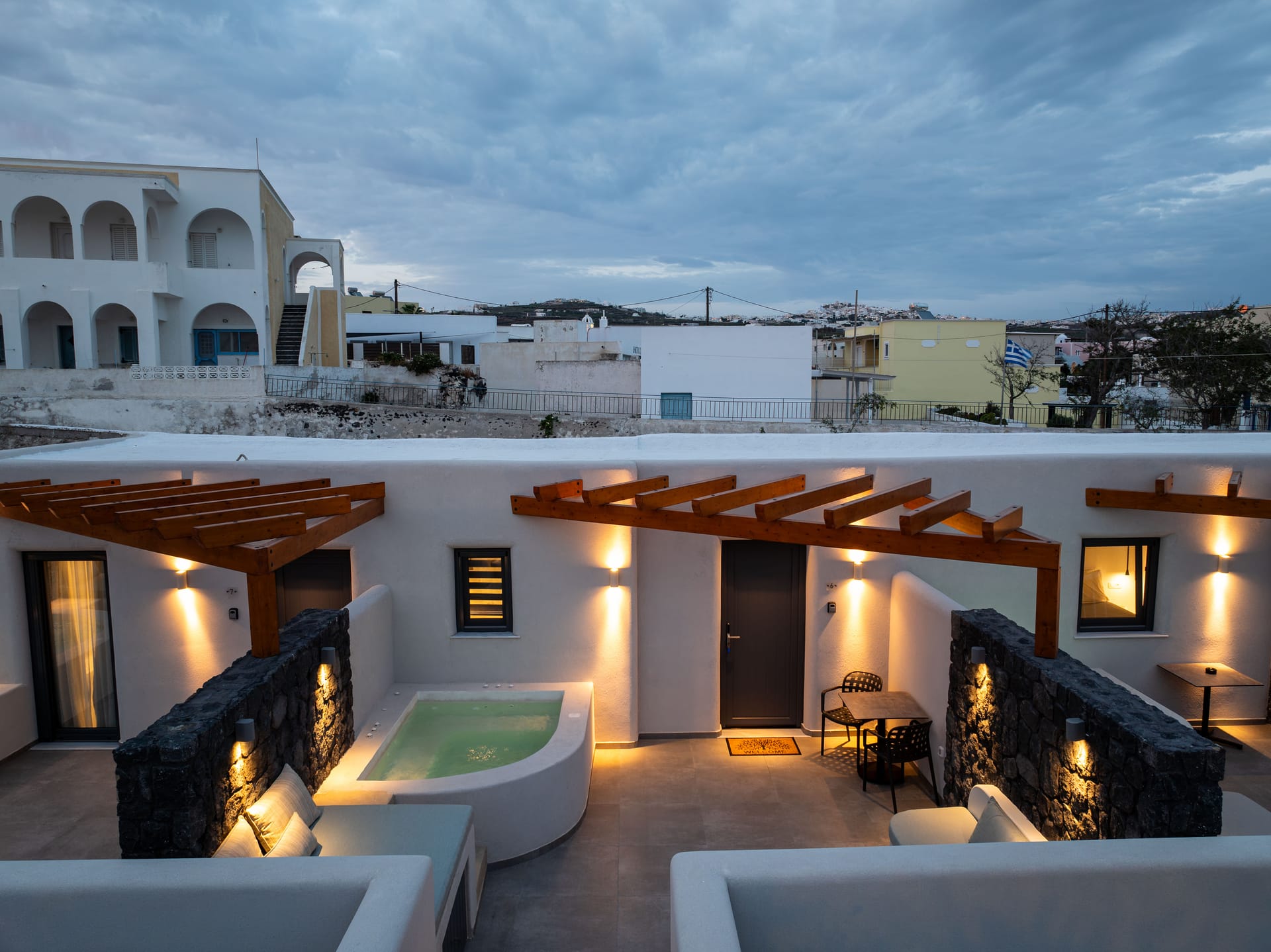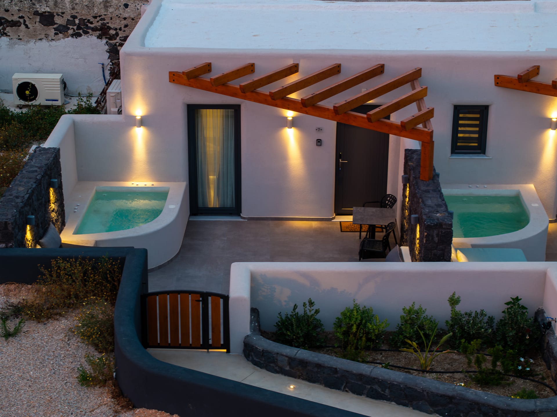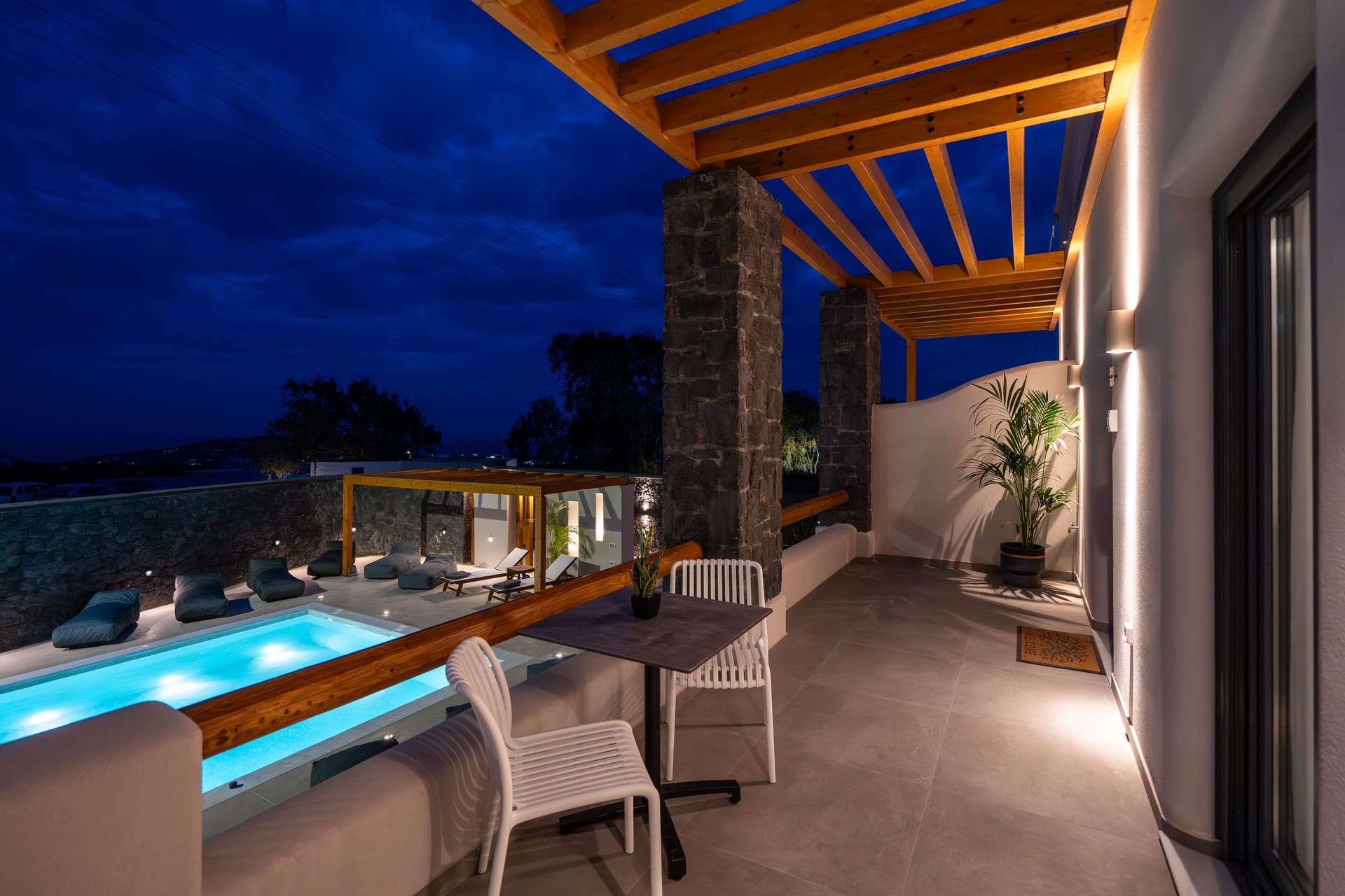 Each suite features a bedroom, dining area, kitchenette, living room, and a balcony with a private jacuzzi. The property also offers a shared pool.