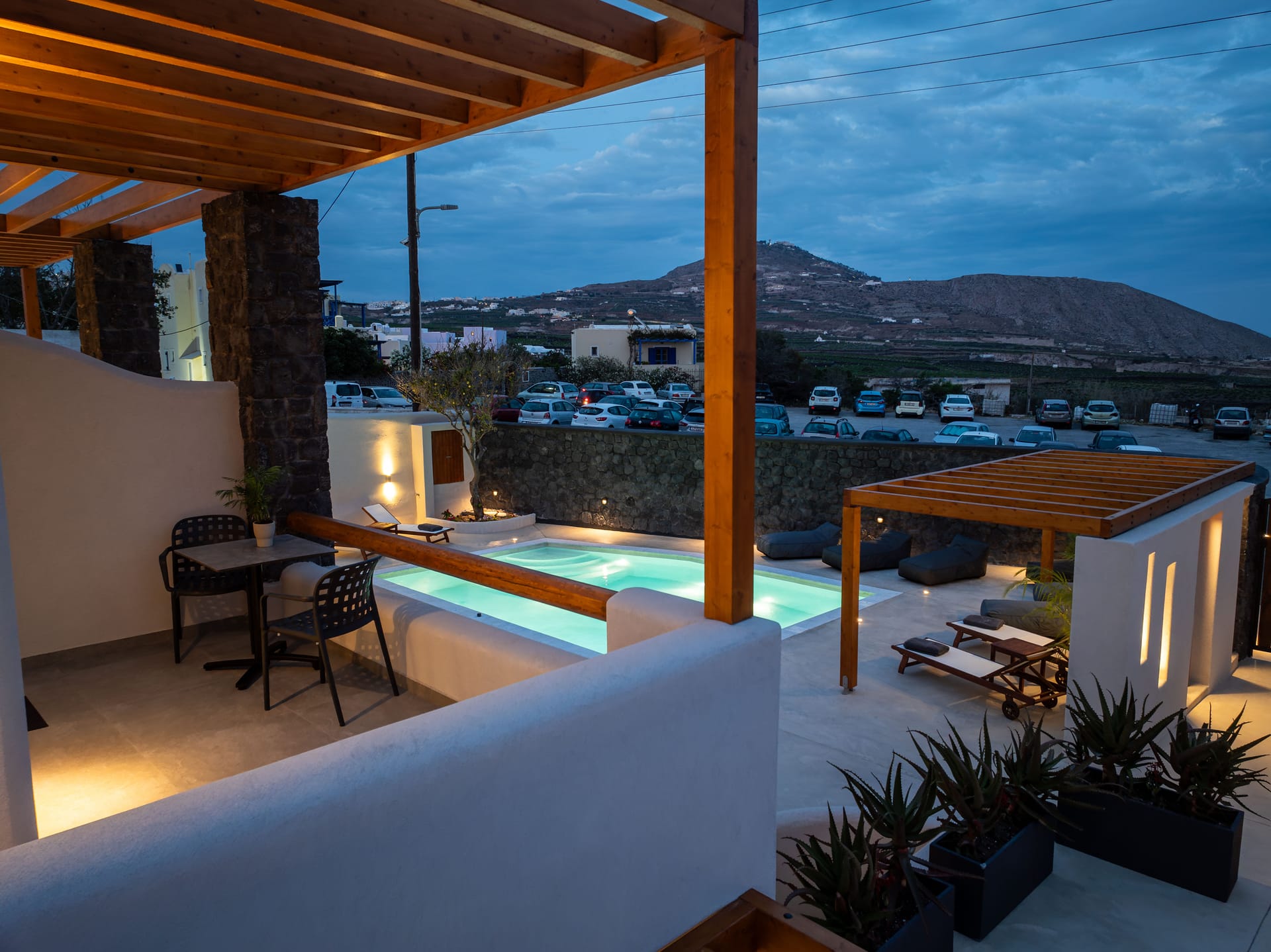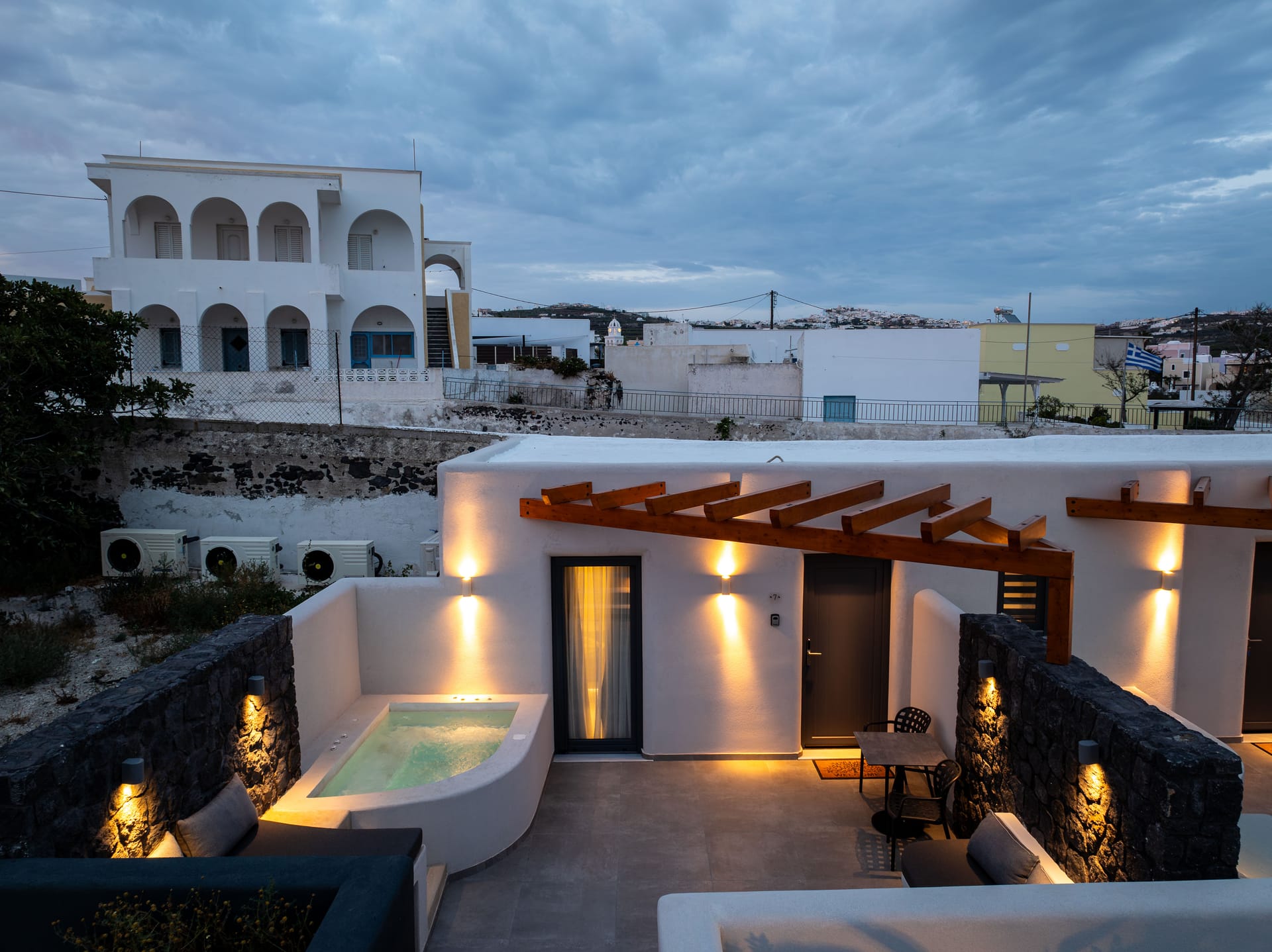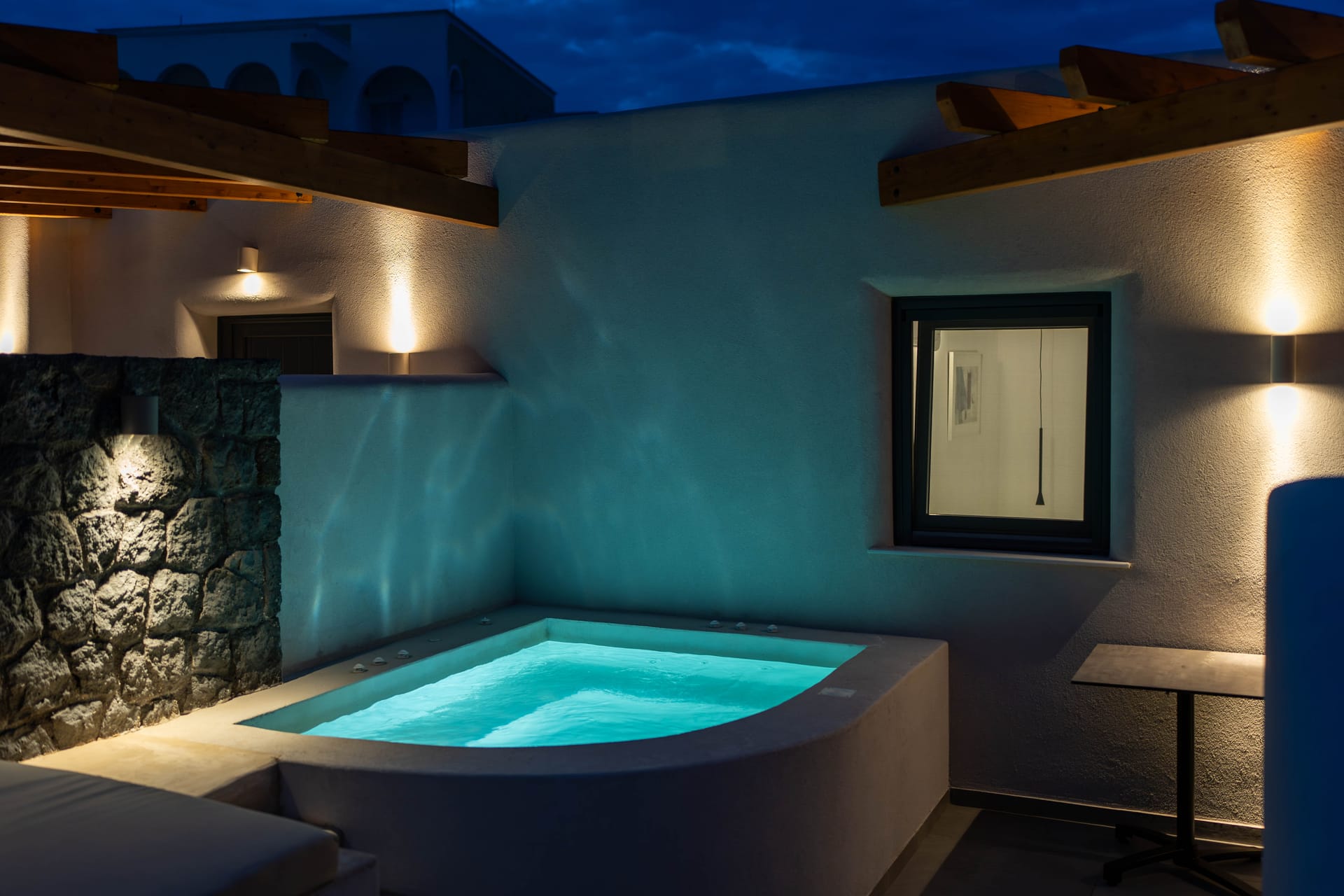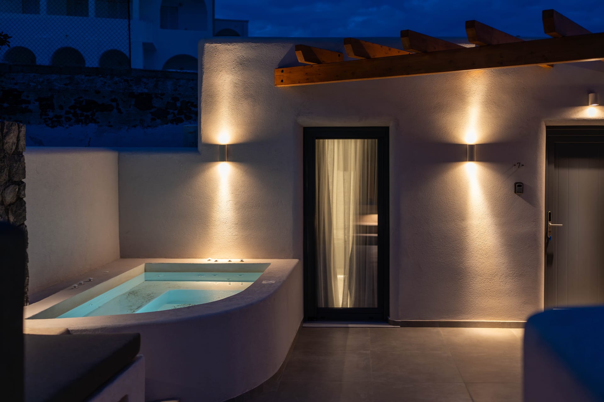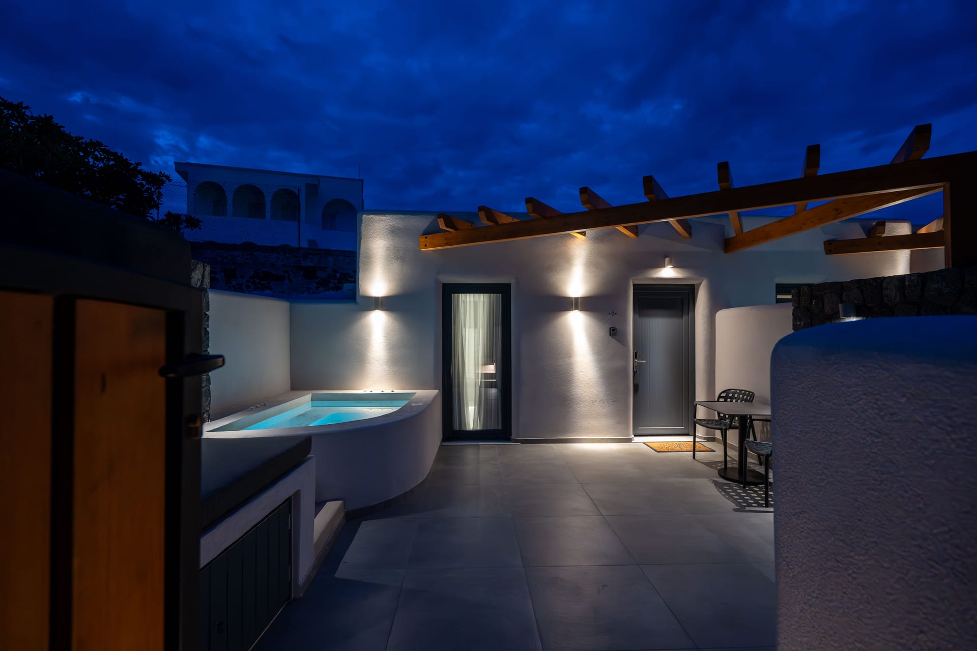 Each suite features a bedroom, dining area, kitchenette, living room, and a balcony with a private jacuzzi. The property also offers a shared pool.