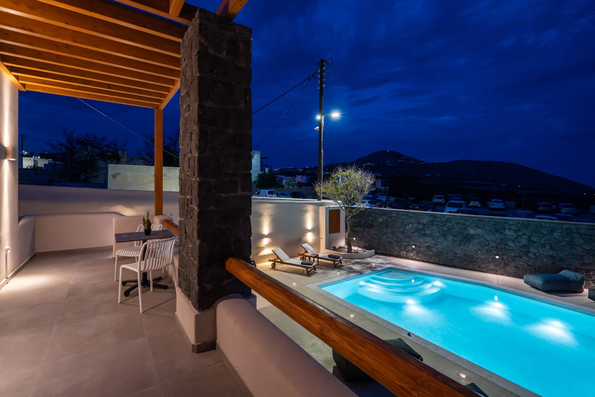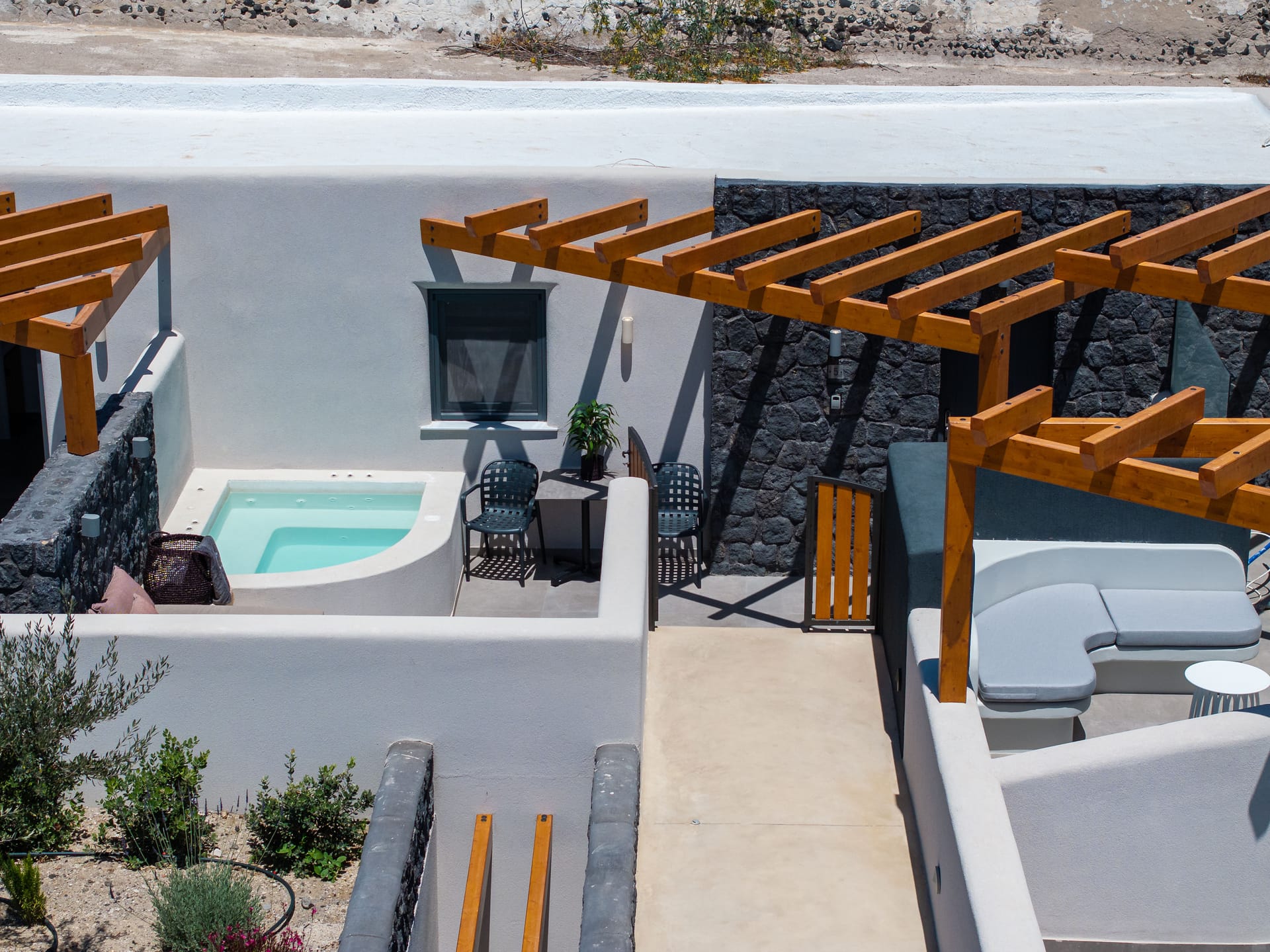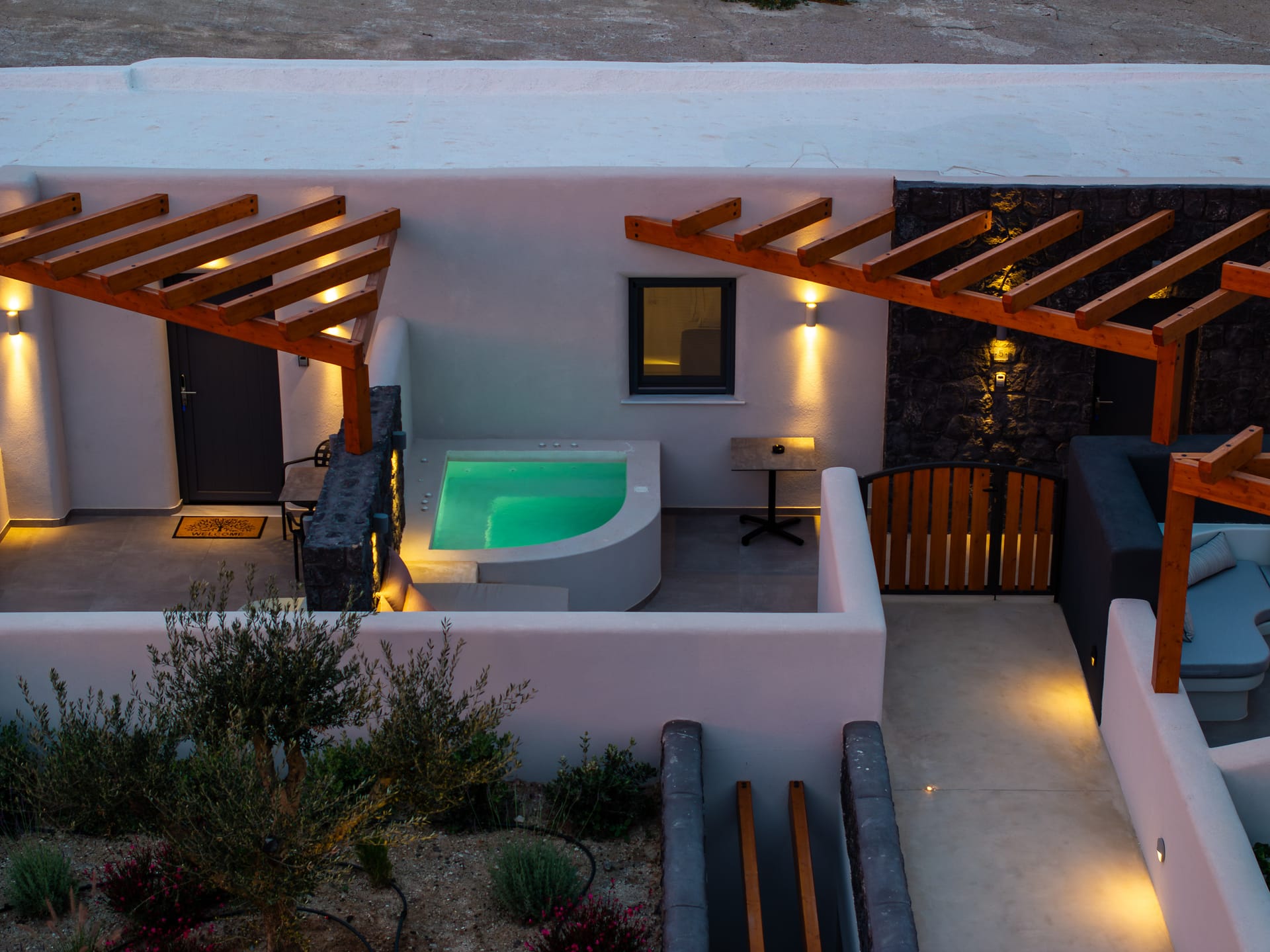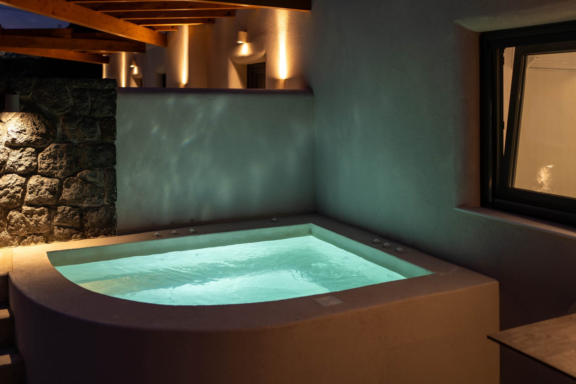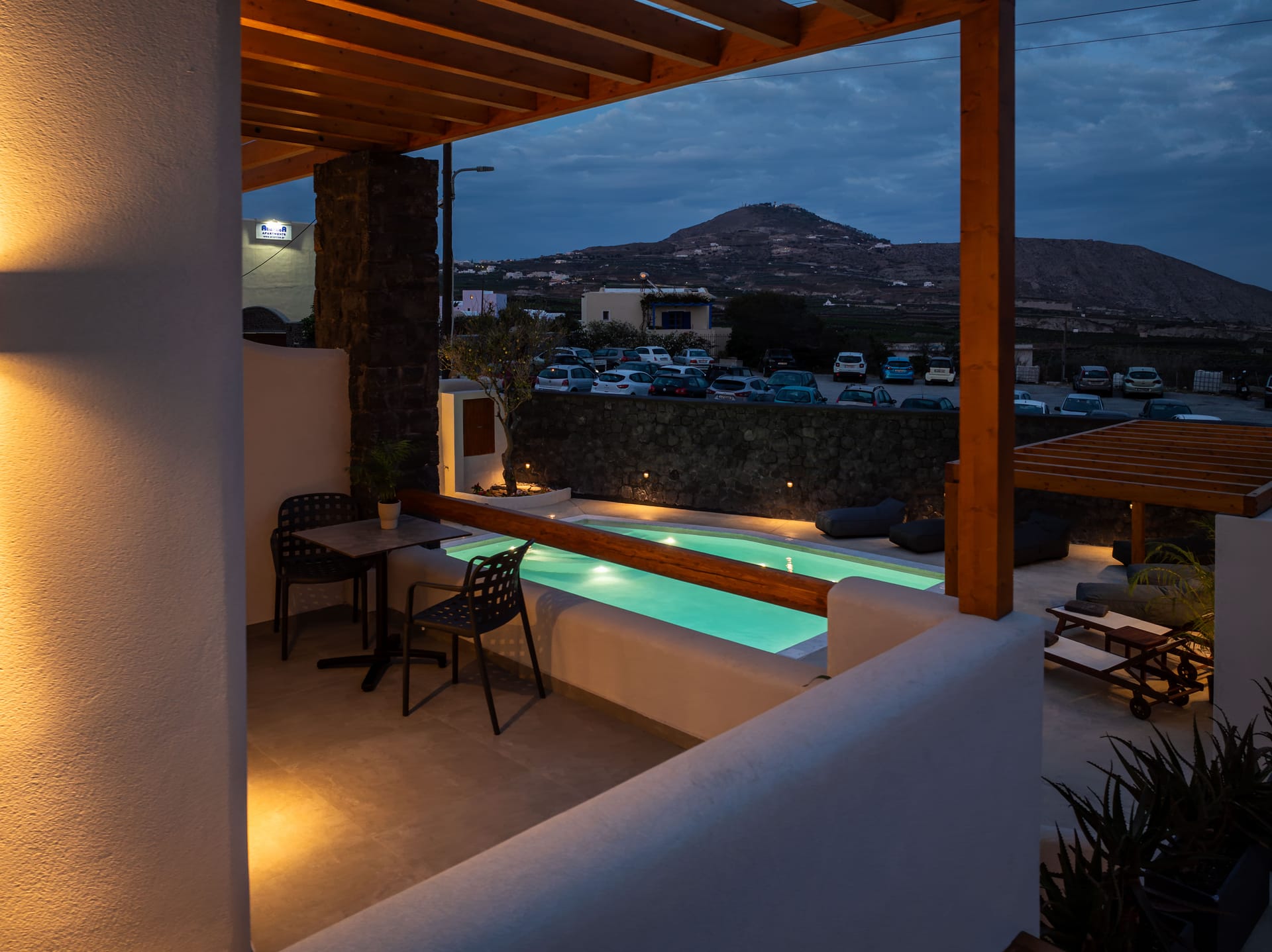 Each suite features a bedroom, dining area, kitchenette, living room, and a balcony with a private jacuzzi. The property also offers a shared pool.
