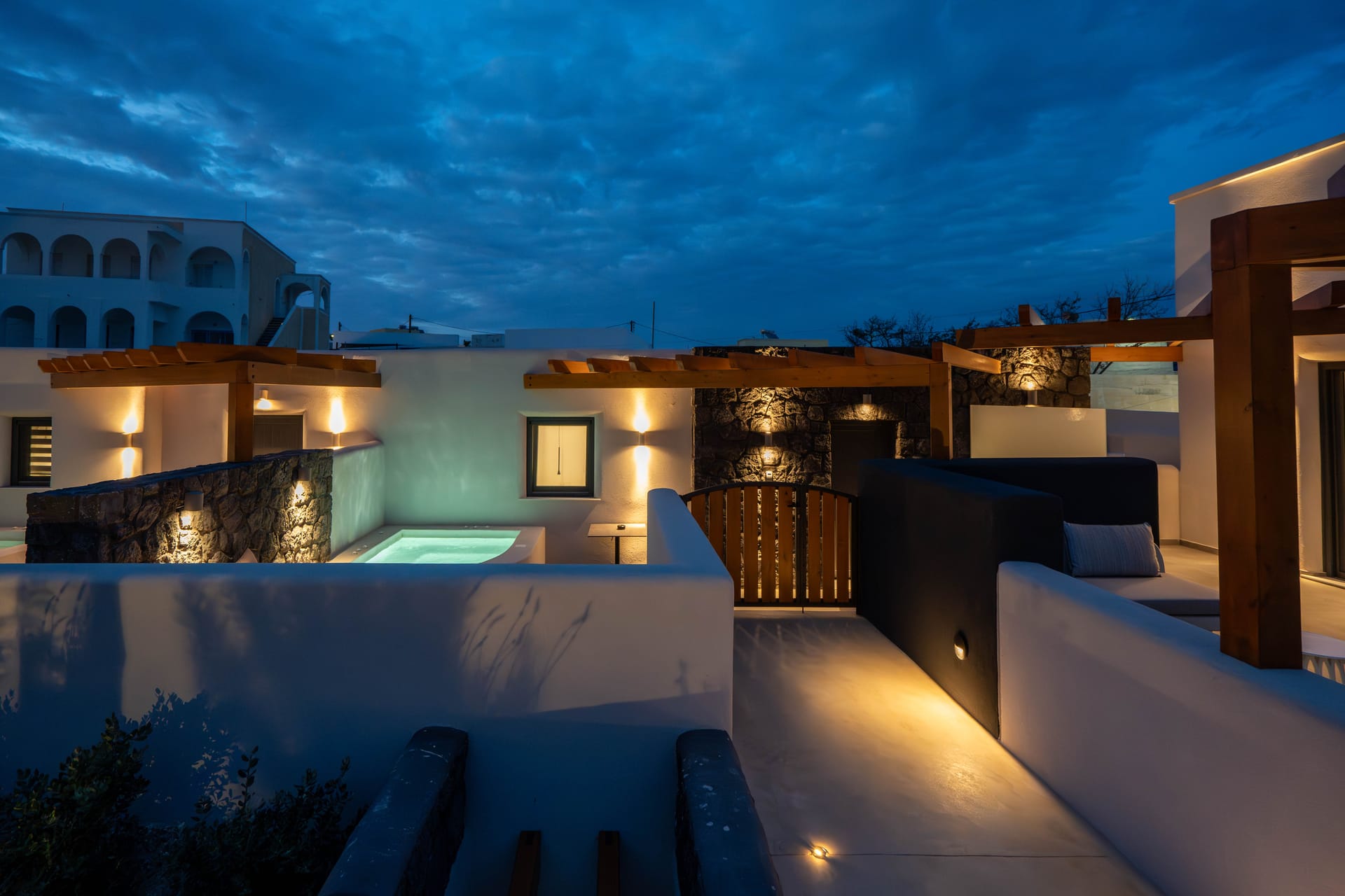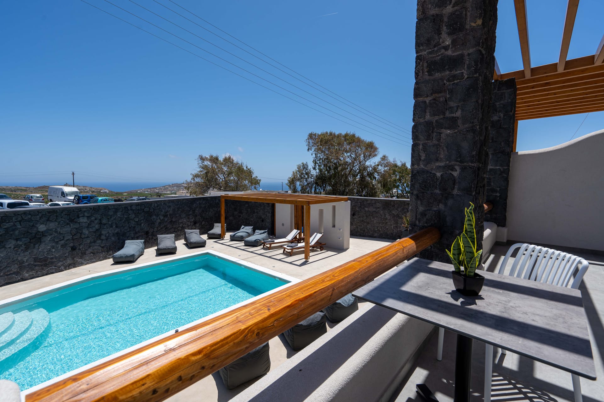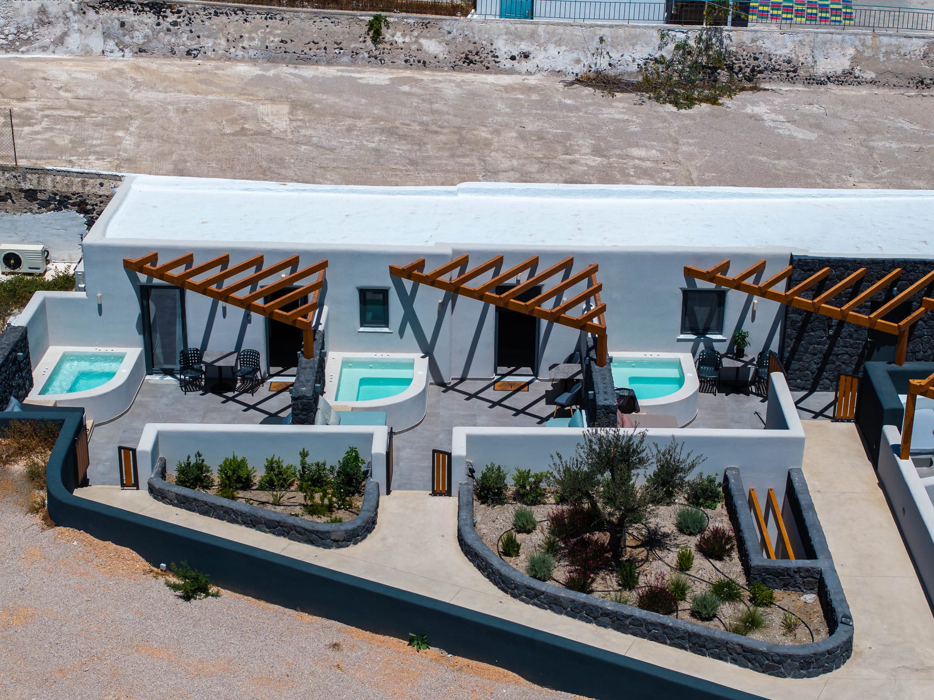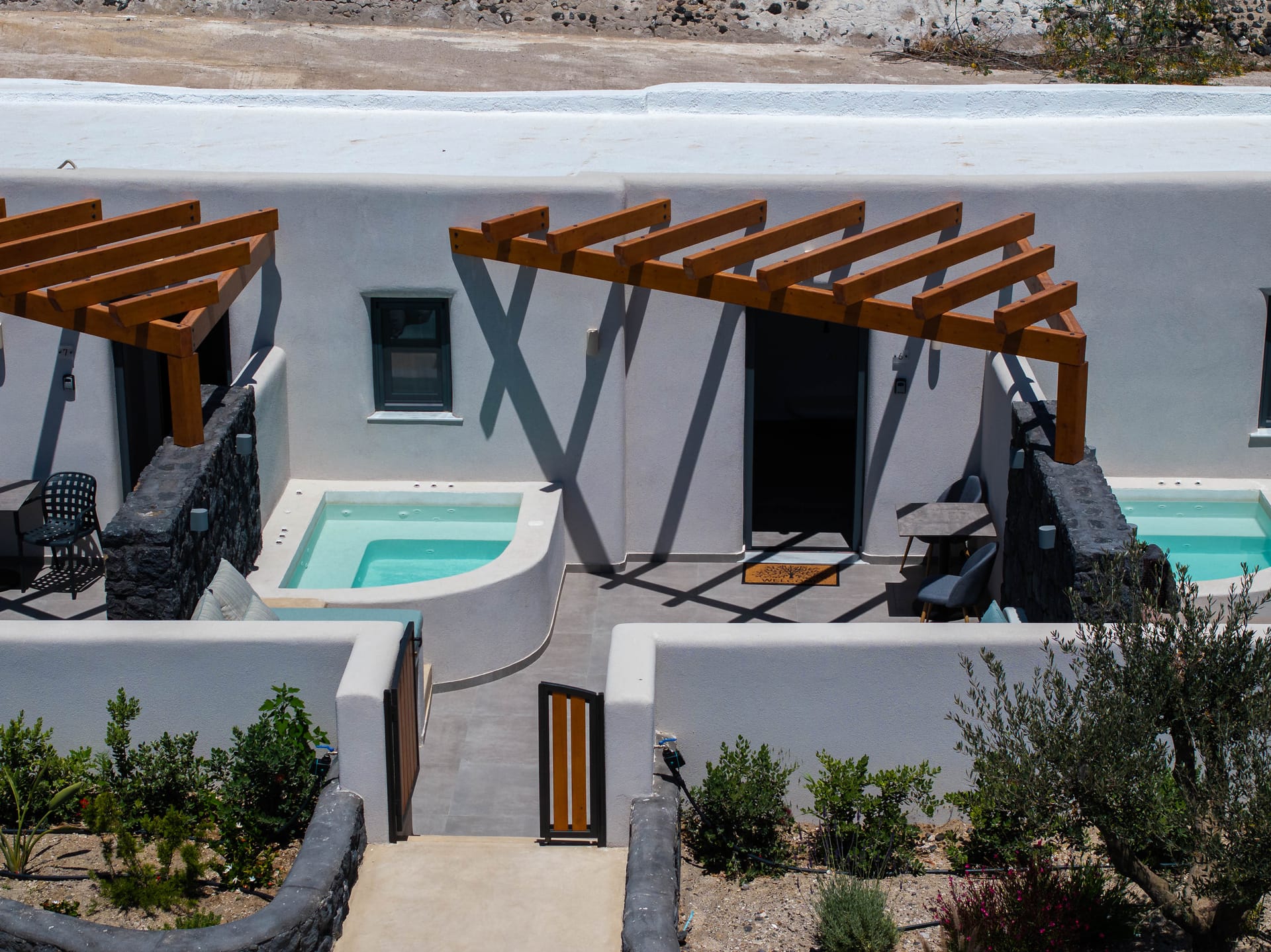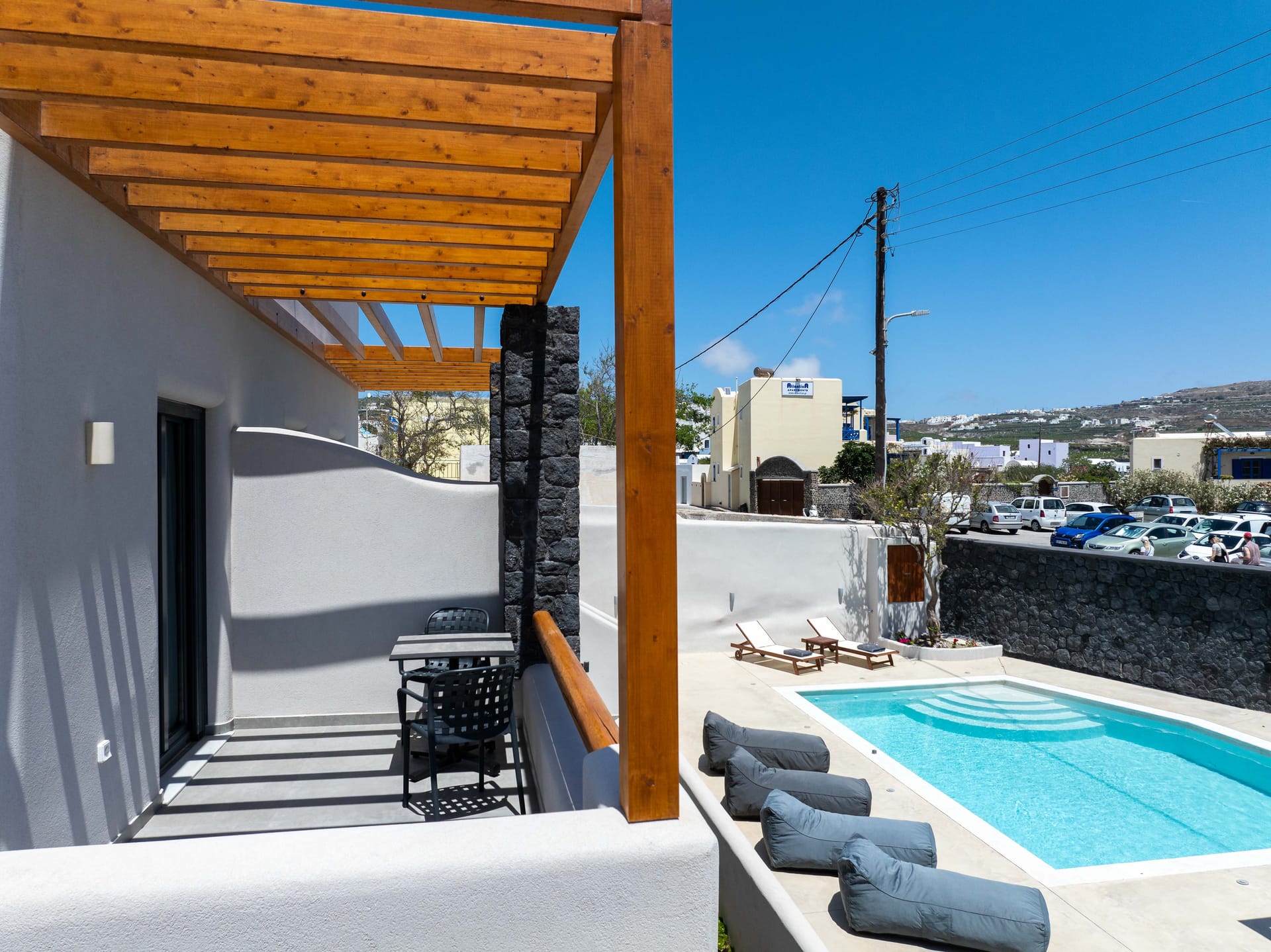 Each suite features a bedroom, dining area, kitchenette, living room, and a balcony with a private jacuzzi. The property also offers a shared pool.