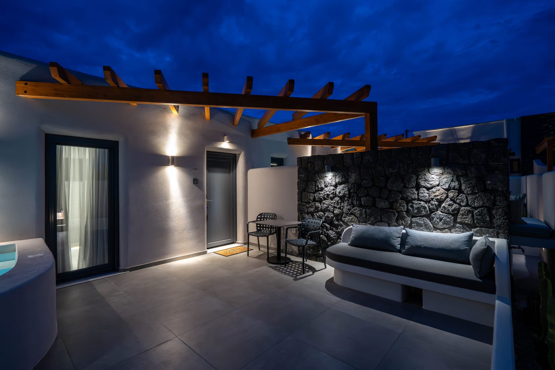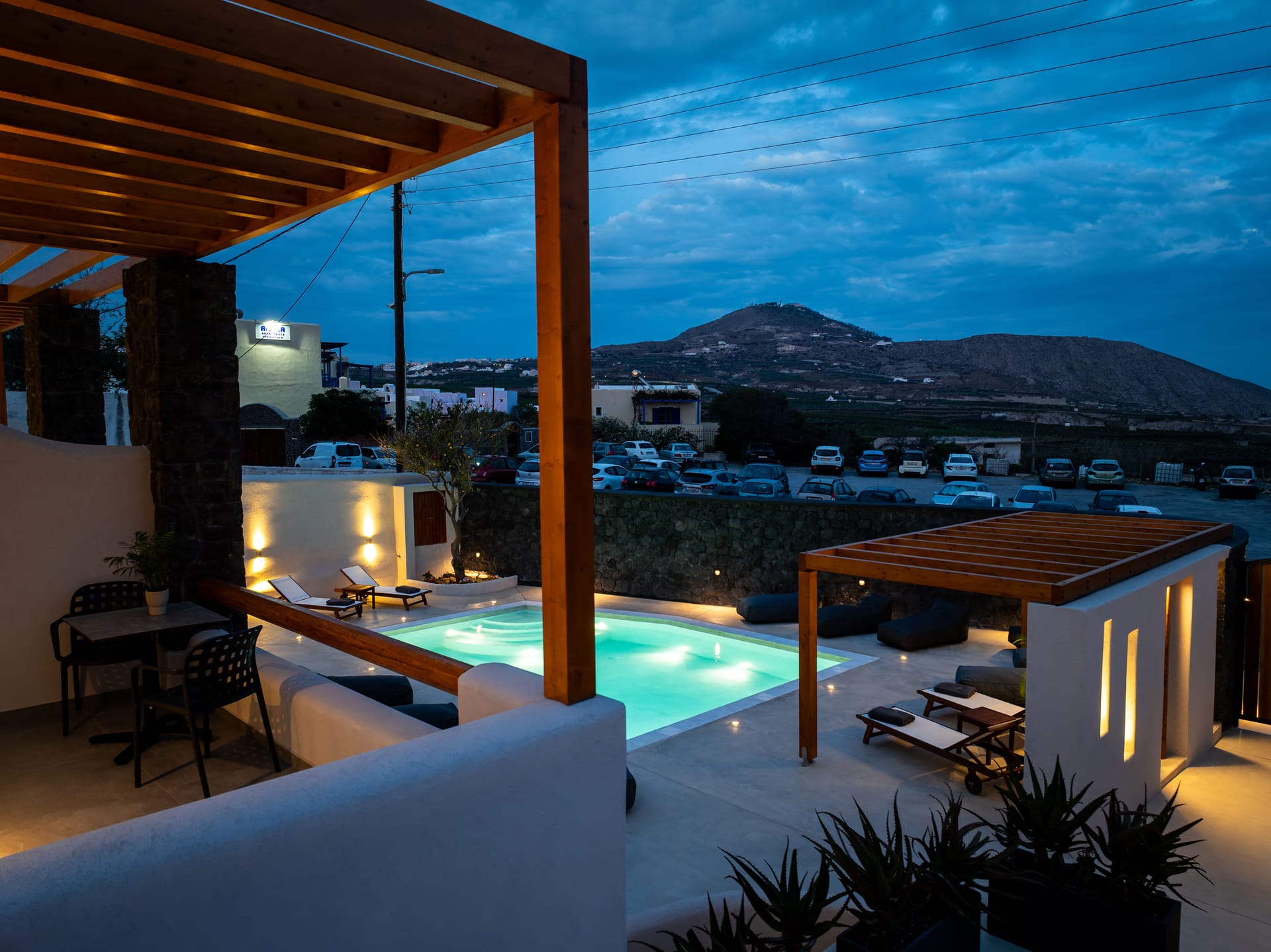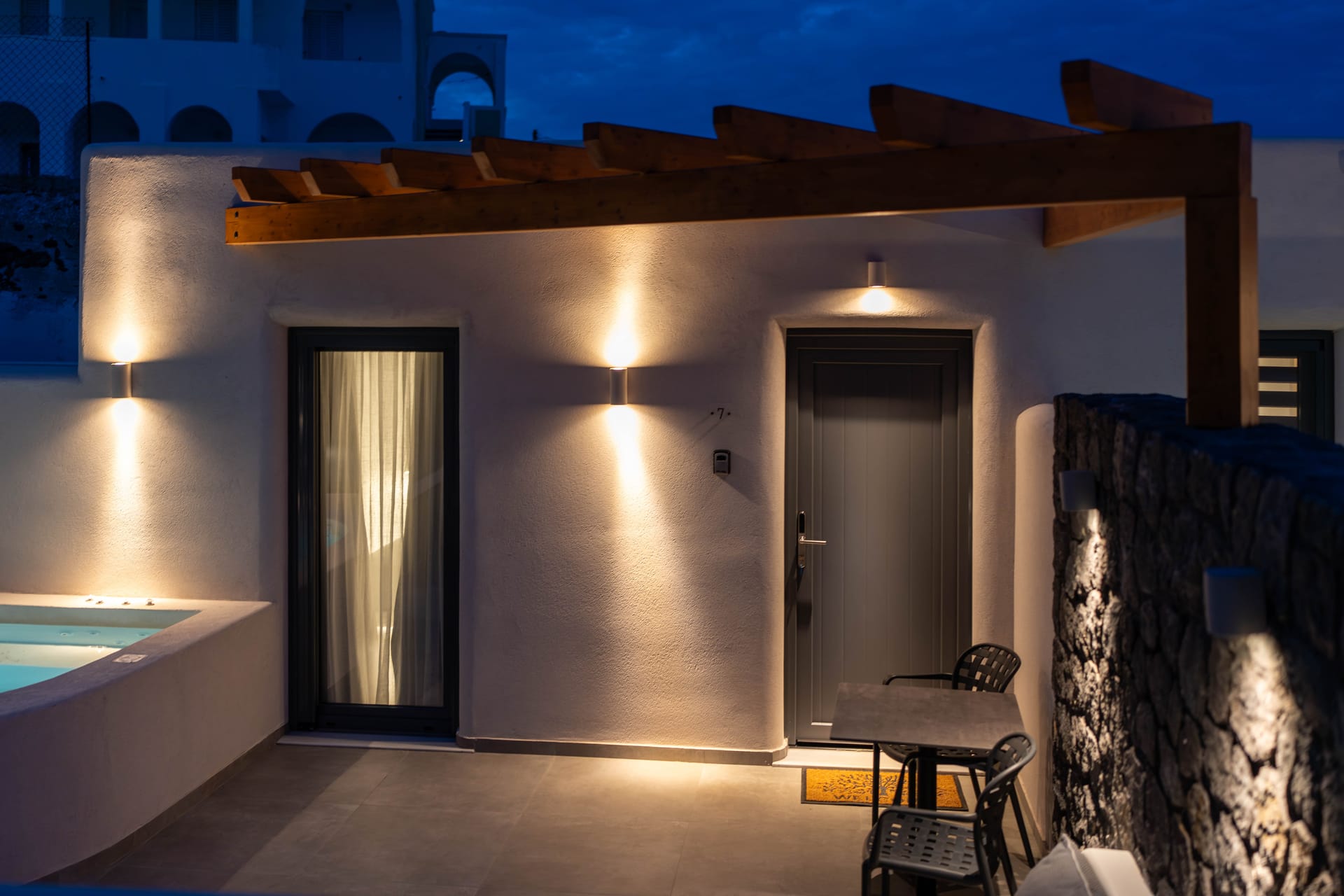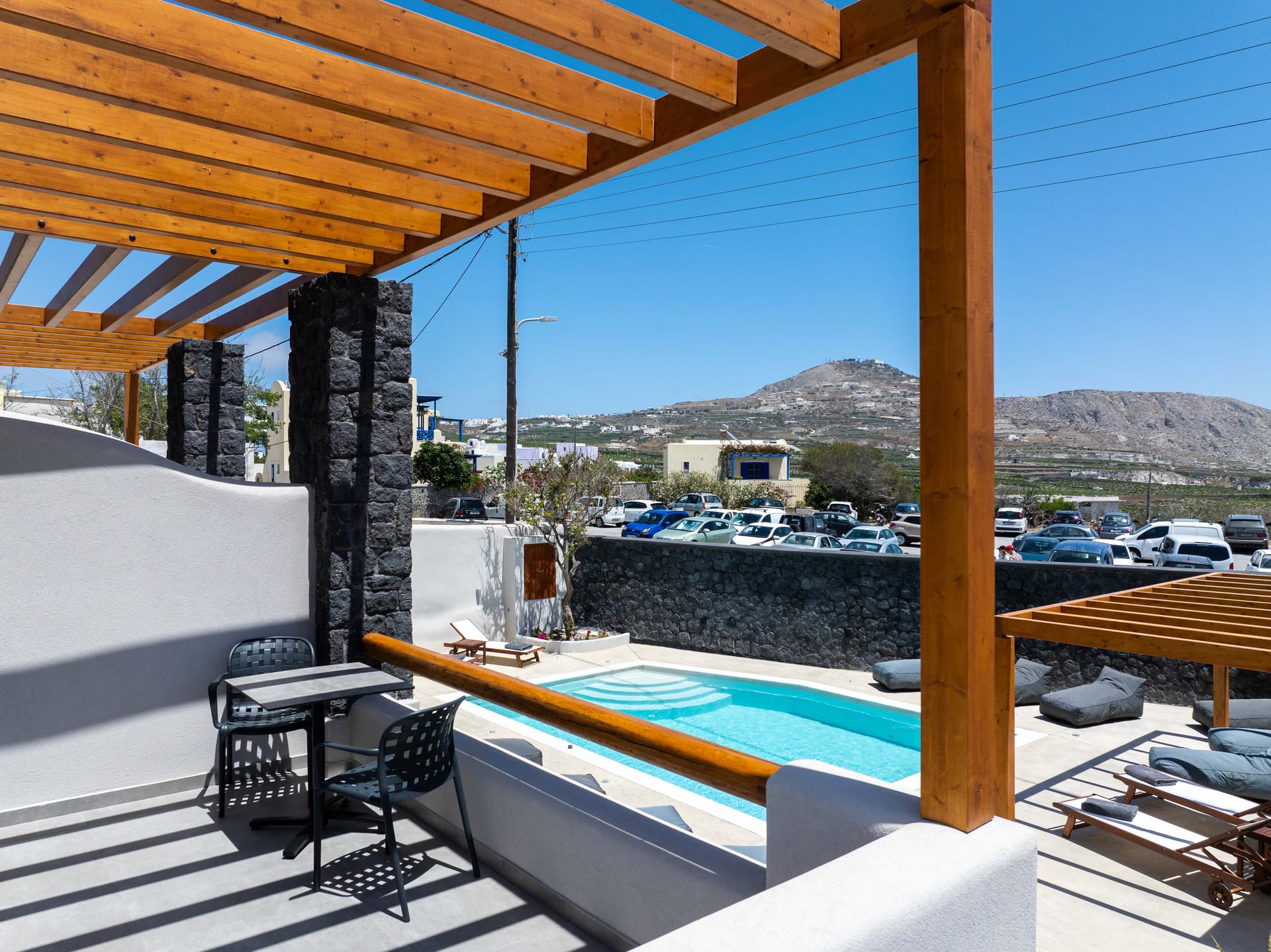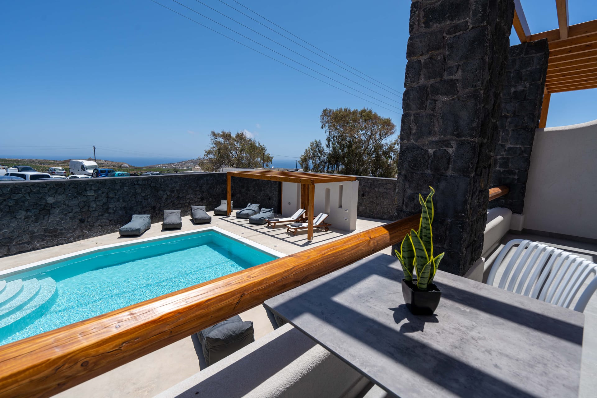 Each suite features a bedroom, dining area, kitchenette, living room, and a balcony with a private jacuzzi. The property also offers a shared pool.