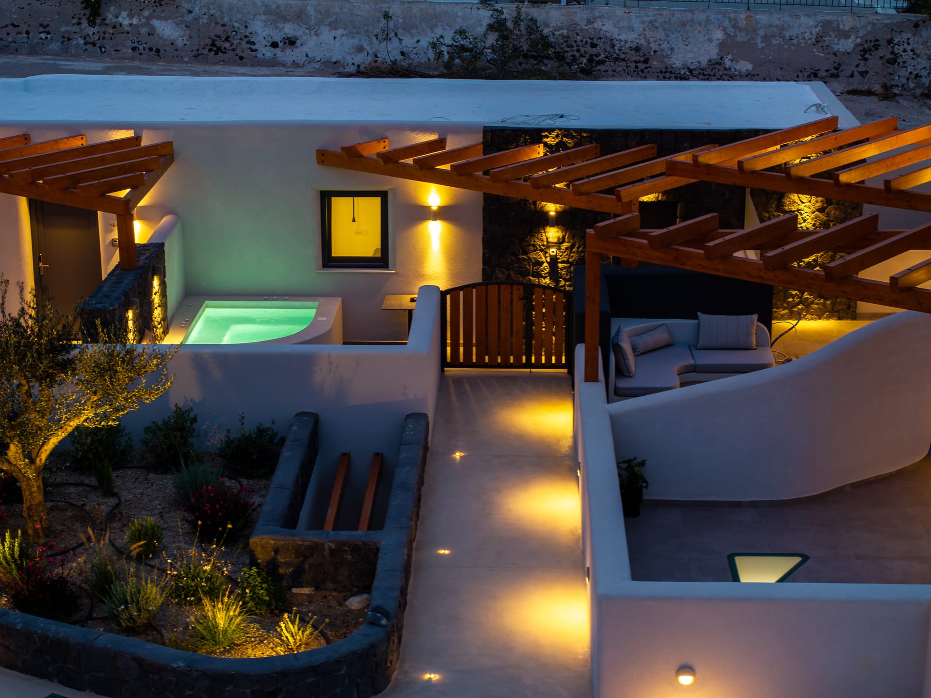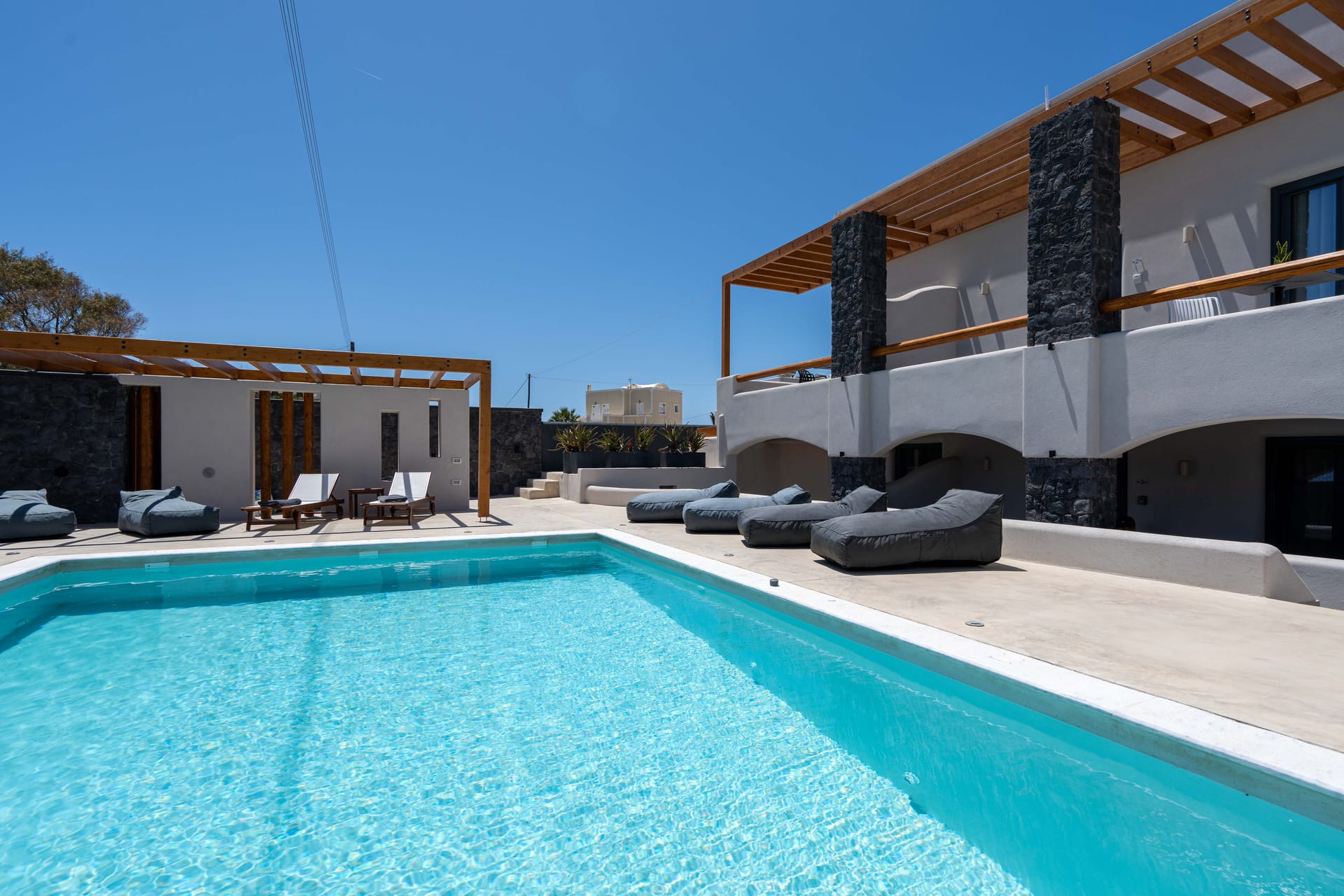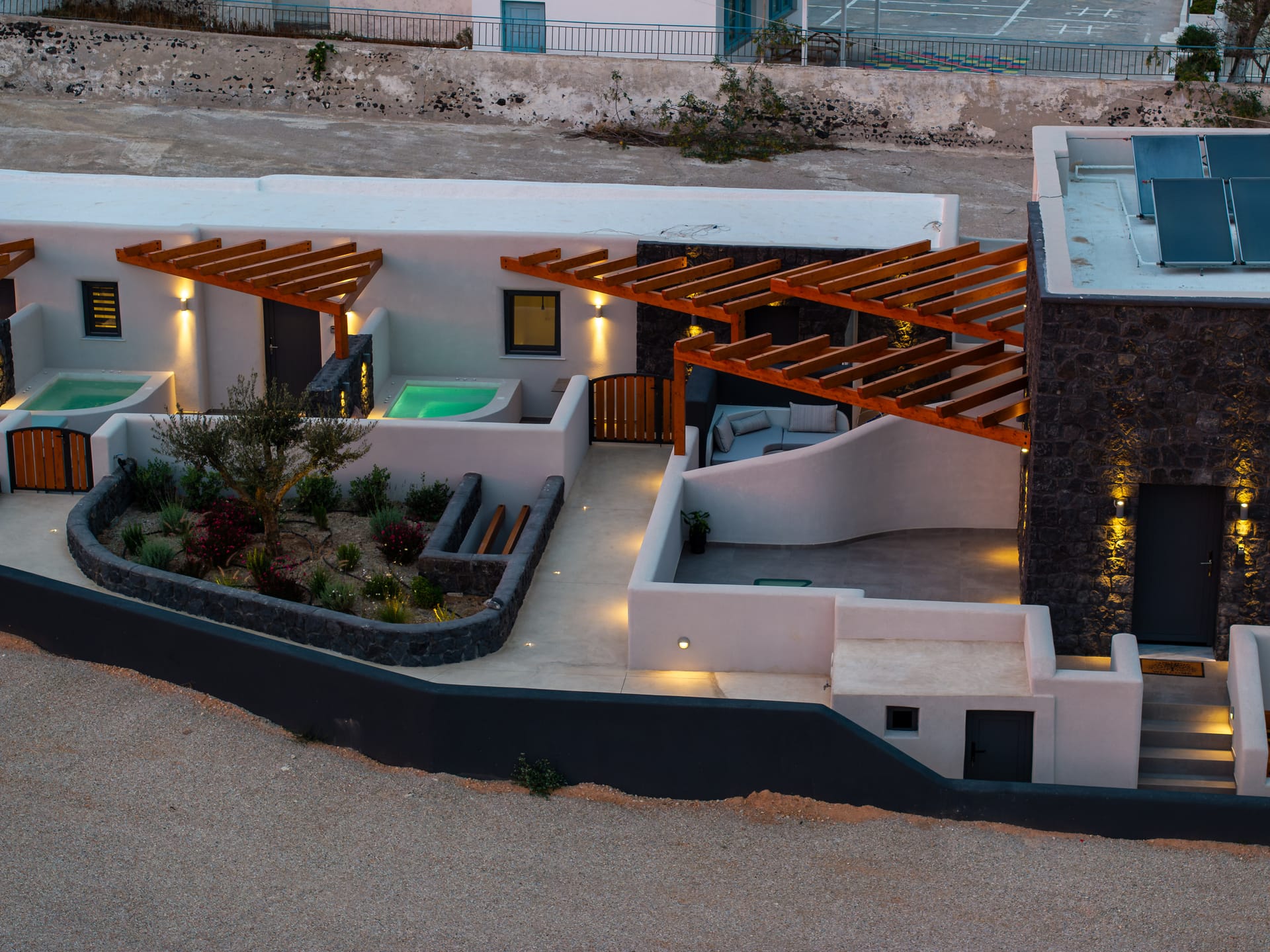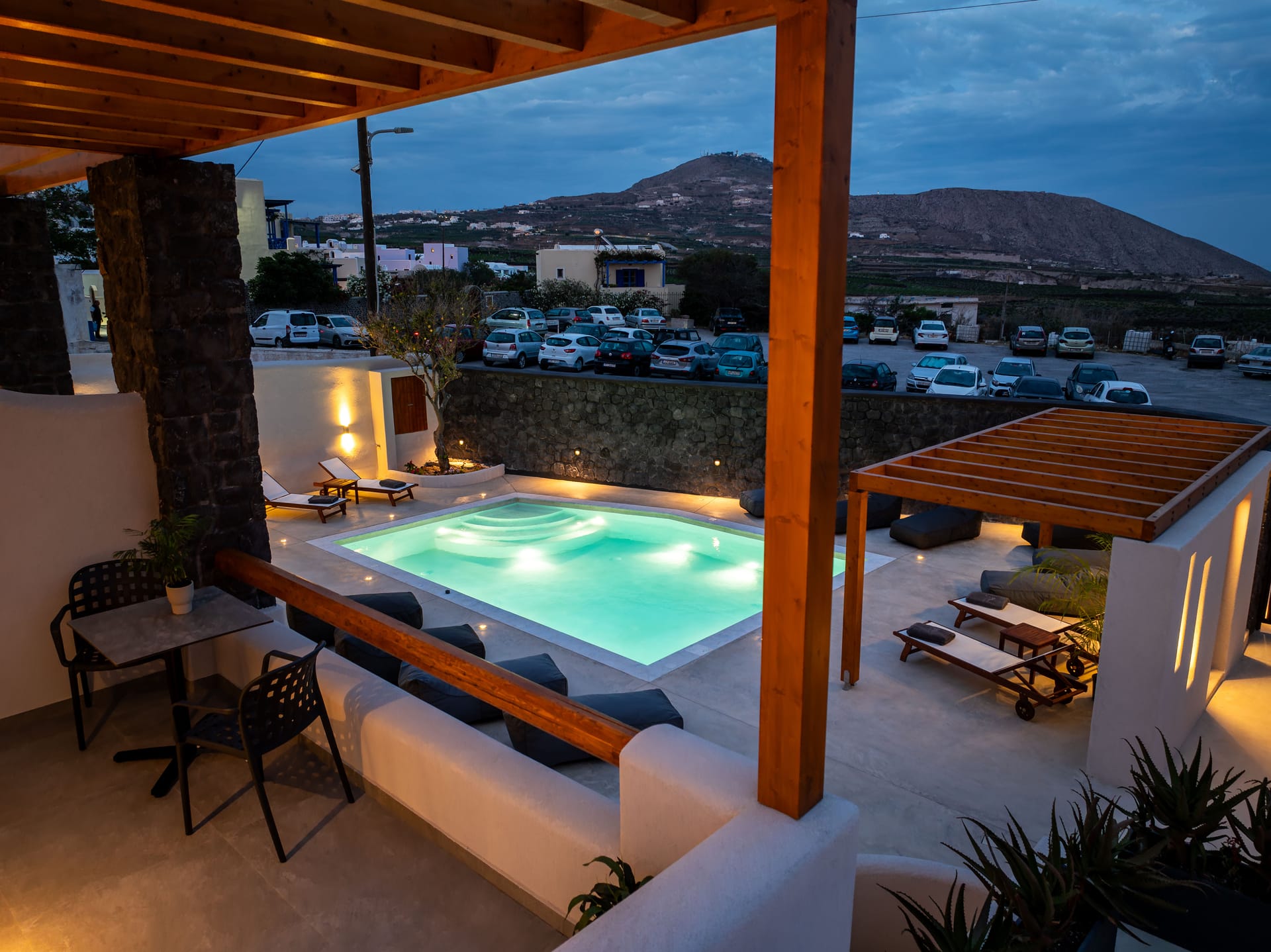 Each suite features a bedroom, dining area, kitchenette, living room, and a balcony with a private jacuzzi. The property also offers a shared pool.