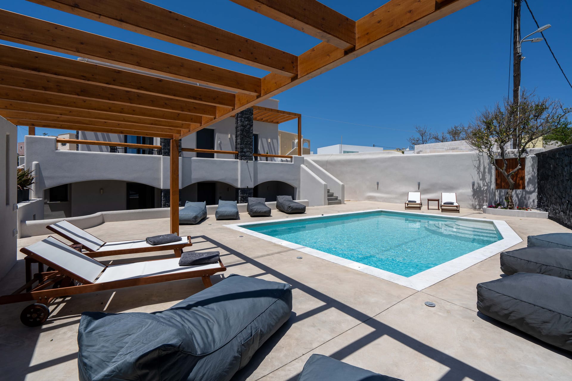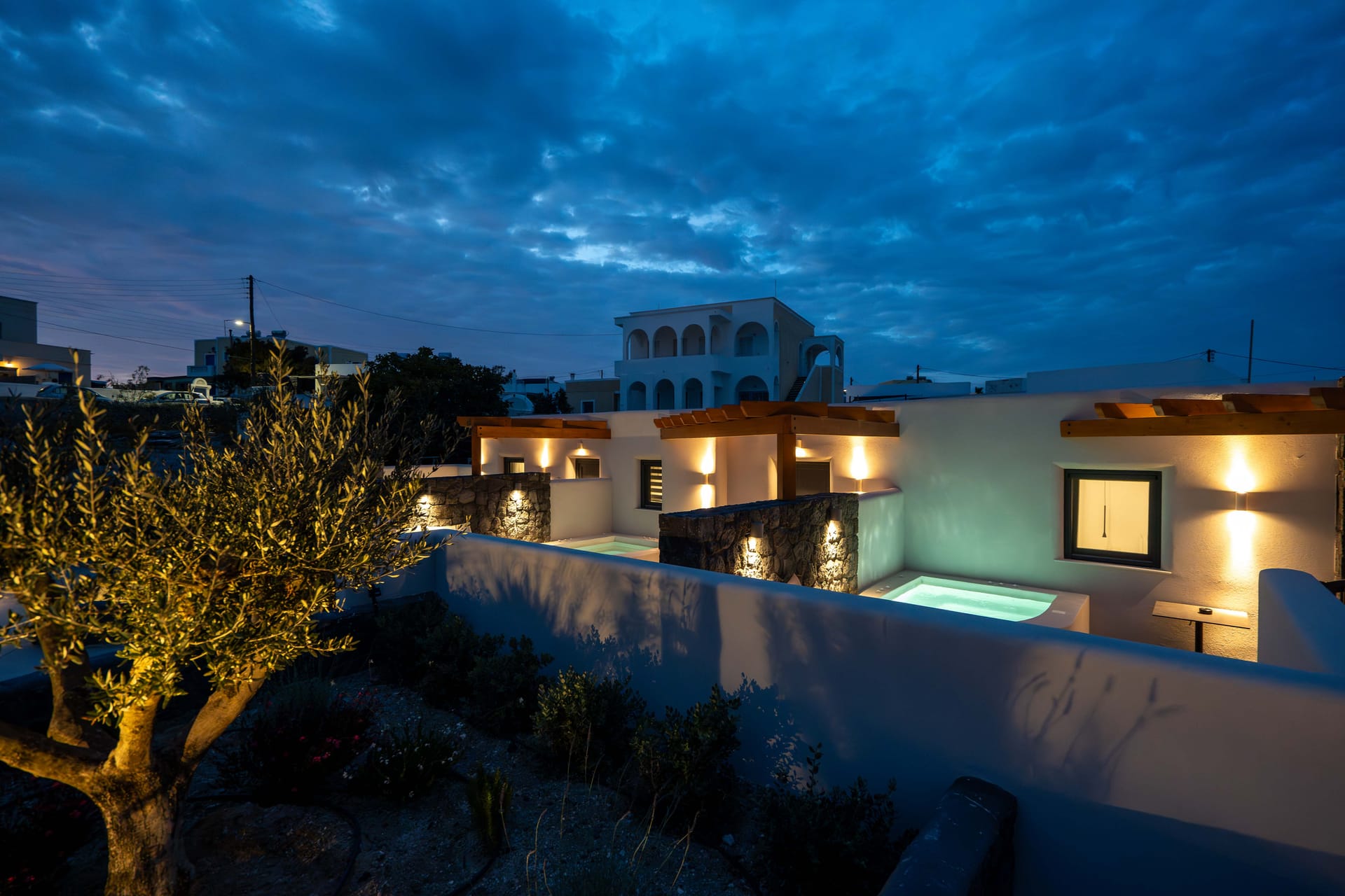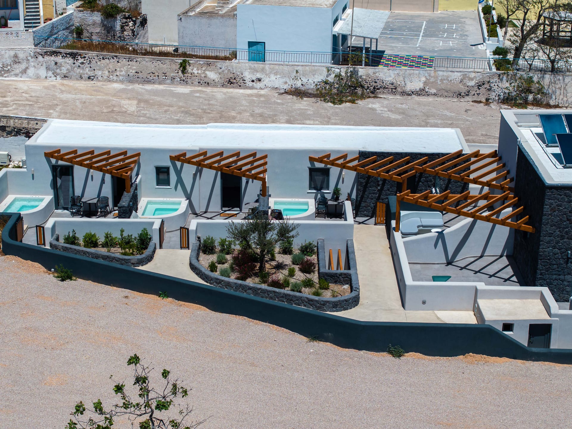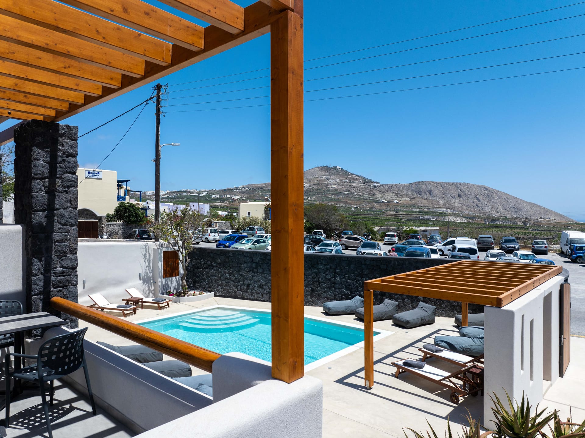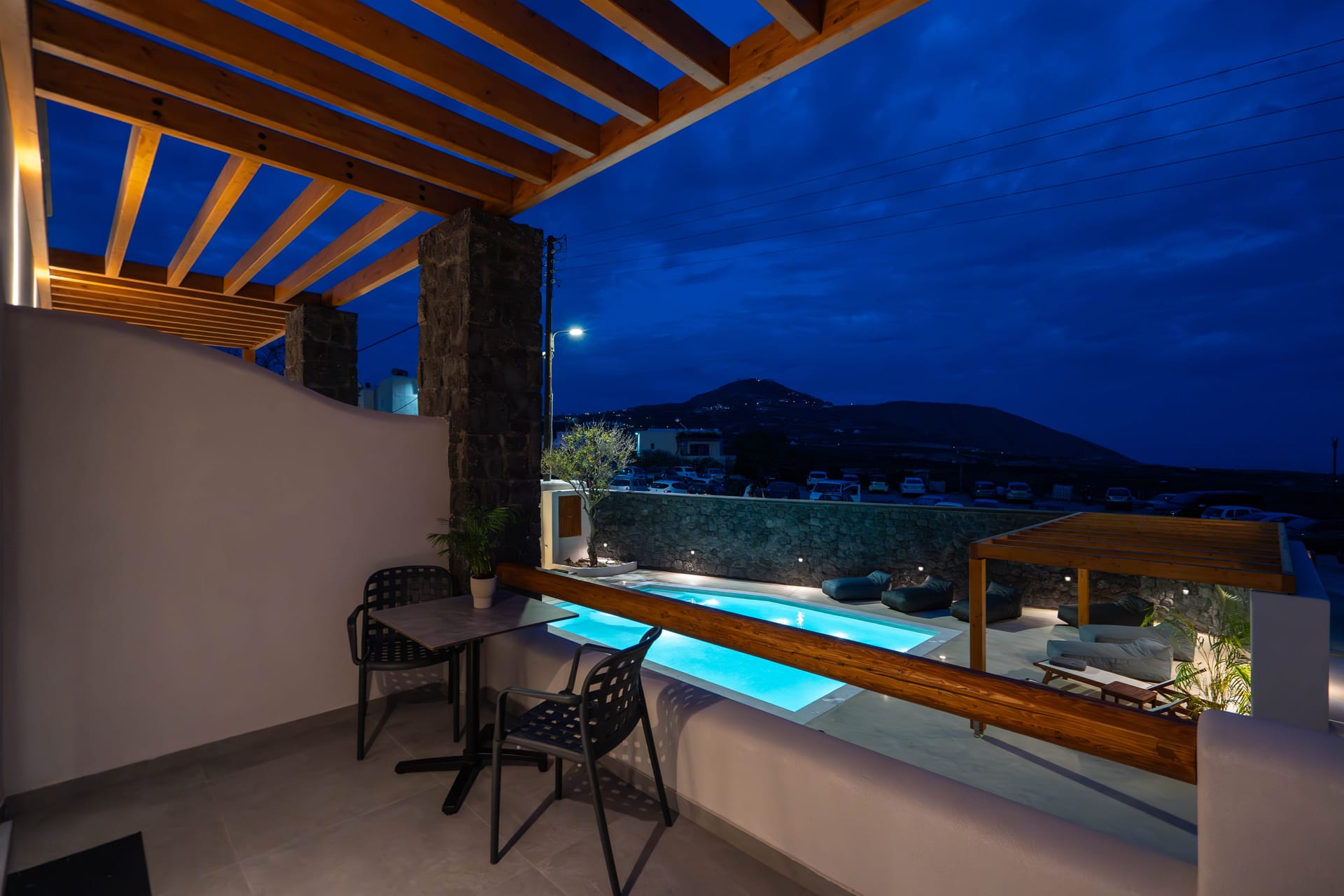 Each suite features a bedroom, dining area, kitchenette, living room, and a balcony with a private jacuzzi. The property also offers a shared pool.