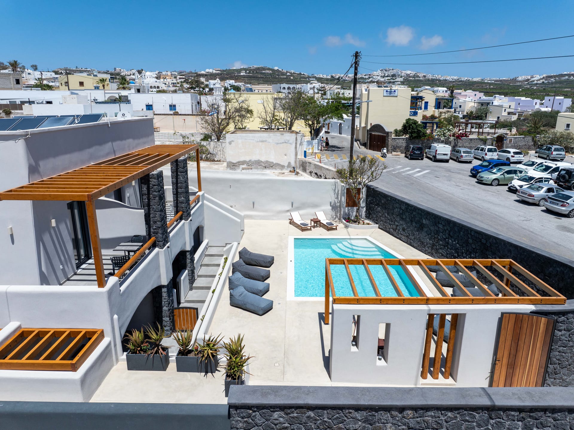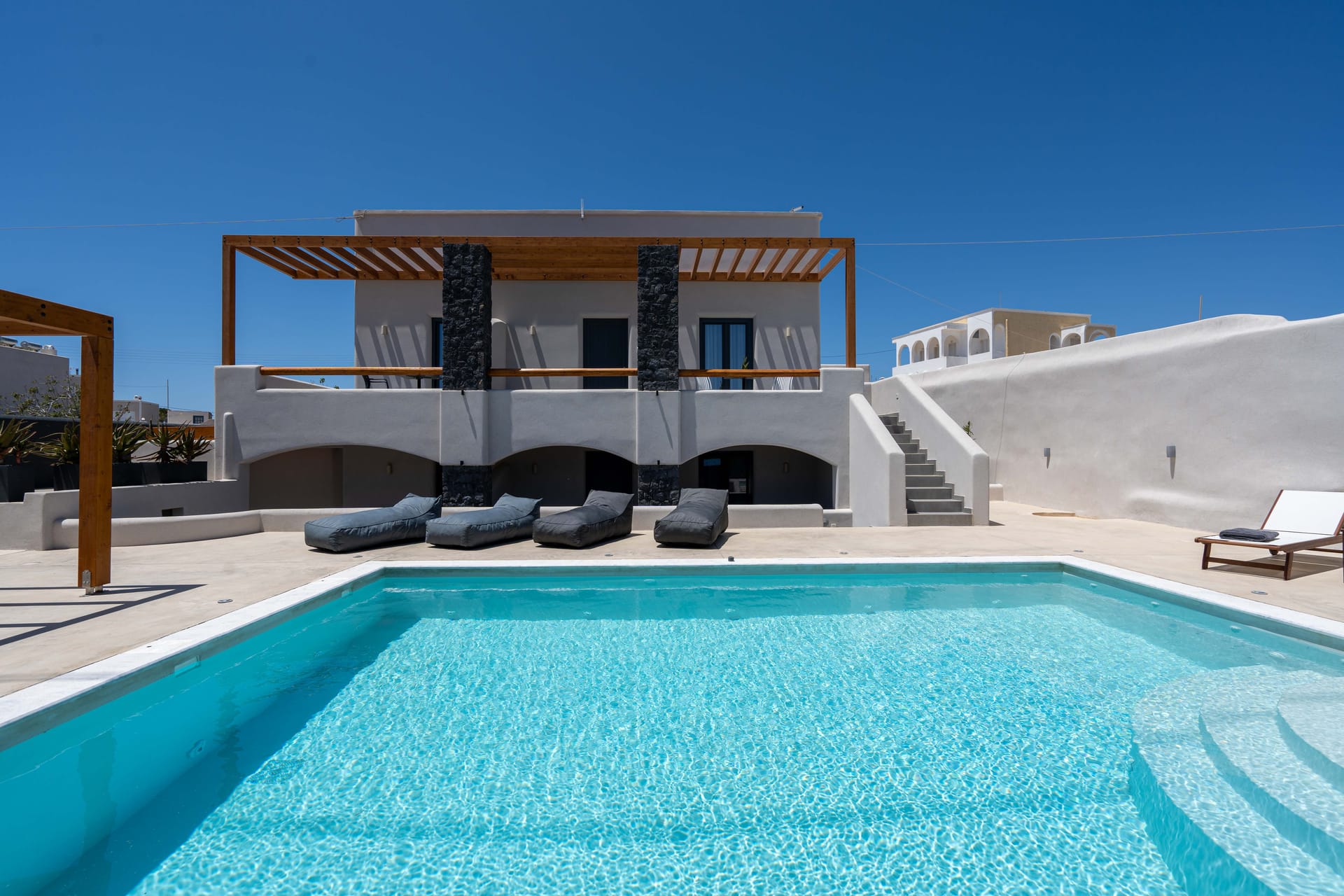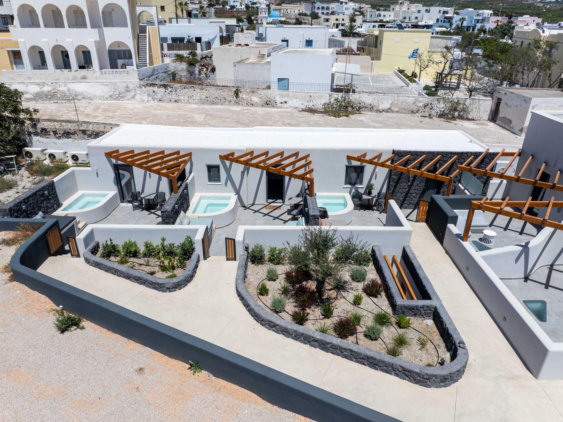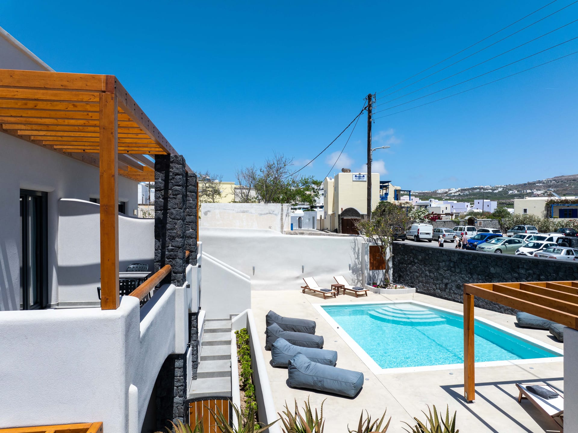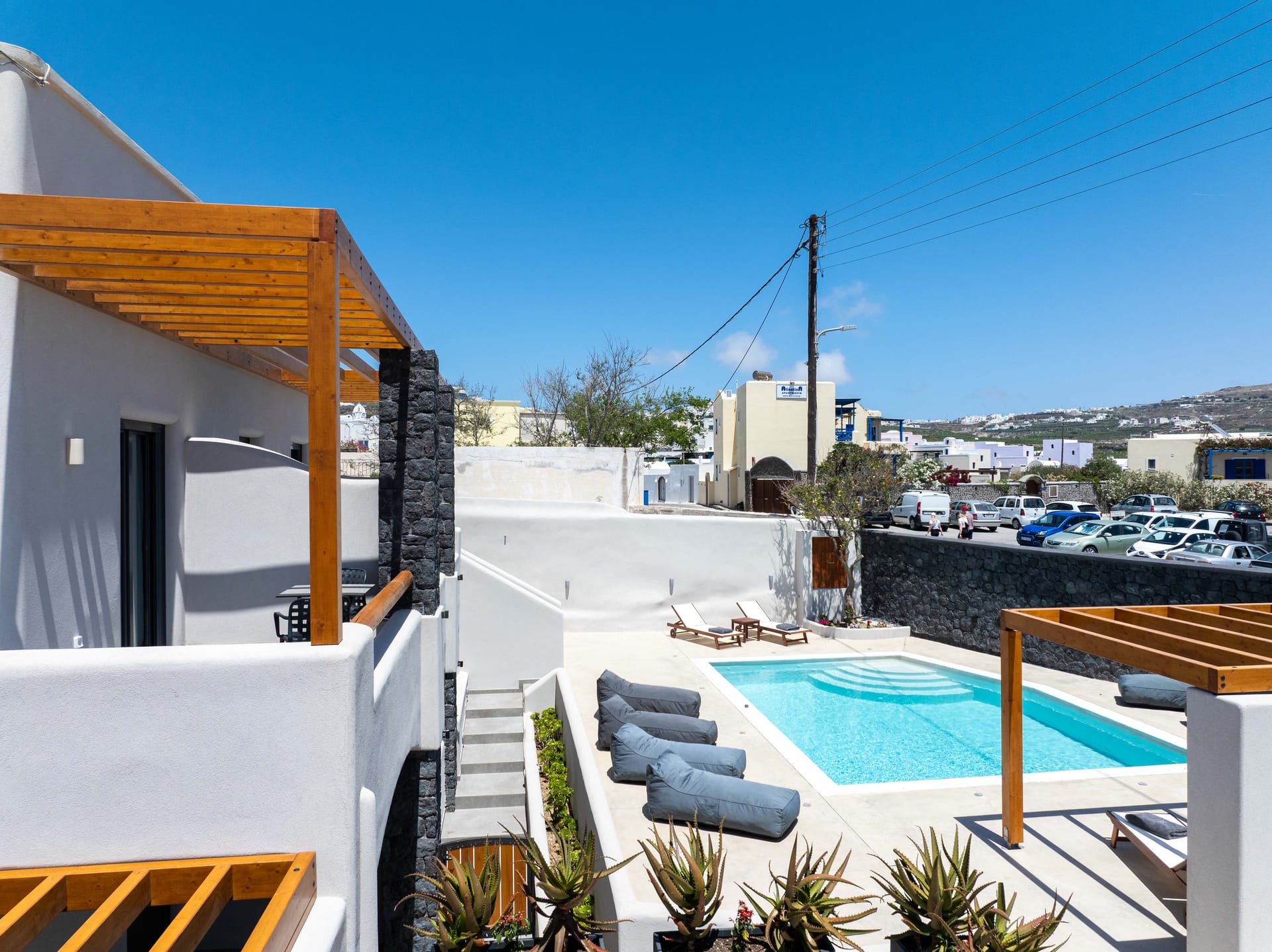 Each suite features a bedroom, dining area, kitchenette, living room, and a balcony with a private jacuzzi. The property also offers a shared pool.