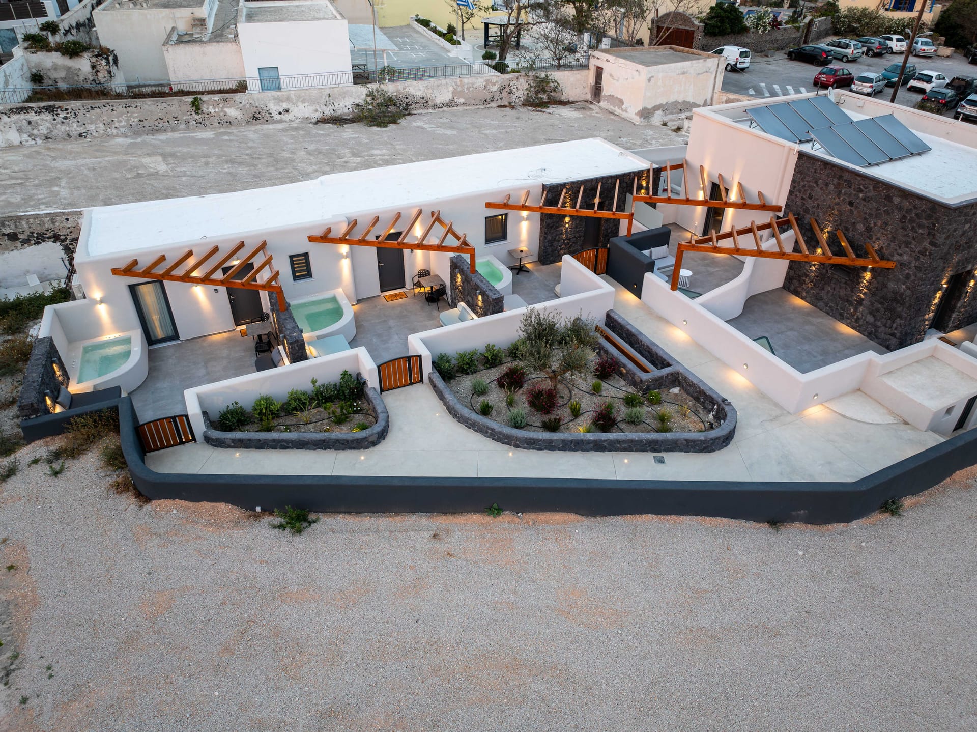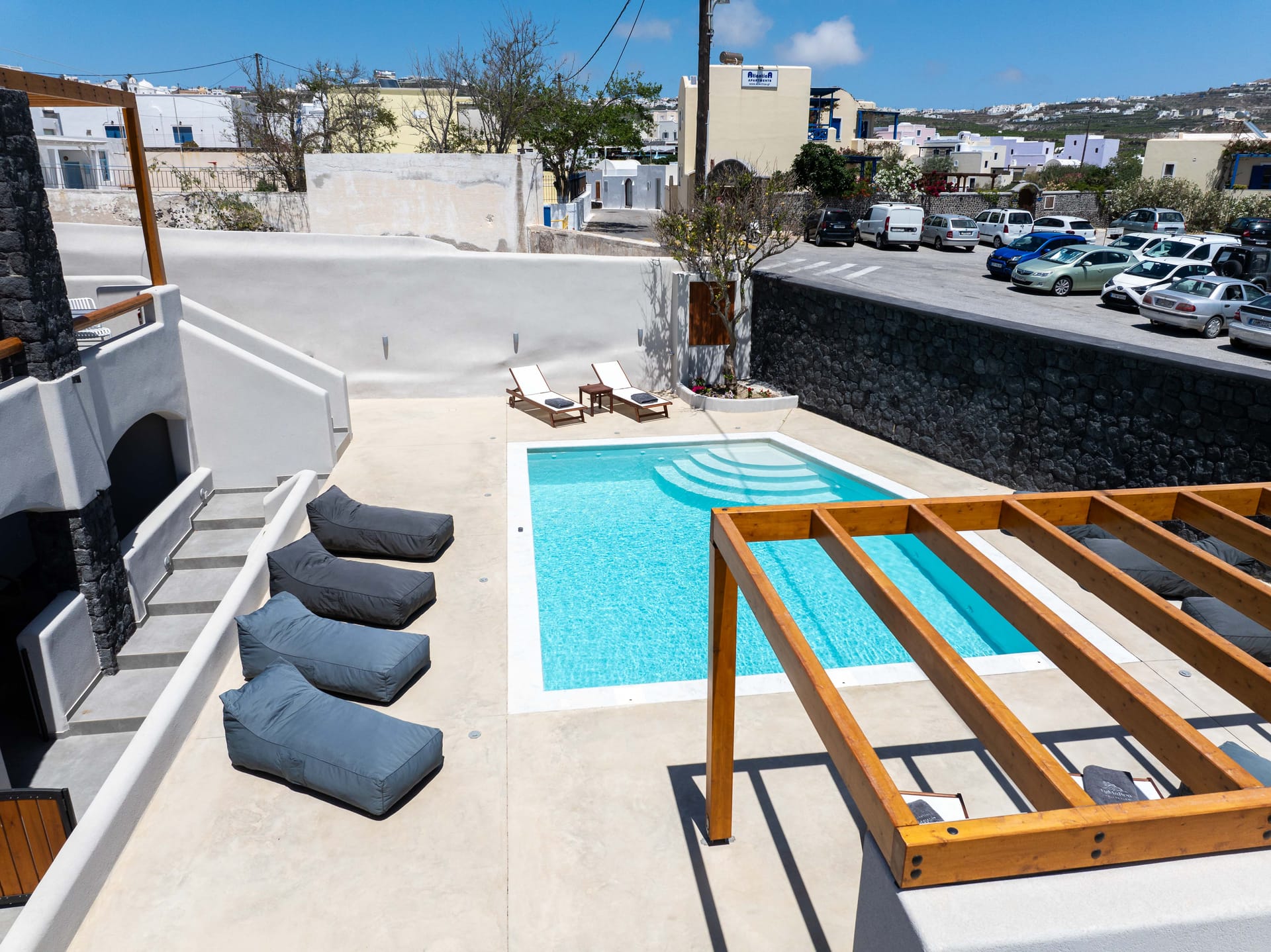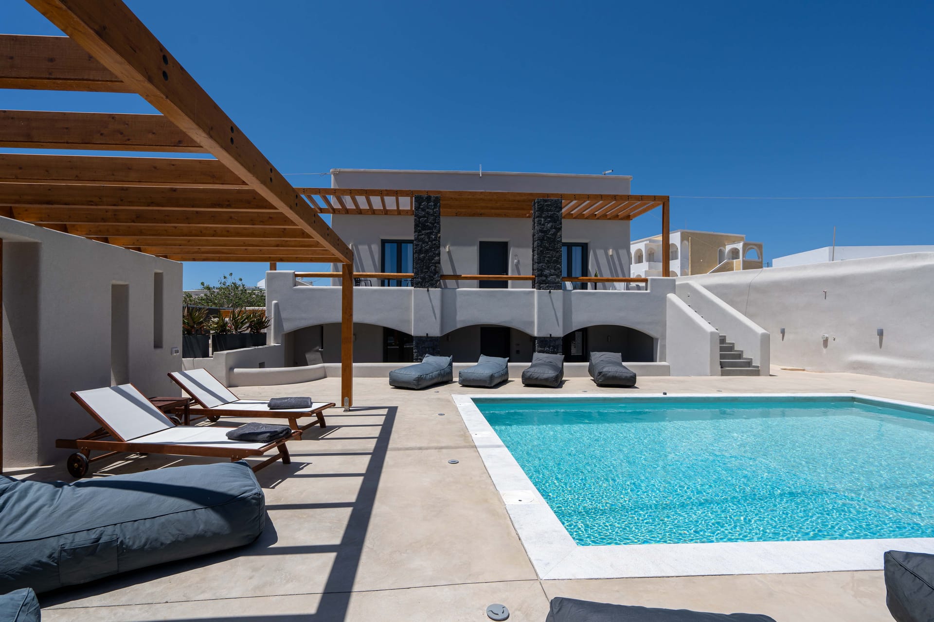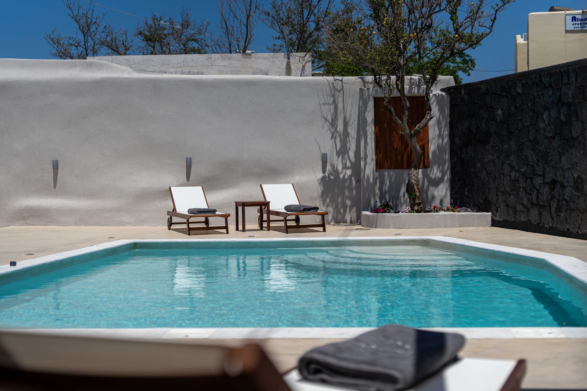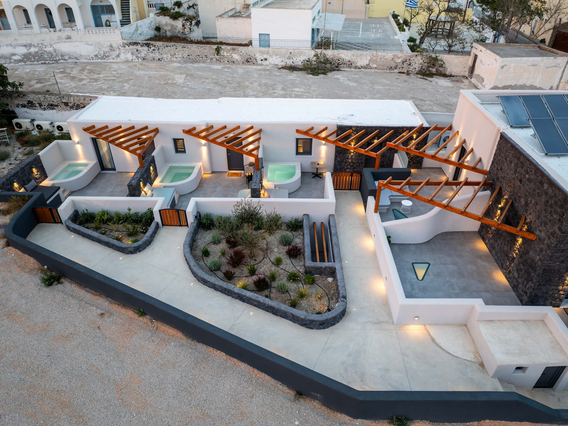 Each suite features a bedroom, dining area, kitchenette, living room, and a balcony with a private jacuzzi. The property also offers a shared pool.