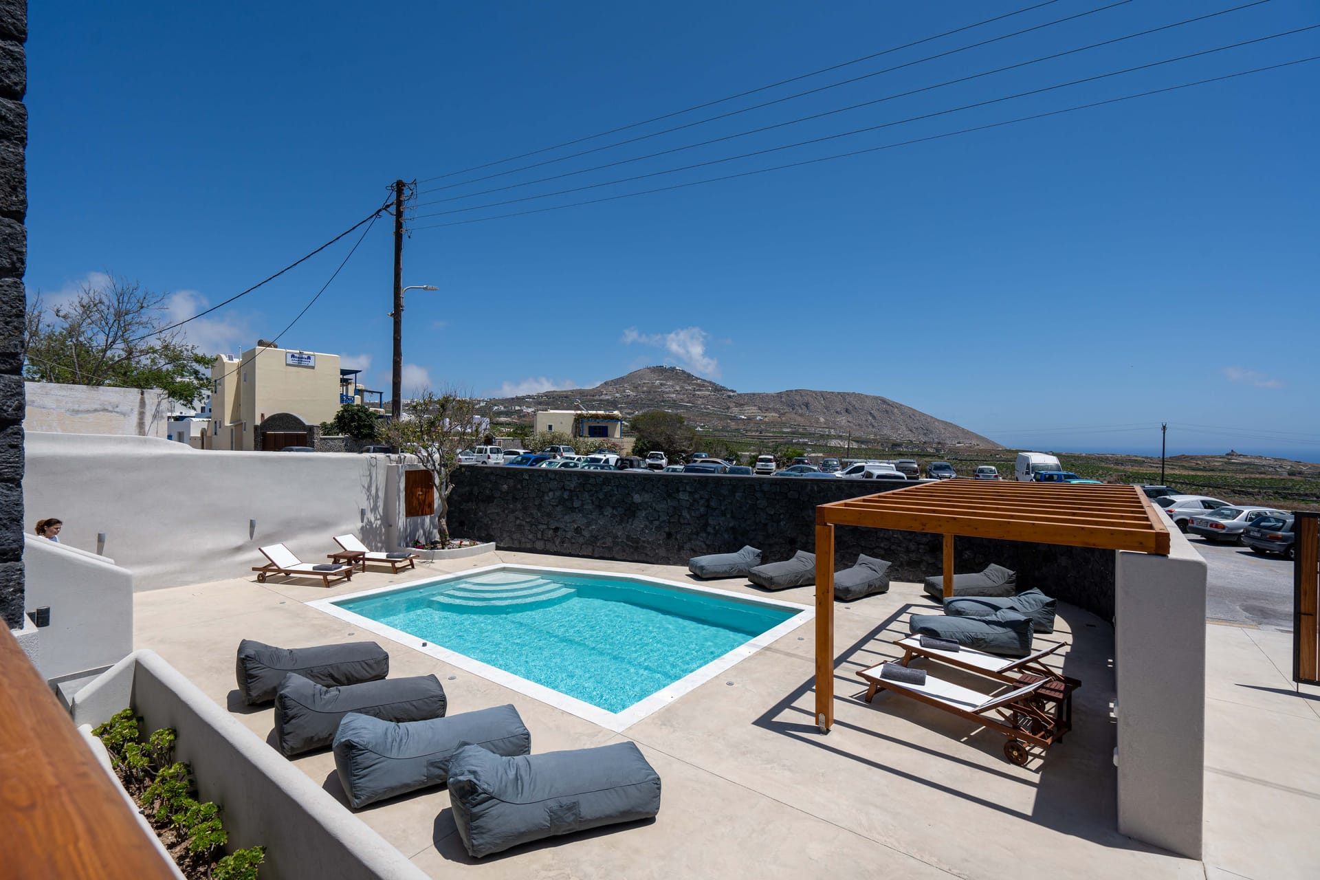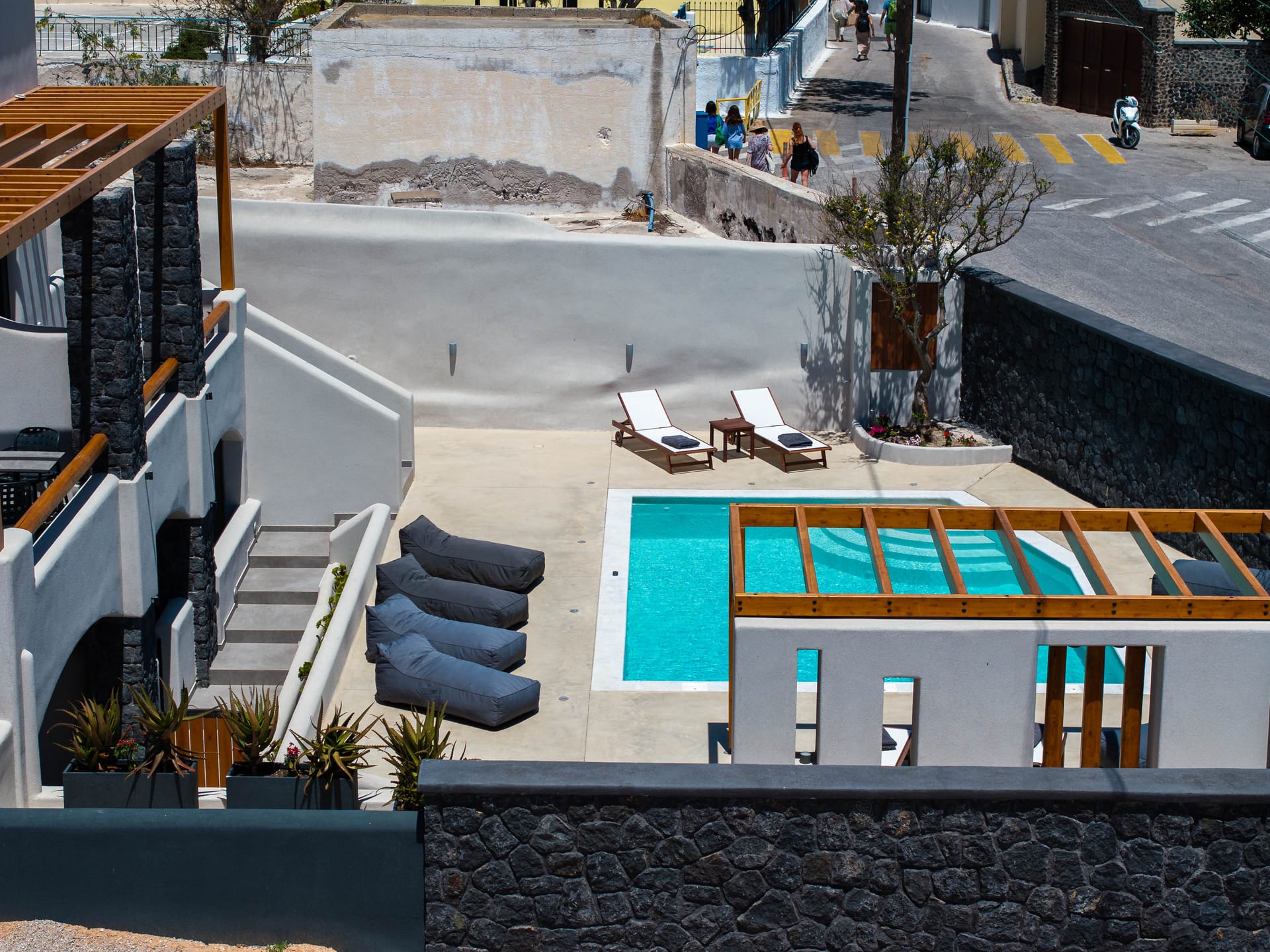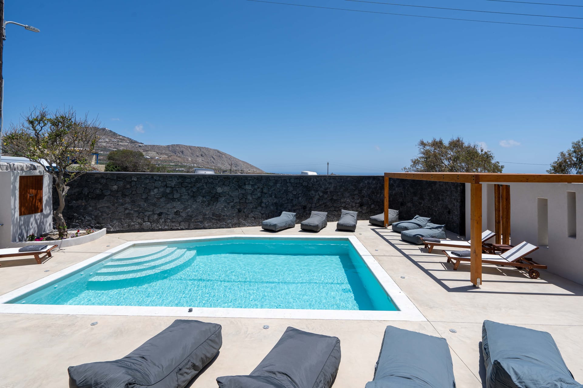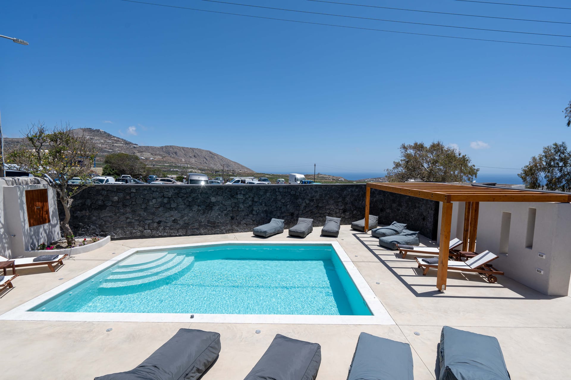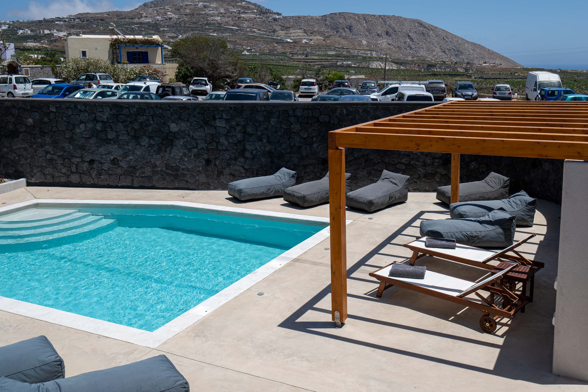 Each suite features a bedroom, dining area, kitchenette, living room, and a balcony with a private jacuzzi. The property also offers a shared pool.