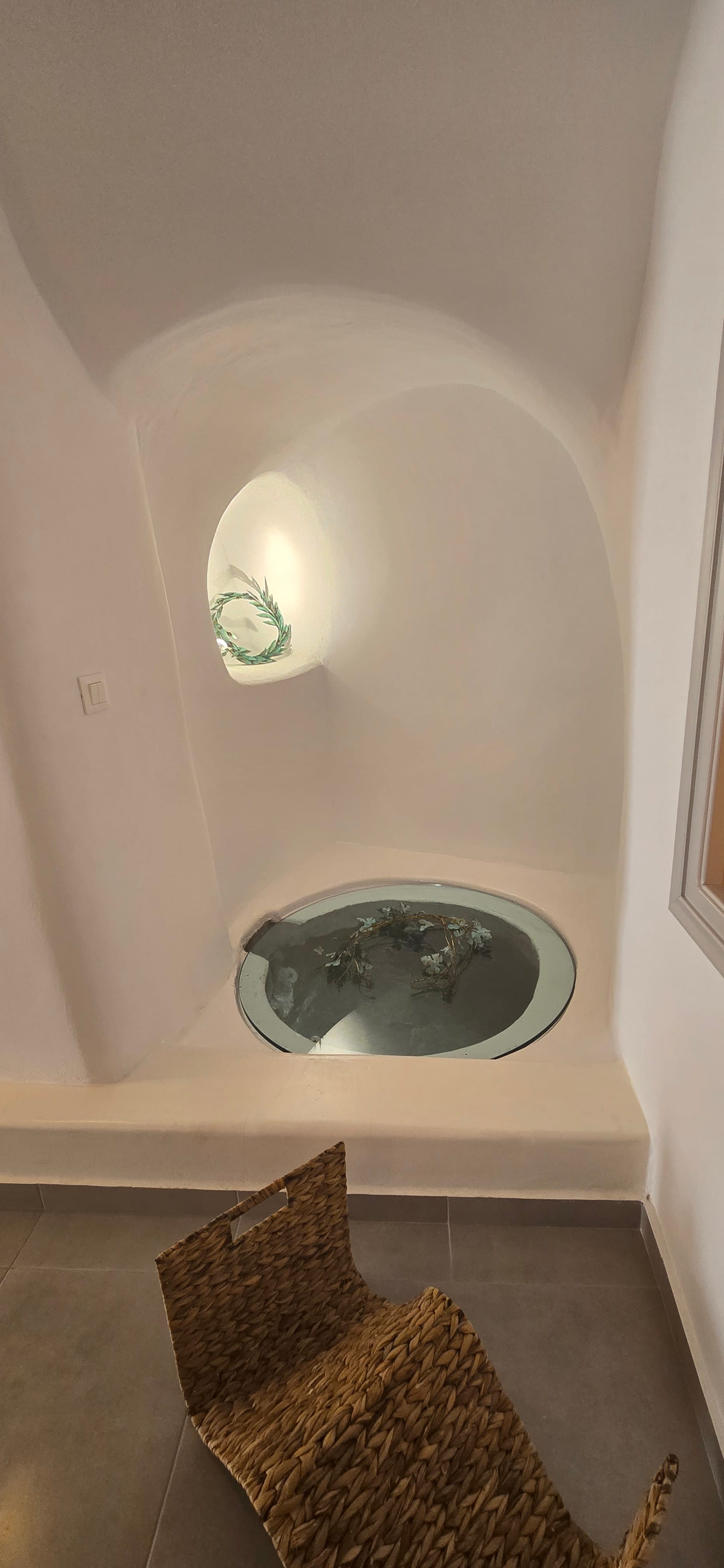 Today, this historic mansion has been thoughtfully transformed into a contemporary residence. In its past life, it functioned as a traditional canava—a wine-making space where Santorini’s renowned wines were once produced. The original wine press is still preserved on-site (specifically within the Canava Residence), serving as a living testament to the island’s rich viticultural legacy.