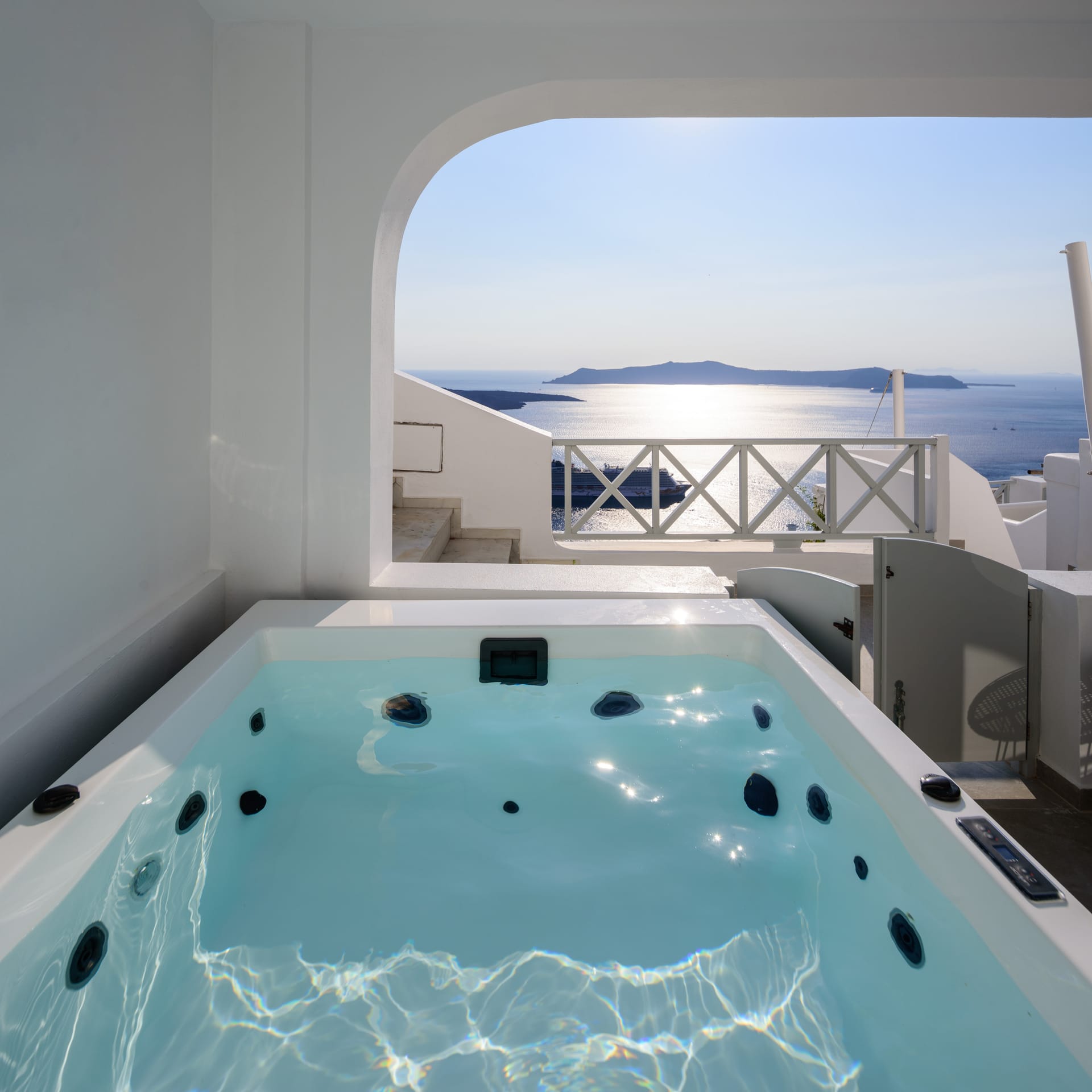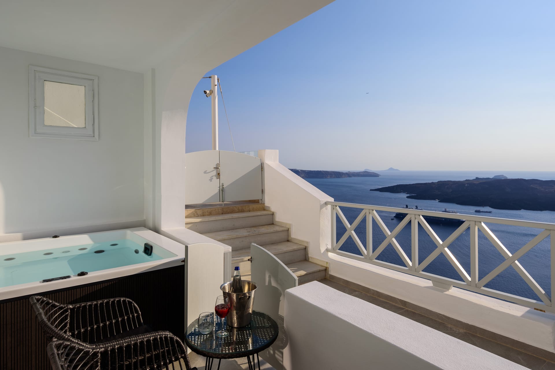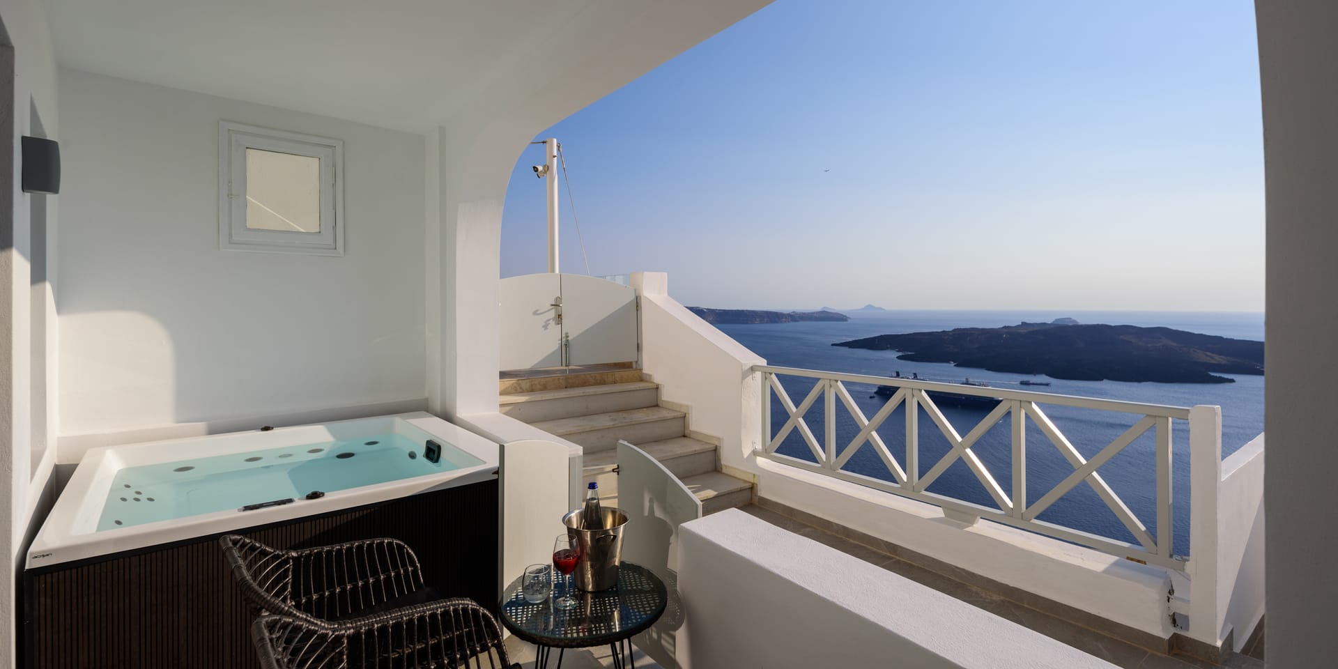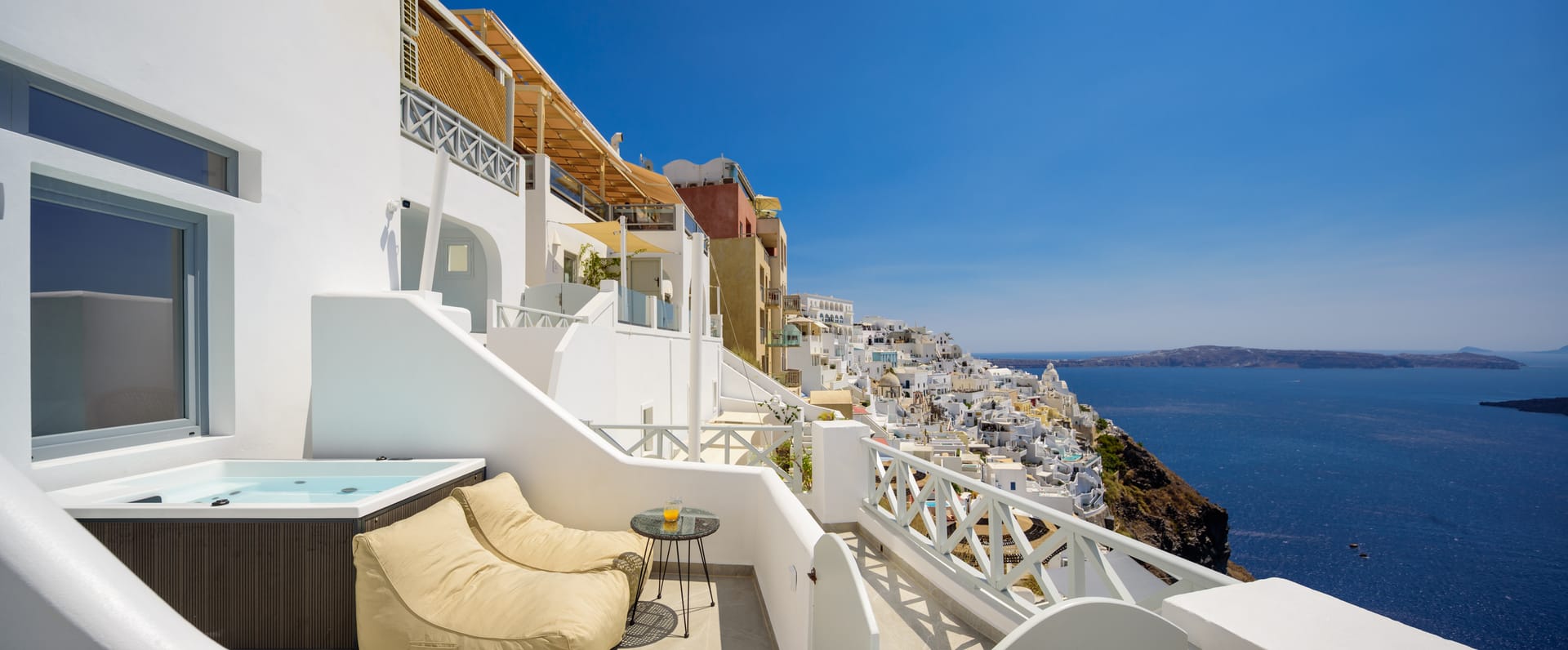 Elia Caldera Suites, located in Fira gld street with an amazing view to caldera. 3 rooms with an outdoor hot tub, sun terrace and view to caldera and the volcano.