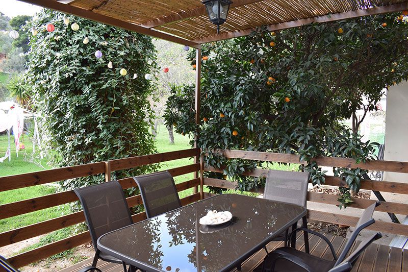 Serenity Villa of Skiathos is a spacious two storey, 5-bedroom house with a very large and updated living room, dining room and kitchen. The guests enter through a front yard with beautiful flowers or a private garage with separate doors leading up to the main entrance.