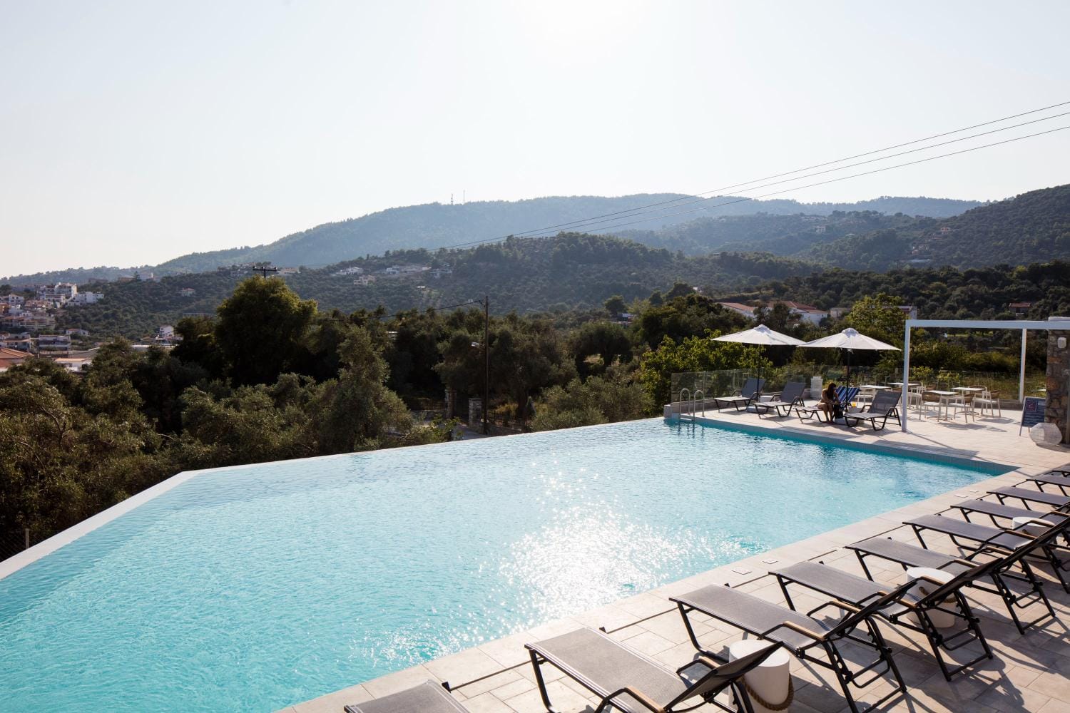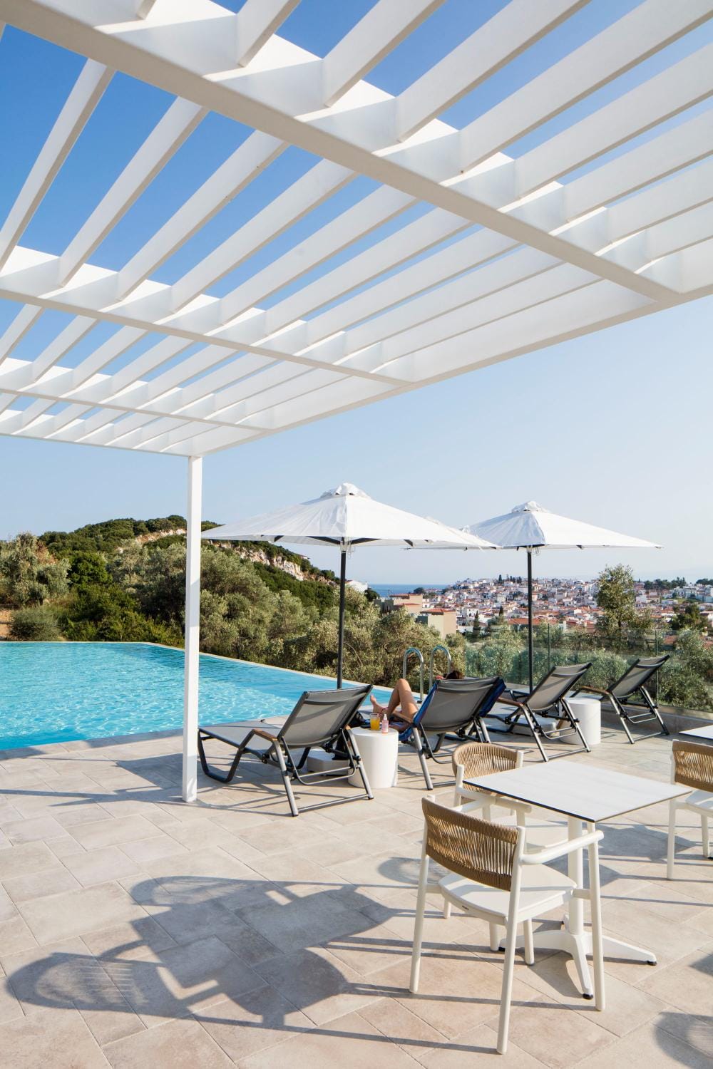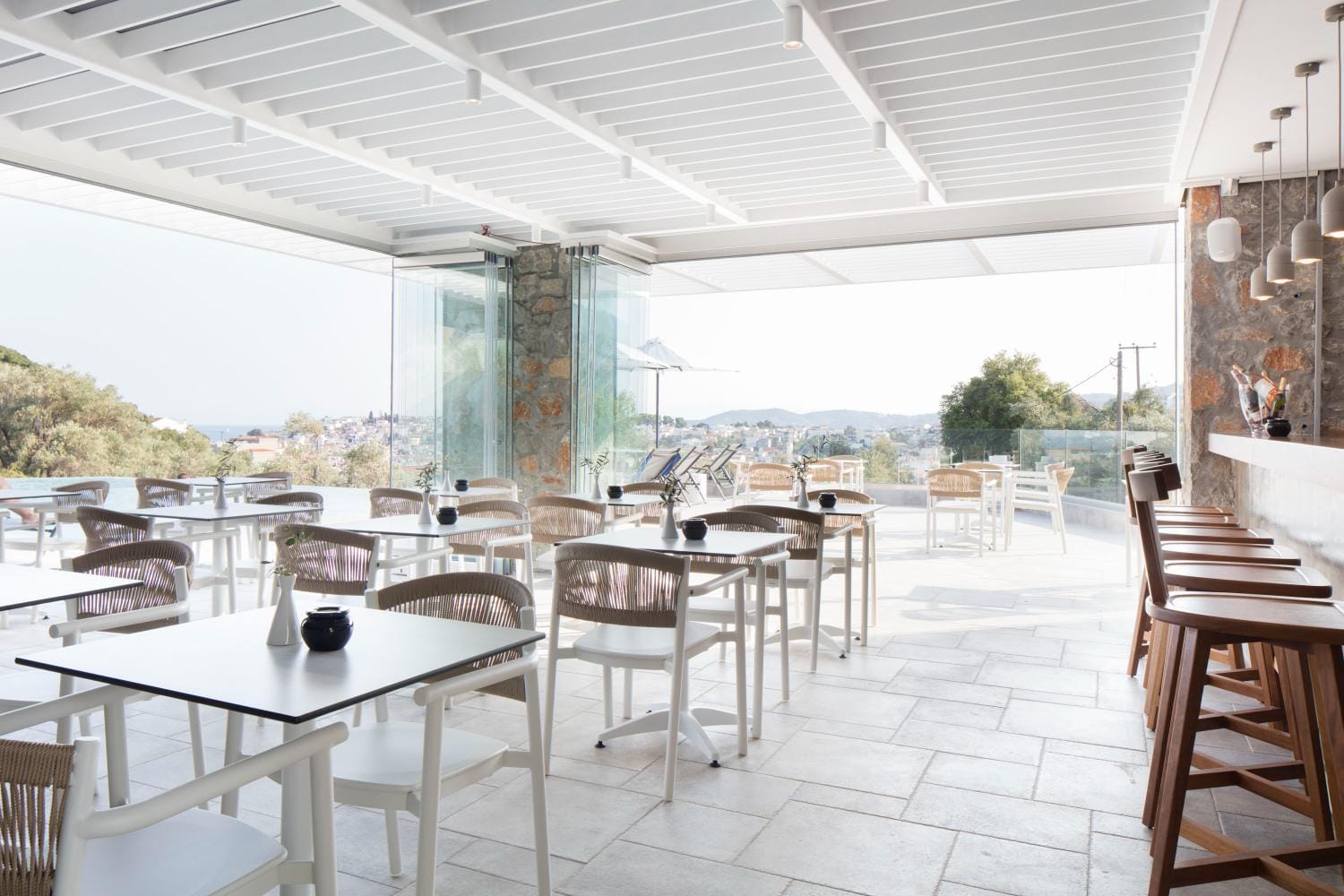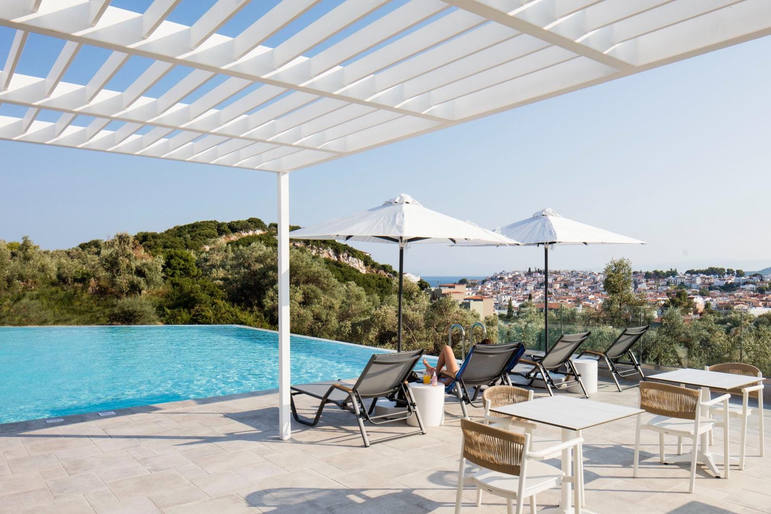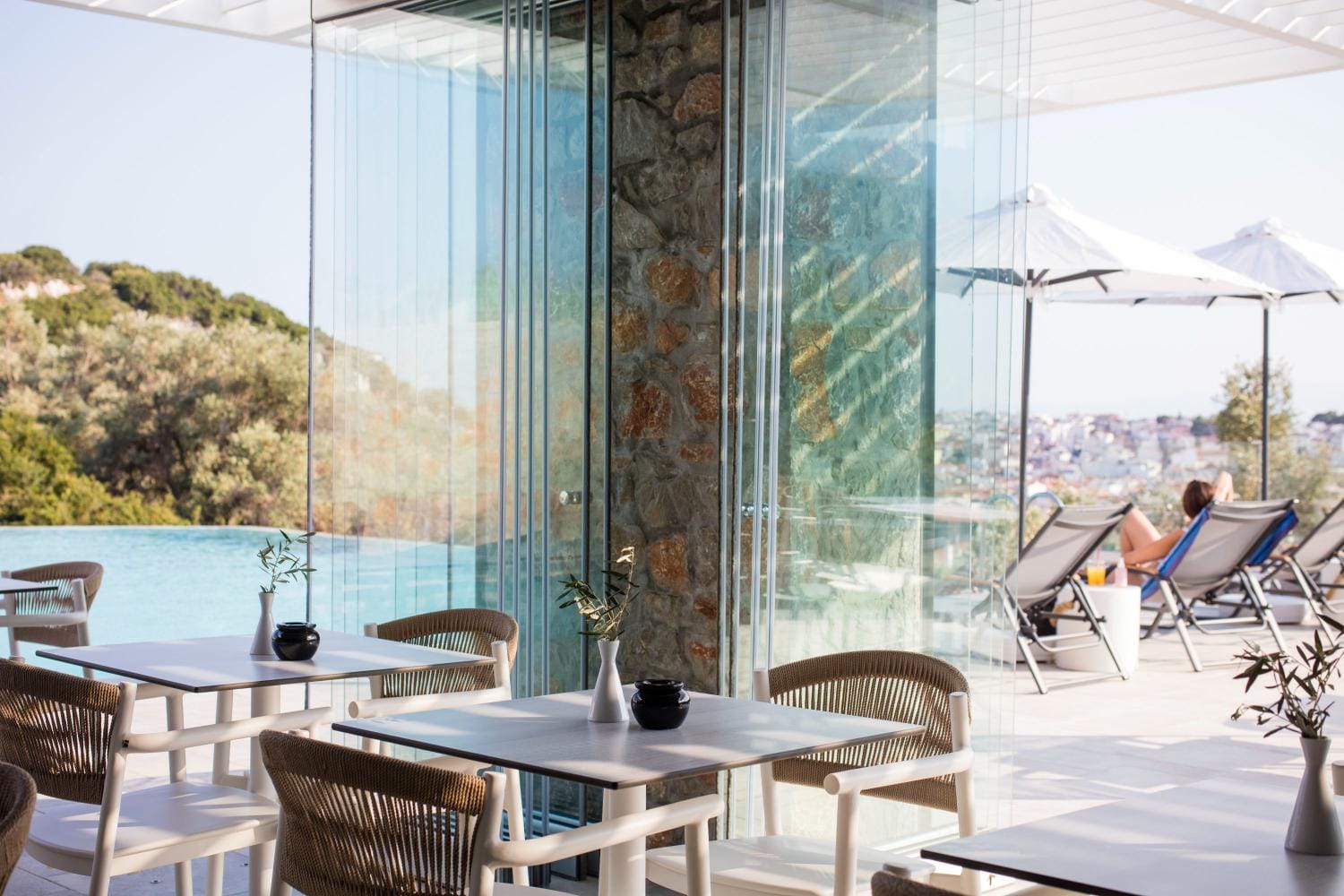 Overlooking the town of Skiathos and the Aegean sea from an elevated mount area, this brand new luxury hotel offers upscale accommodation with a free parking, surrounded by a serene lush green landscape. Amira Hotel architecture follows a minimal design boosted by the fusion of the elements of earth and water, creating an atmosphere of an unpretentious, natural opulence. The embracing warmth of wood and stone and the revitalizing coolness of the pool, calibrate your senses to their natural balance, welcoming you to experience a unique stay in graceful Skiathos.