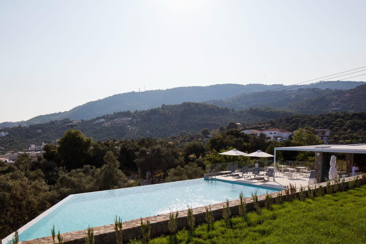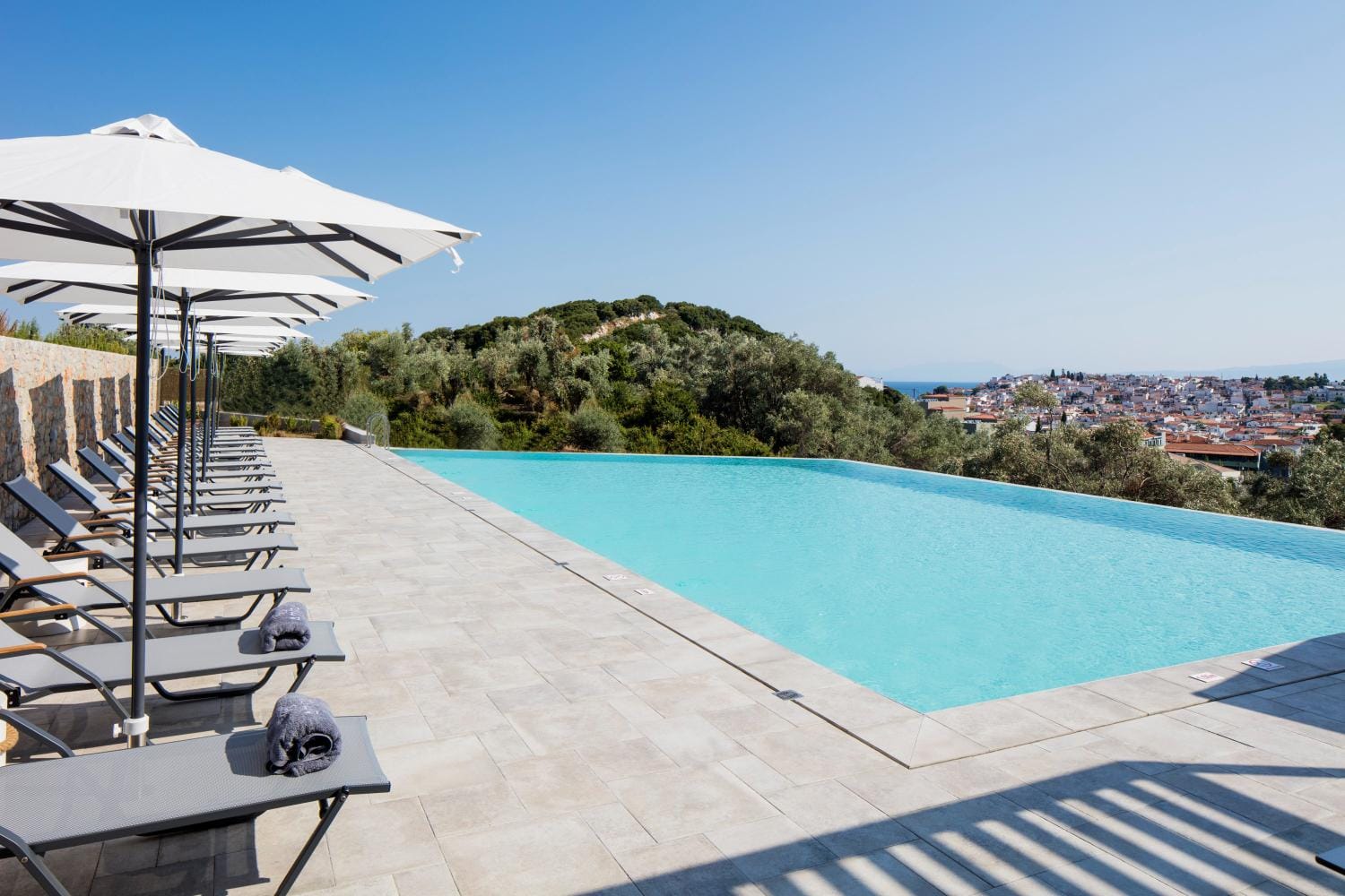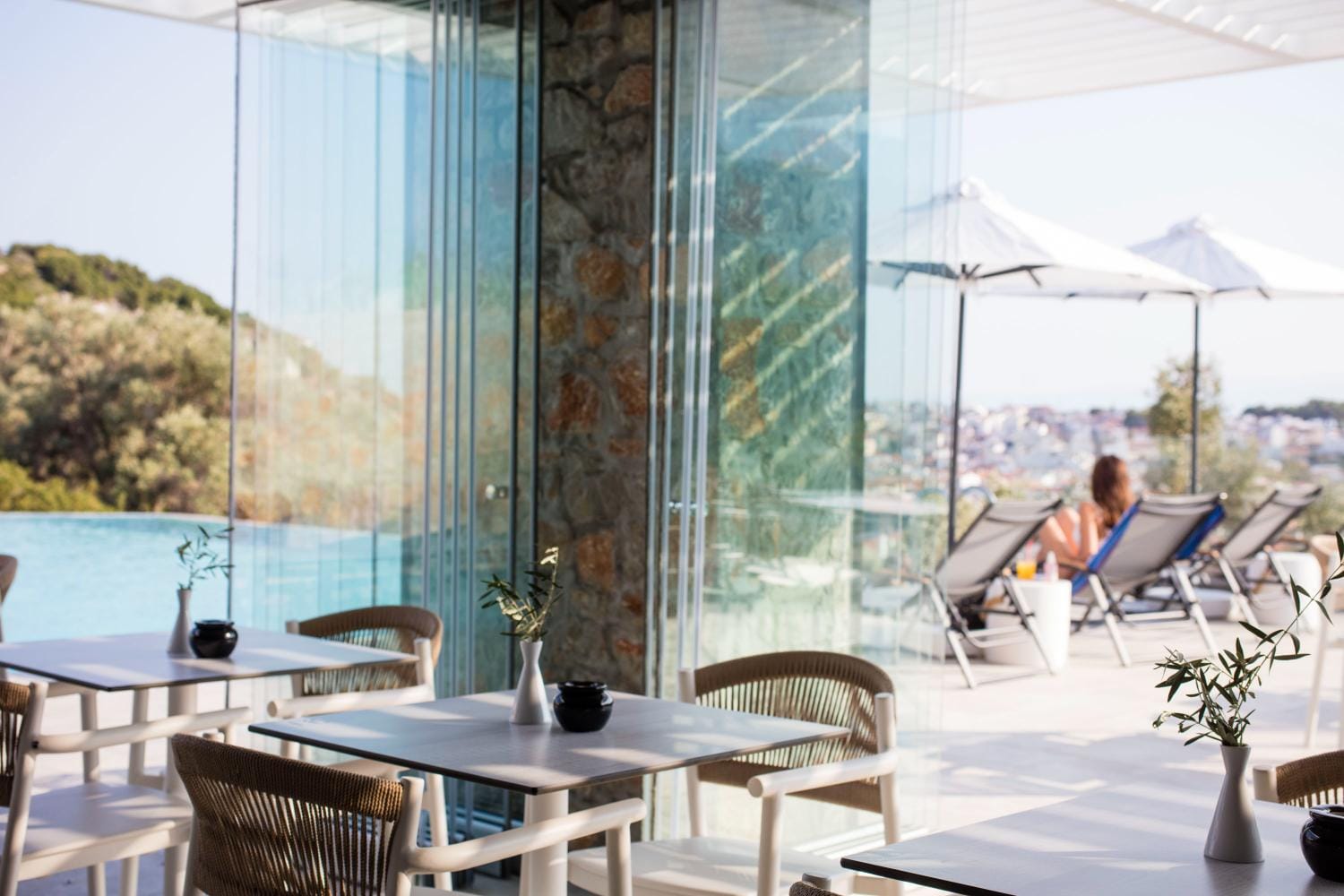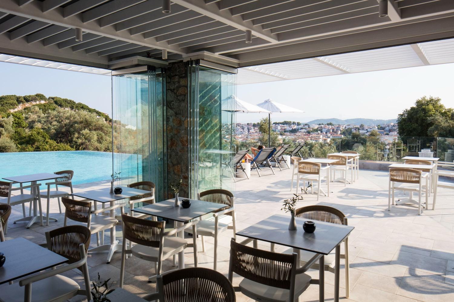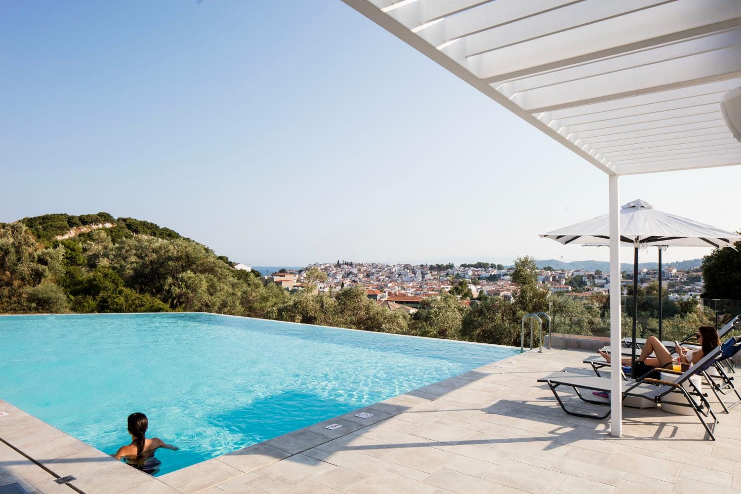 Overlooking the town of Skiathos and the Aegean sea from an elevated mount area, this brand new luxury hotel offers upscale accommodation with a free parking, surrounded by a serene lush green landscape. Amira Hotel architecture follows a minimal design boosted by the fusion of the elements of earth and water, creating an atmosphere of an unpretentious, natural opulence. The embracing warmth of wood and stone and the revitalizing coolness of the pool, calibrate your senses to their natural balance, welcoming you to experience a unique stay in graceful Skiathos.