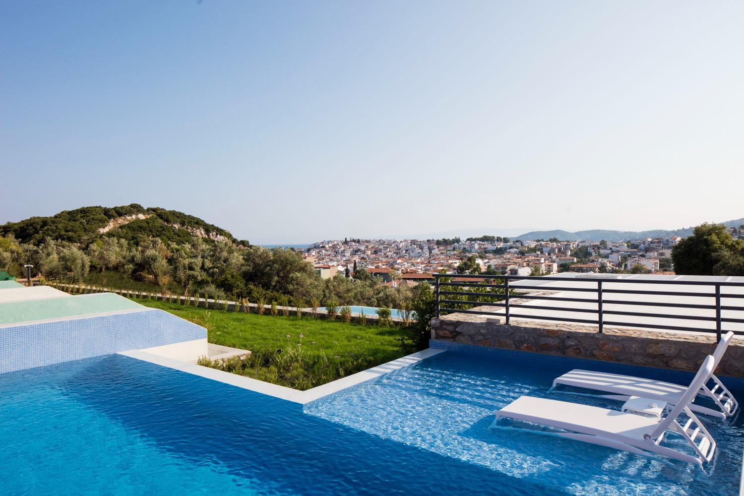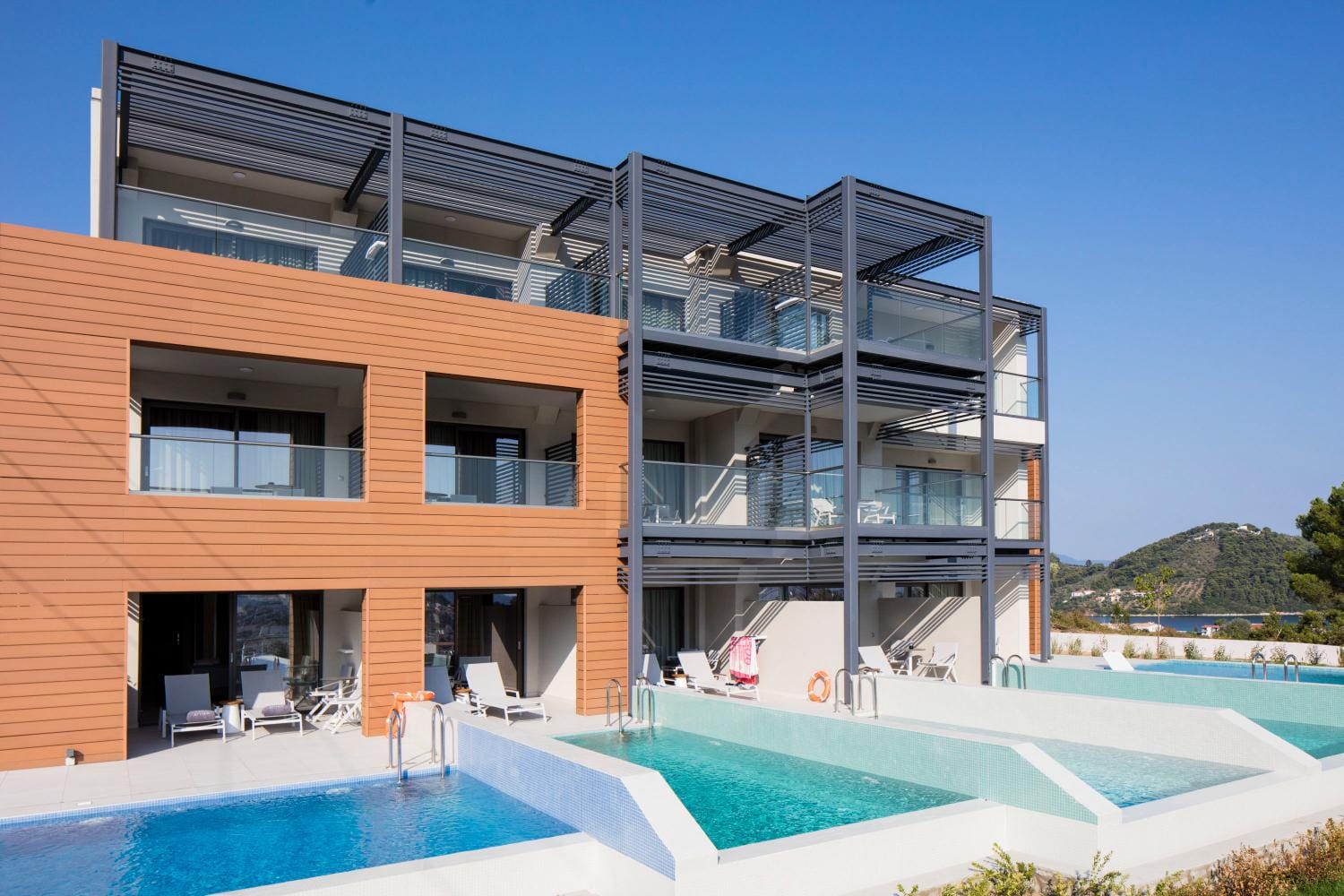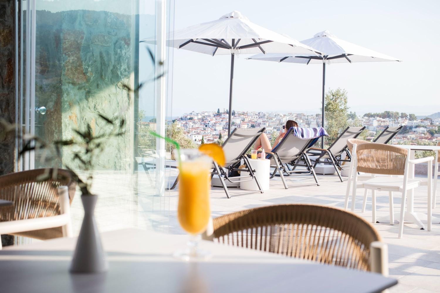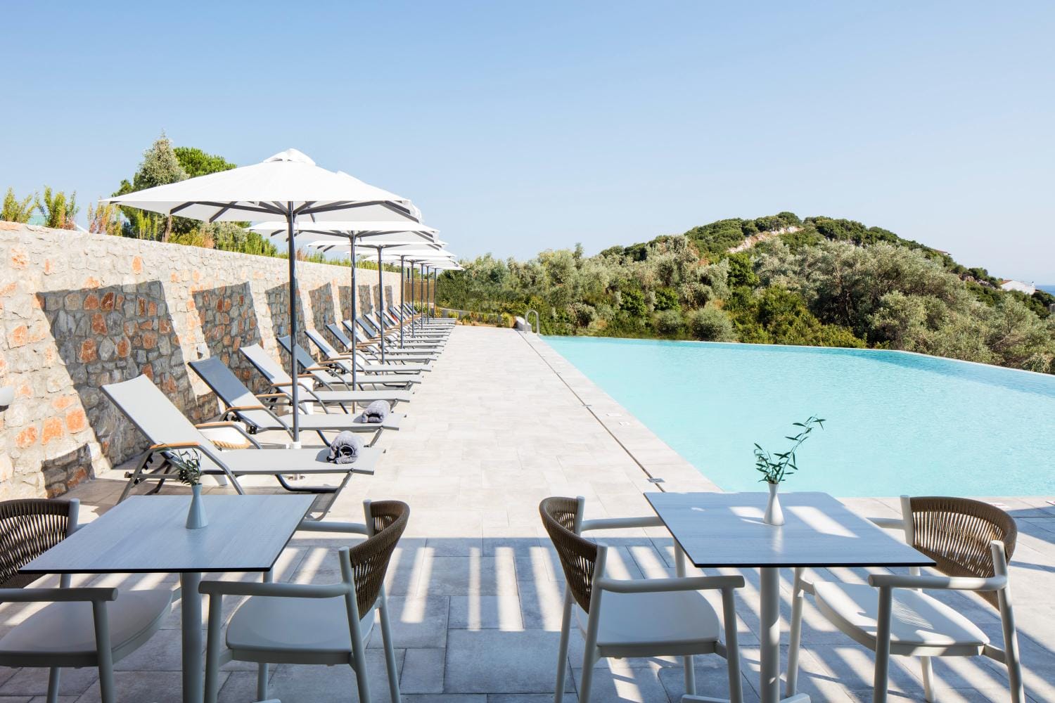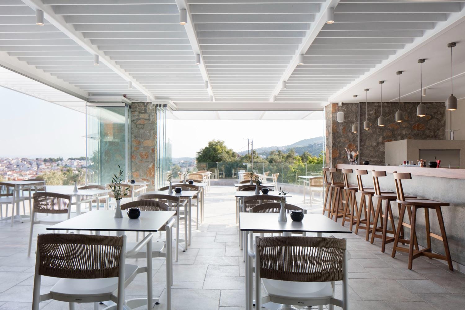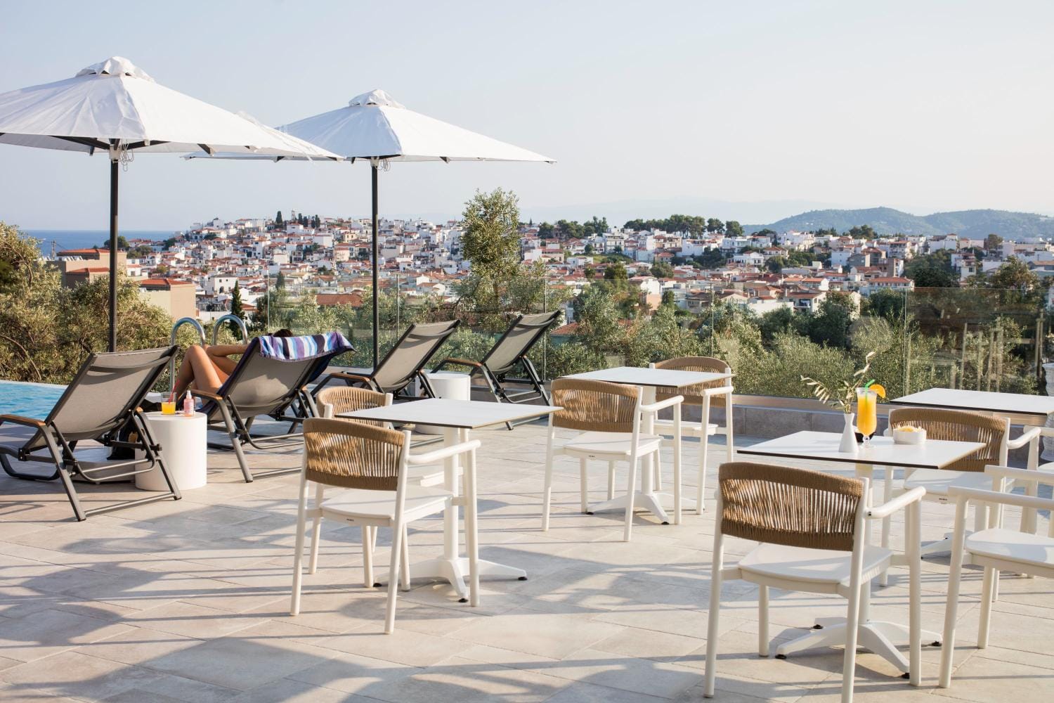 Overlooking the town of Skiathos and the Aegean sea from an elevated mount area, this brand new luxury hotel offers upscale accommodation with a free parking, surrounded by a serene lush green landscape. Amira Hotel architecture follows a minimal design boosted by the fusion of the elements of earth and water, creating an atmosphere of an unpretentious, natural opulence. The embracing warmth of wood and stone and the revitalizing coolness of the pool, calibrate your senses to their natural balance, welcoming you to experience a unique stay in graceful Skiathos.