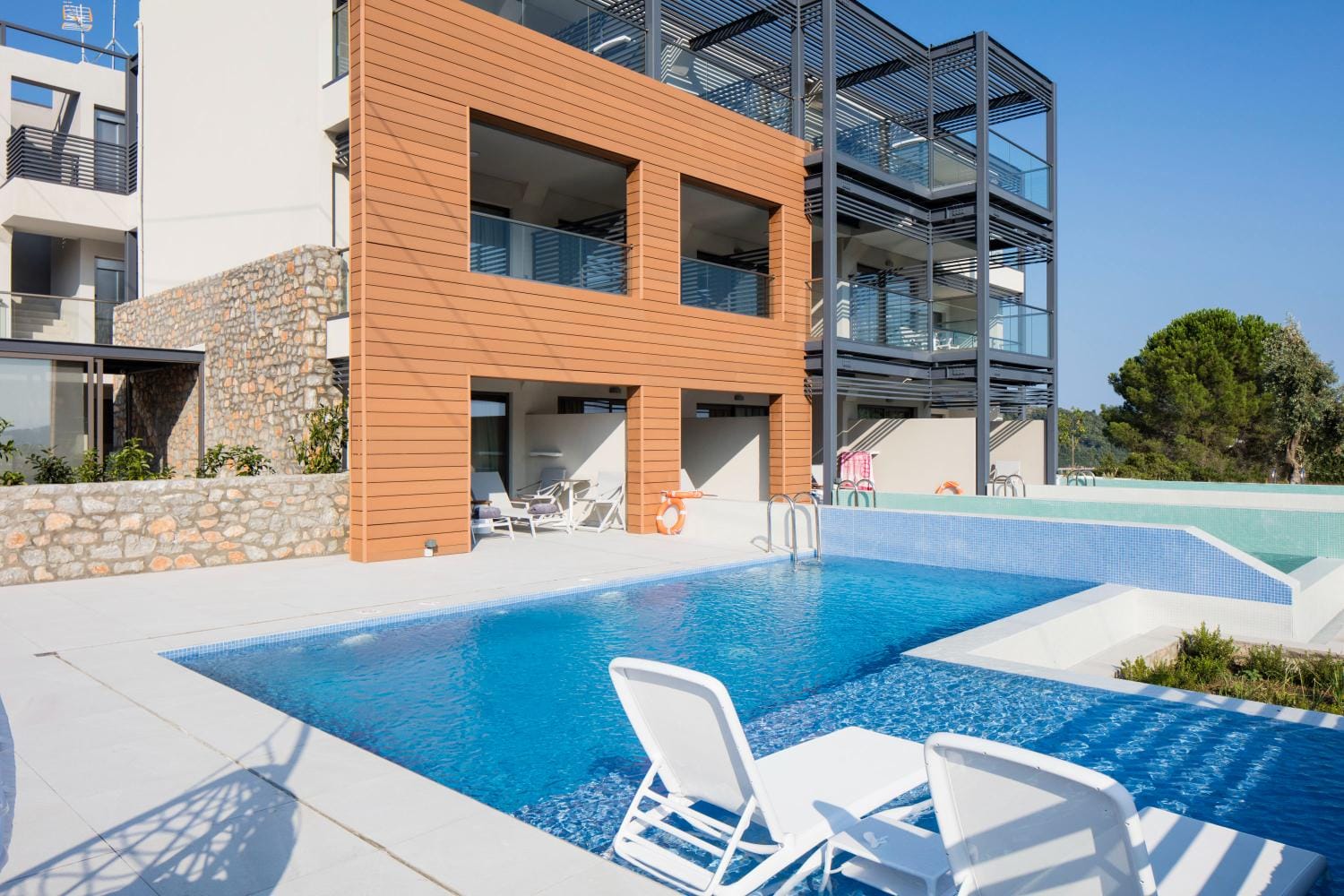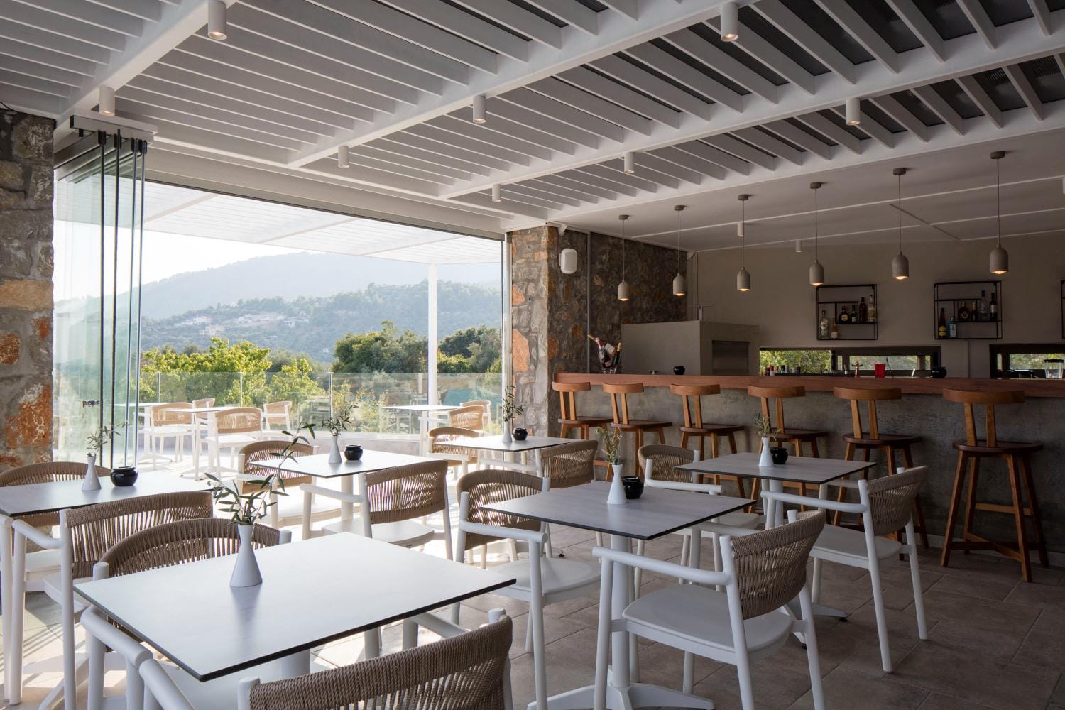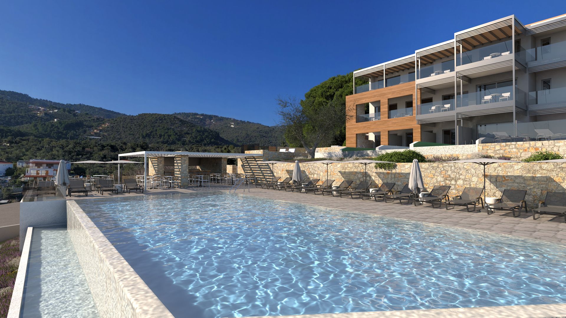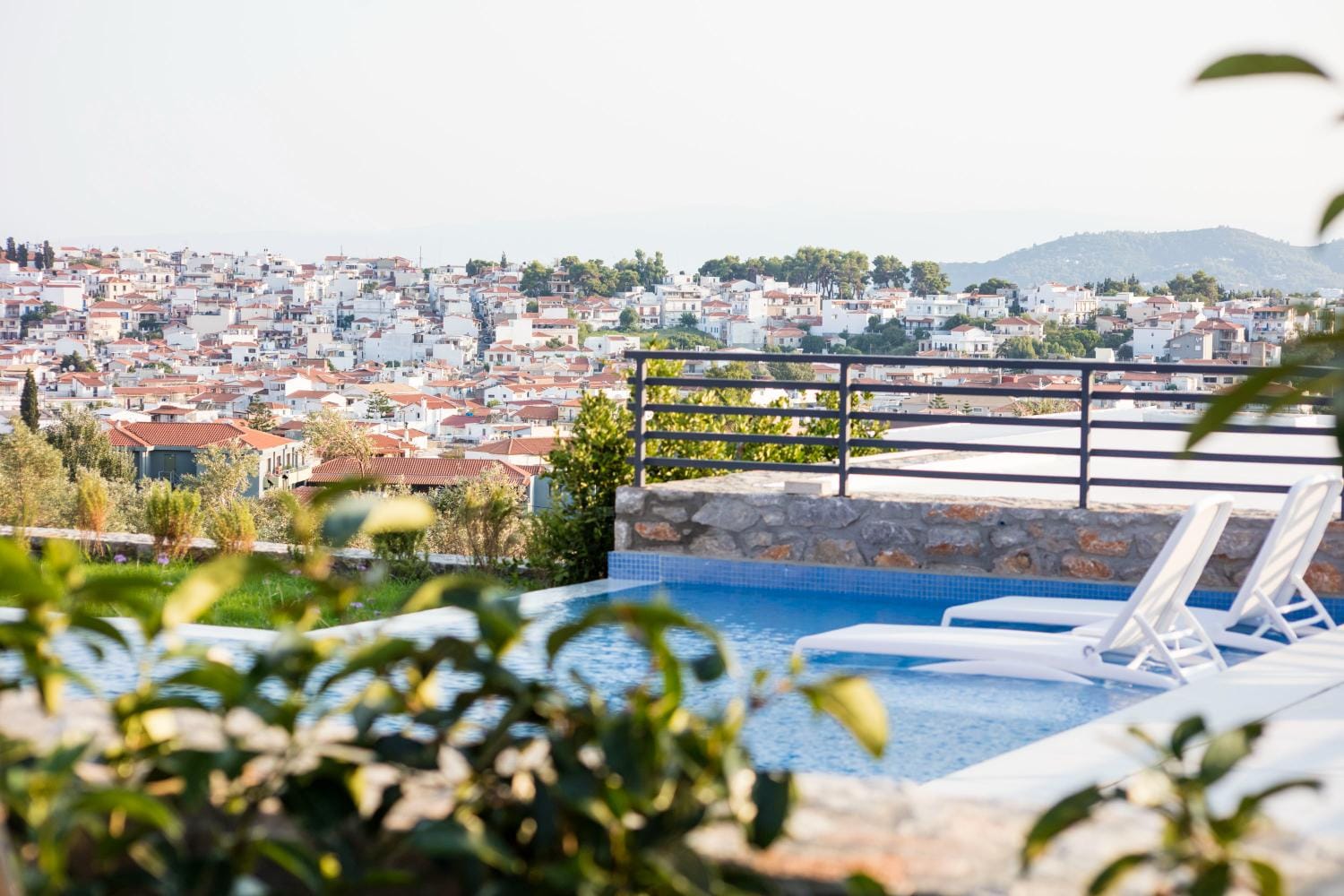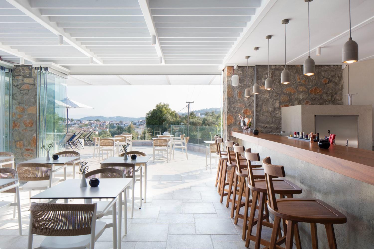 Overlooking the town of Skiathos and the Aegean sea from an elevated mount area, this brand new luxury hotel offers upscale accommodation with a free parking, surrounded by a serene lush green landscape. Amira Hotel architecture follows a minimal design boosted by the fusion of the elements of earth and water, creating an atmosphere of an unpretentious, natural opulence. The embracing warmth of wood and stone and the revitalizing coolness of the pool, calibrate your senses to their natural balance, welcoming you to experience a unique stay in graceful Skiathos.