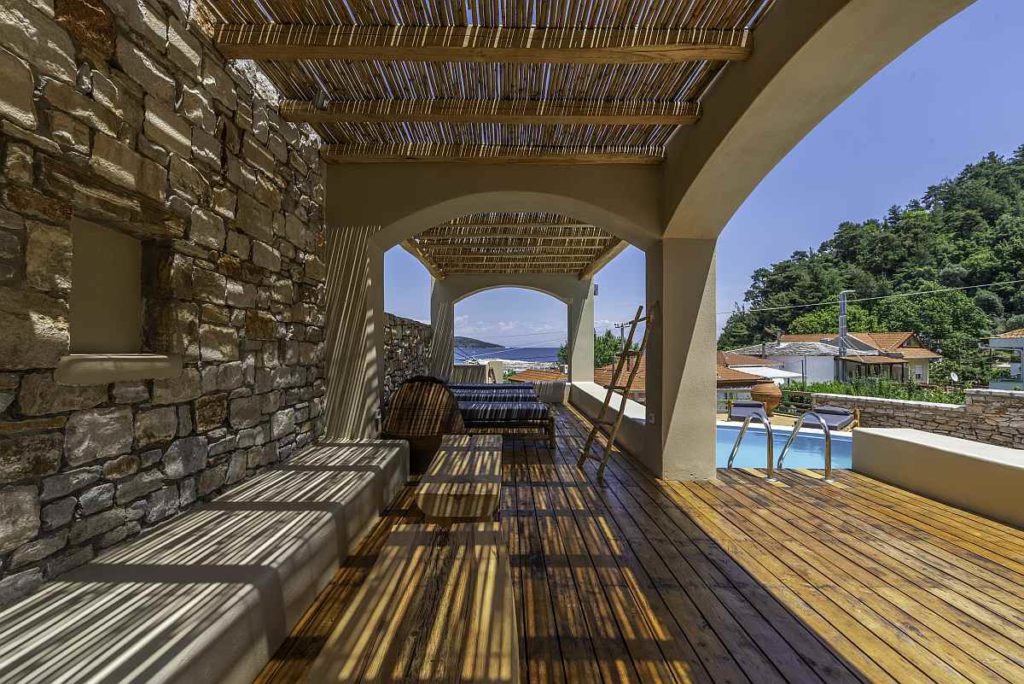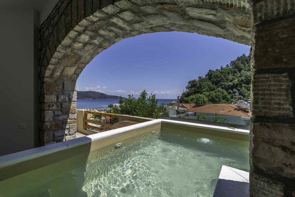 Meli Suites is the ultimate in laidback luxury. It is located in Skala Potamia just a few seconds from the Crysi Akti beach, one of the most touristic areas in Thasos. Completely surrounded by nature and overlooking the sea, the architecture of this new property is distinguished by its elegance and it is fully characterized by the Greek island architecture. By seating in Meli Suites, you see a unique combination of the blue horizon, the sea and the green of the mountain letting your feelings and thoughts travel away. An exceptional view combined with an elegant architecture is the best choice for you to have.. Something to Remember!