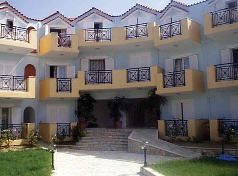 This apartment hotel enjoys a great location in Alykes Katastari around 600 m from the beach. It is just 500 m from the centre of Alykes, whilst restaurants, bars and links to the public transport also lie in the immediate vicinity. The closest town, Zante, is only 15 km away and the airport is roughly 18 km away. The beach with the famous shipwreck of Zakynthos is located roughly 15 km from the hotel. The complex comprises 3 floors and attractive architecture with a pretty garden with palm trees as well as sweet smelling jasmine and roses. In addition, a lobby, hire safes, a small supermarket and a children's playground are also available. All the rooms come with an en suite bathroom, two or three beds, satellite/cable TV and air conditioning (for an additional fee). A kitchenette with a fridge also features as does a balcony or terrace. In the garden there is a swimming pool with a separate children's pool, where guests may spend the day relaxing. There is also a poolside bar where snacks, drinks and lockers are available. Adults are able to play at the billiards table and on the slot machines, whilst children may enjoy water games.