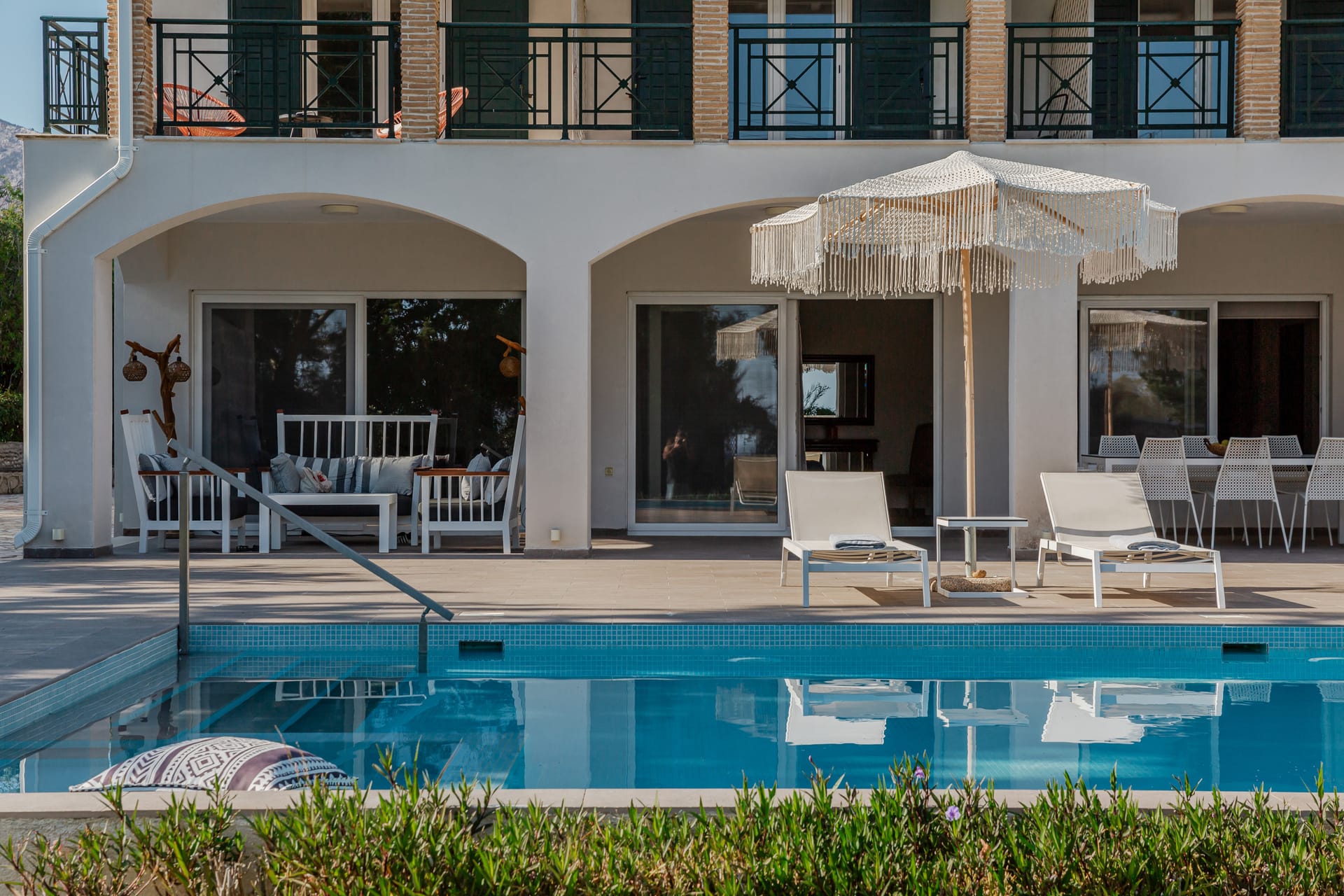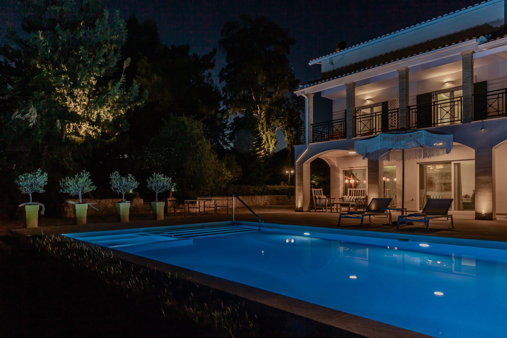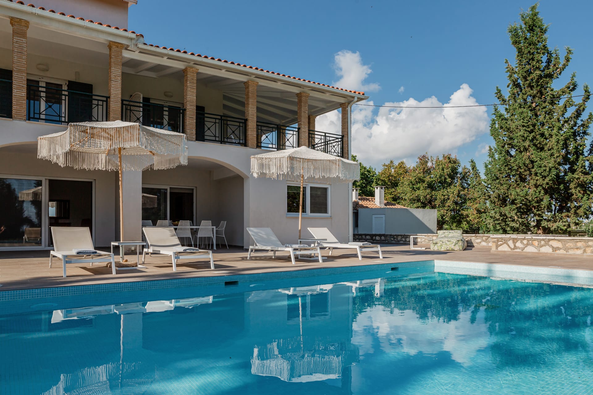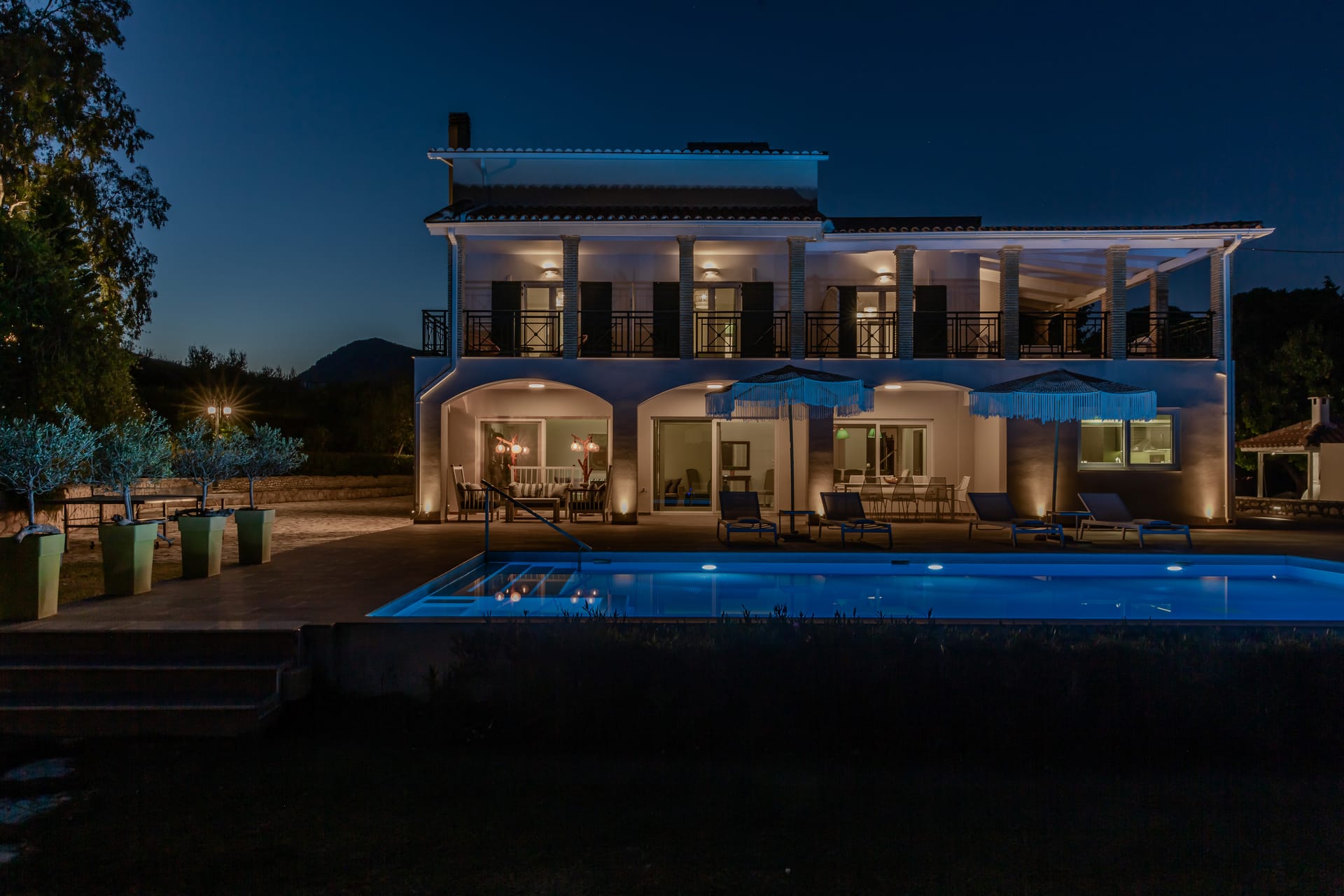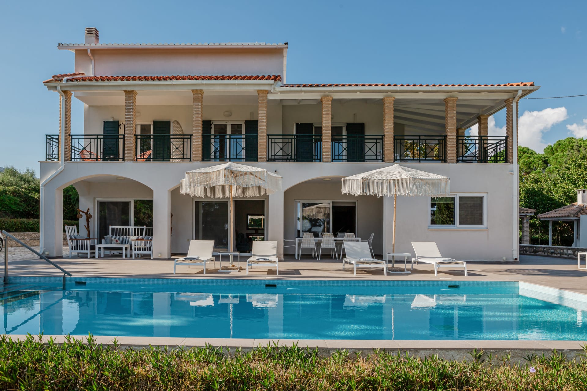 In a quiet location of Agios Sostis, Zakynthos, just a few meters away from a secluded beach, Rivazzurra is a private pool villa of supreme luxury and absolute privacy. The 50 sq.m. swimming pool, which is surrounded by umbrellas and sunbeds, has a jacuzzi function, an eco-cleaning system, a shallow end for children and night lighting. We offer any luxurious amenity you may desire, such as on-demand meal arrangements, private chef services, wonderful sports activities, dining in top-class restaurants, and countless more, coupled with the sublime experience of living in Rivazzurra Villa.