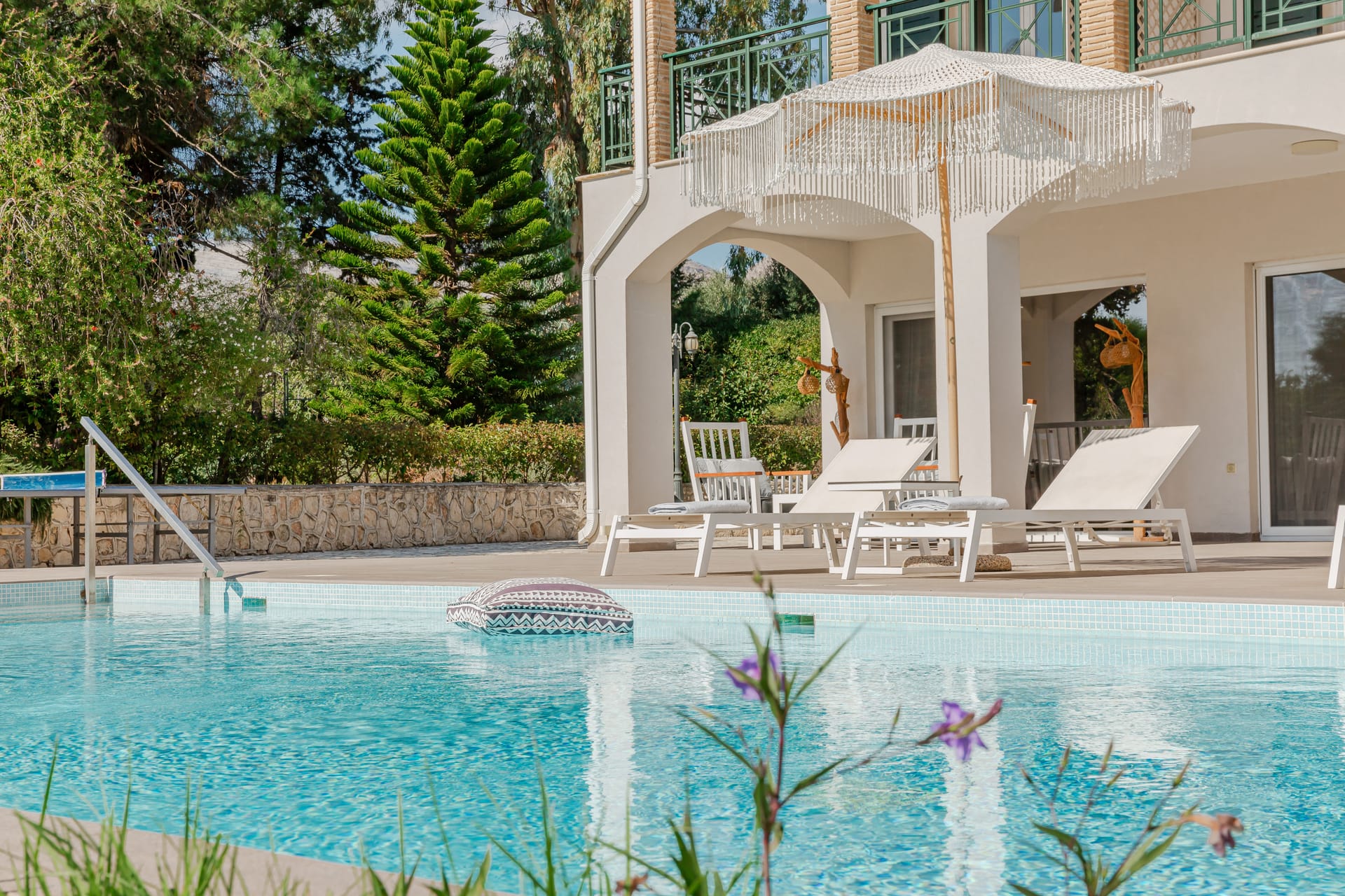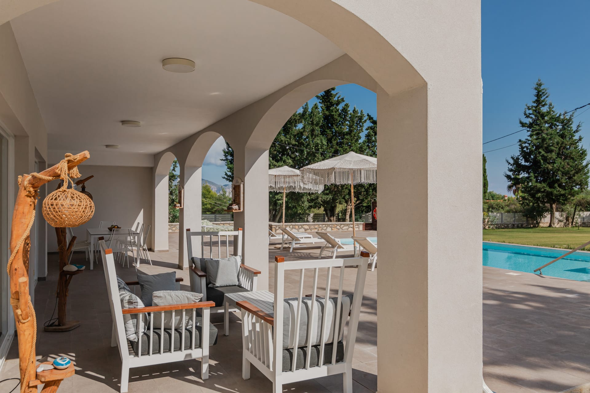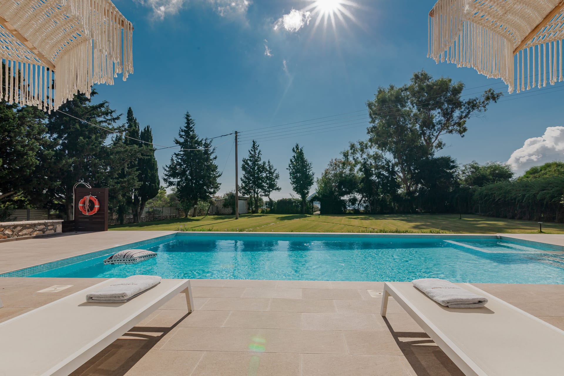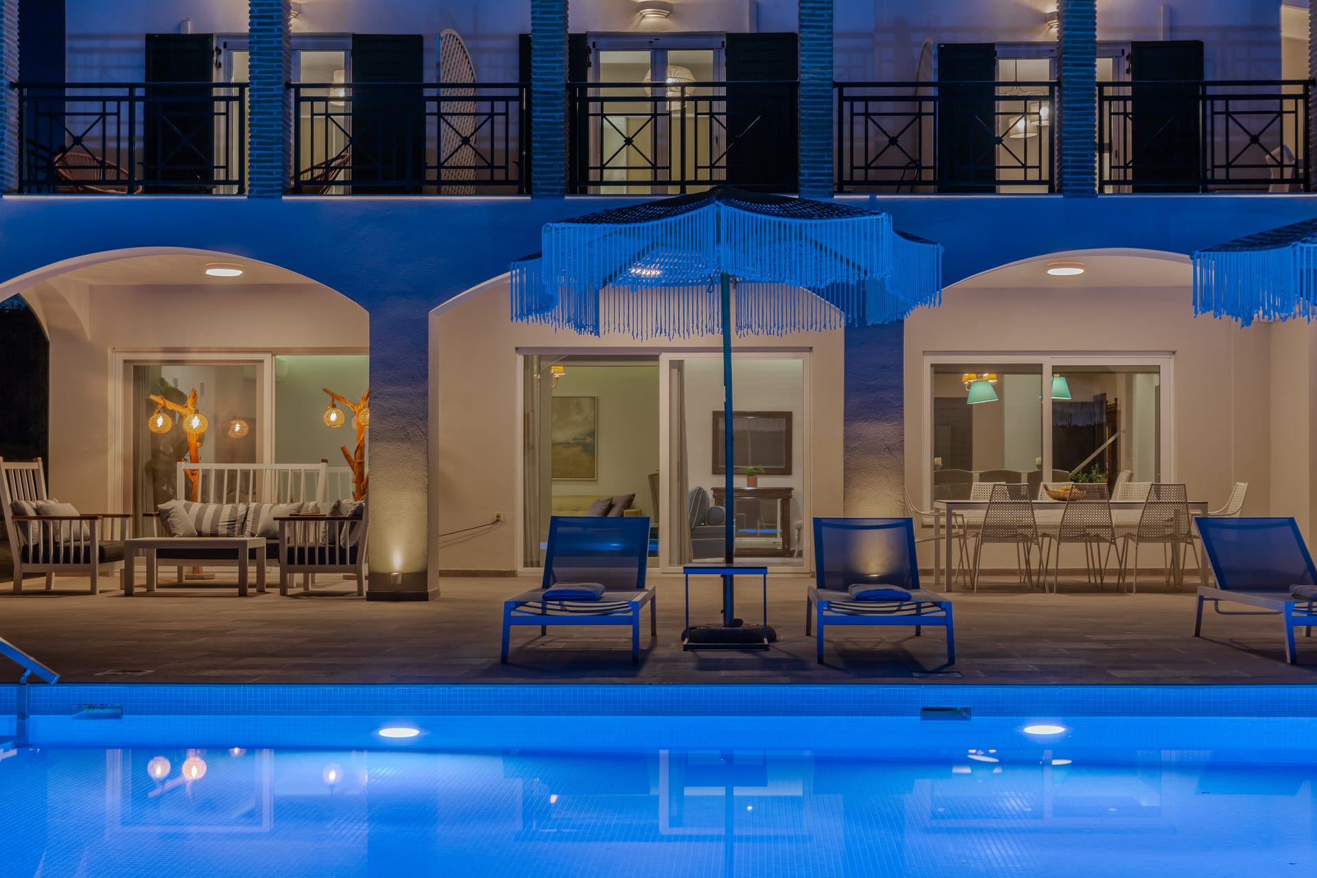 In a quiet location of Agios Sostis, Zakynthos, just a few meters away from a secluded beach, Rivazzurra is a private pool villa of supreme luxury and absolute privacy. The 50 sq.m. swimming pool, which is surrounded by umbrellas and sunbeds, has a jacuzzi function, an eco-cleaning system, a shallow end for children and night lighting. We offer any luxurious amenity you may desire, such as on-demand meal arrangements, private chef services, wonderful sports activities, dining in top-class restaurants, and countless more, coupled with the sublime experience of living in Rivazzurra Villa.