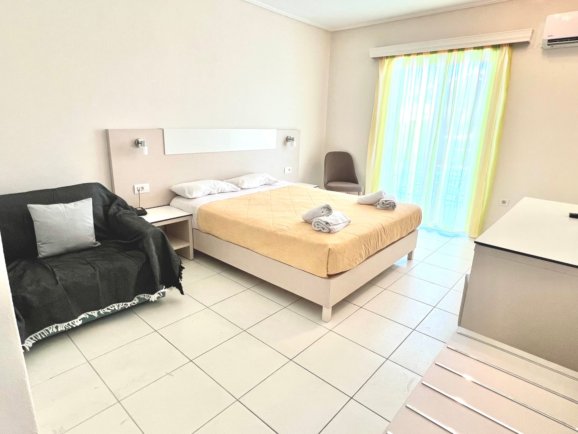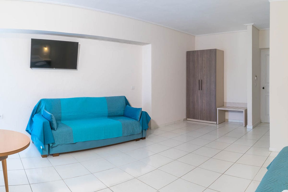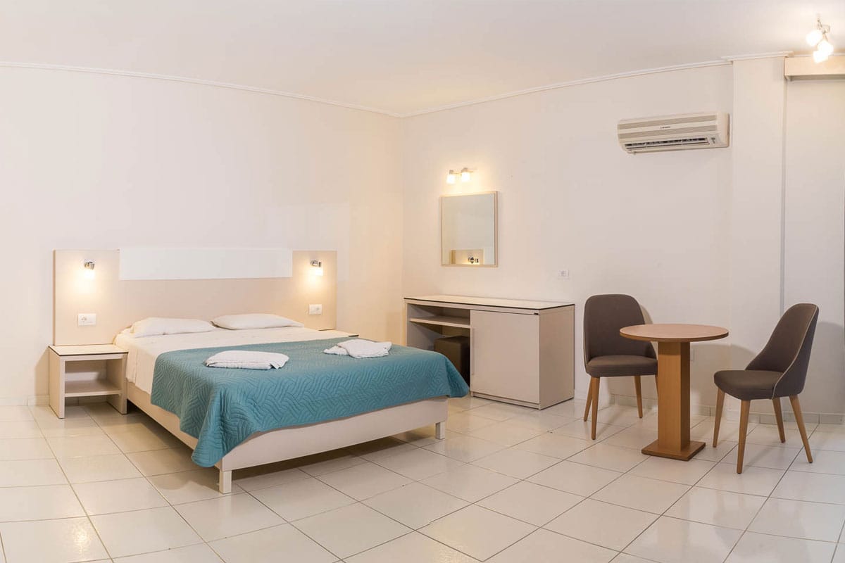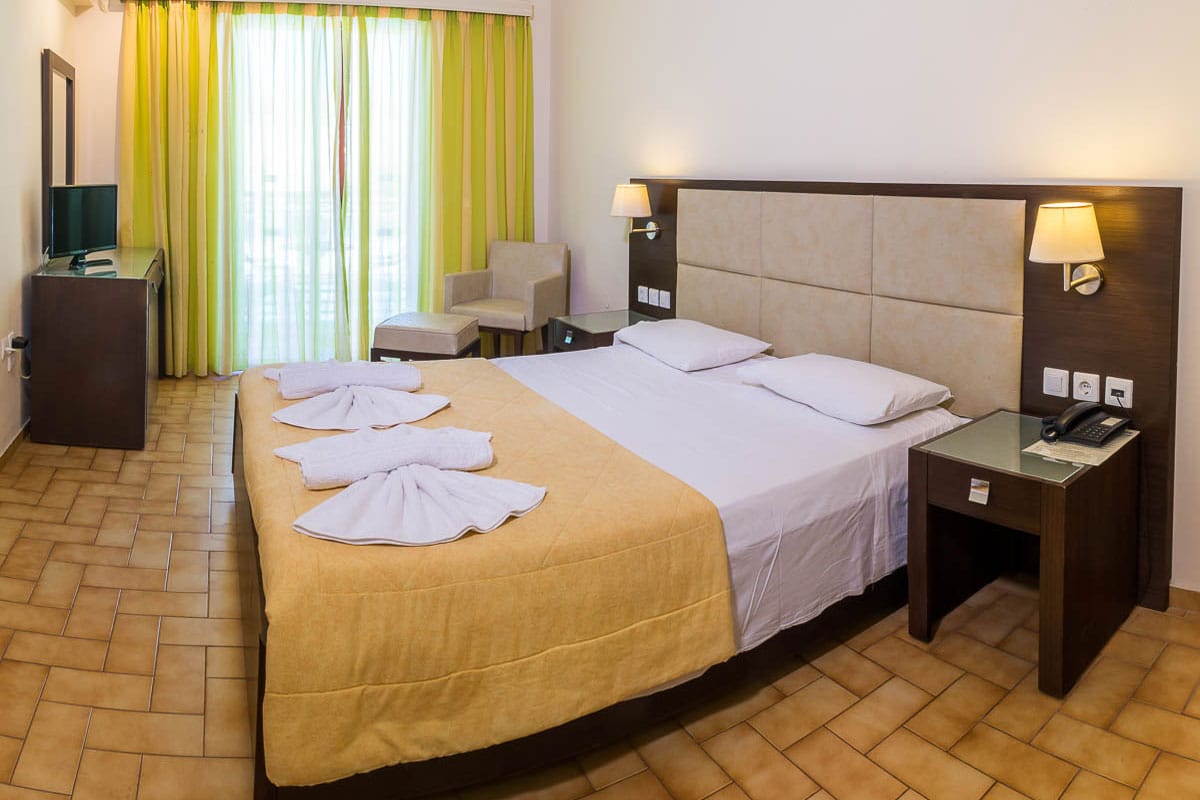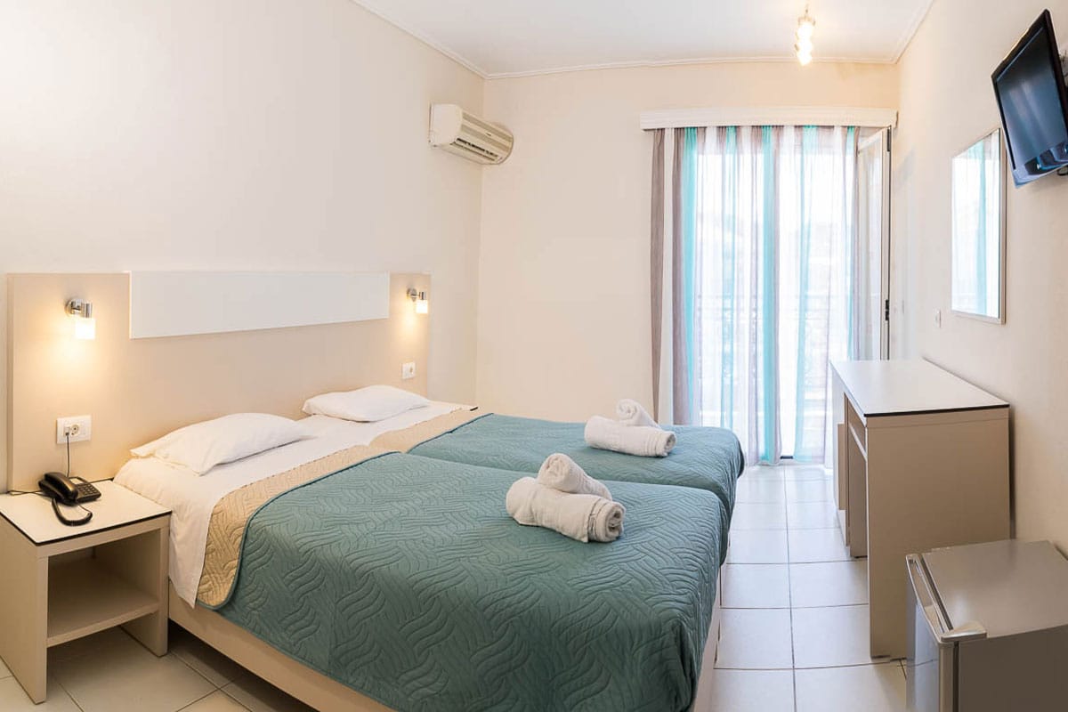 Eleana Hotel in Argassi offers a total of 44 comfortable and simply styled rooms, designed to accommodate couples, families, and small groups. Each room features essential amenities such as air conditioning, private balcony or terrace, LCD TV, fridge, telephone, hairdryer and bathroom with shower.