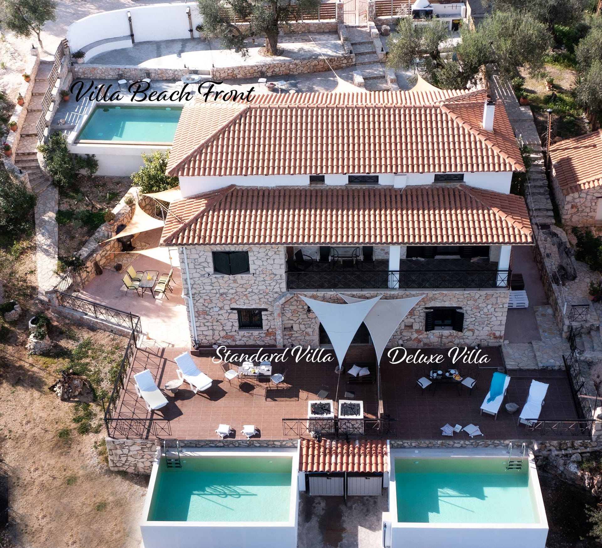 The complex features three autonomous residences, each with a private entrance, pool, veranda, and outdoor amenities like dining areas, BBQ facilities, and parking. Accommodating up to 15 guests in total, the residences can be rented individually or together. Complimentary Starlink WiFi ensures seamless connectivity throughout your stay.