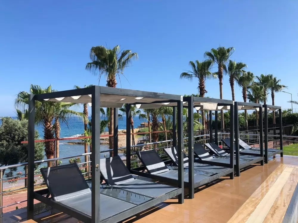 Собствен, пясъчно - чакълест. Чадъри, шезлонги и плажни кърпи на плажа и при басейна – безплатно.