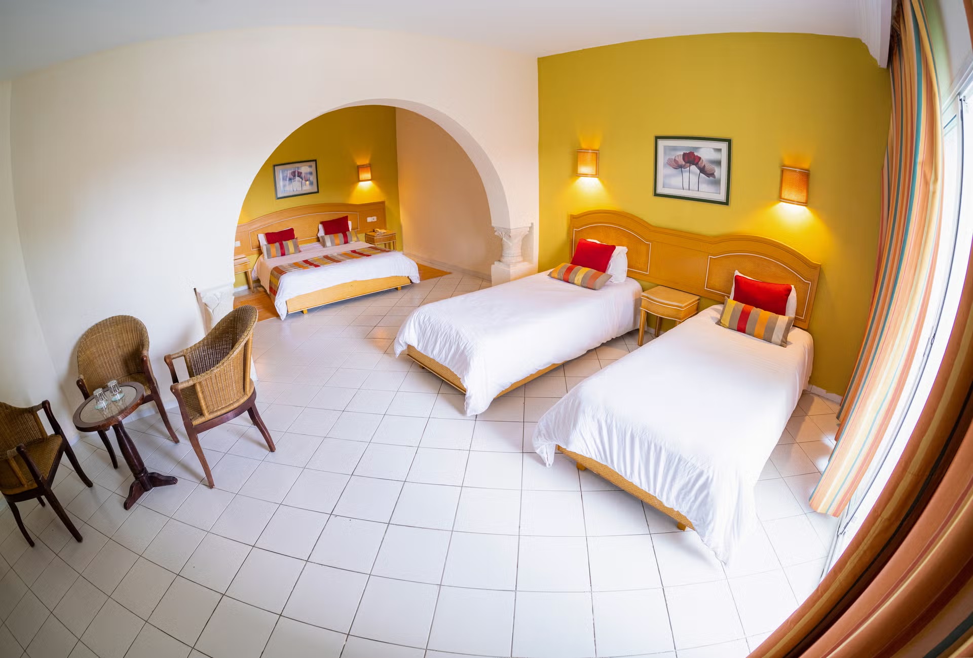 Хотелът разполага с 298 стаи, разположени в четириетажна сграда с асансьори - Standard Room (30-40 кв.м) с изглед градина или басейн.