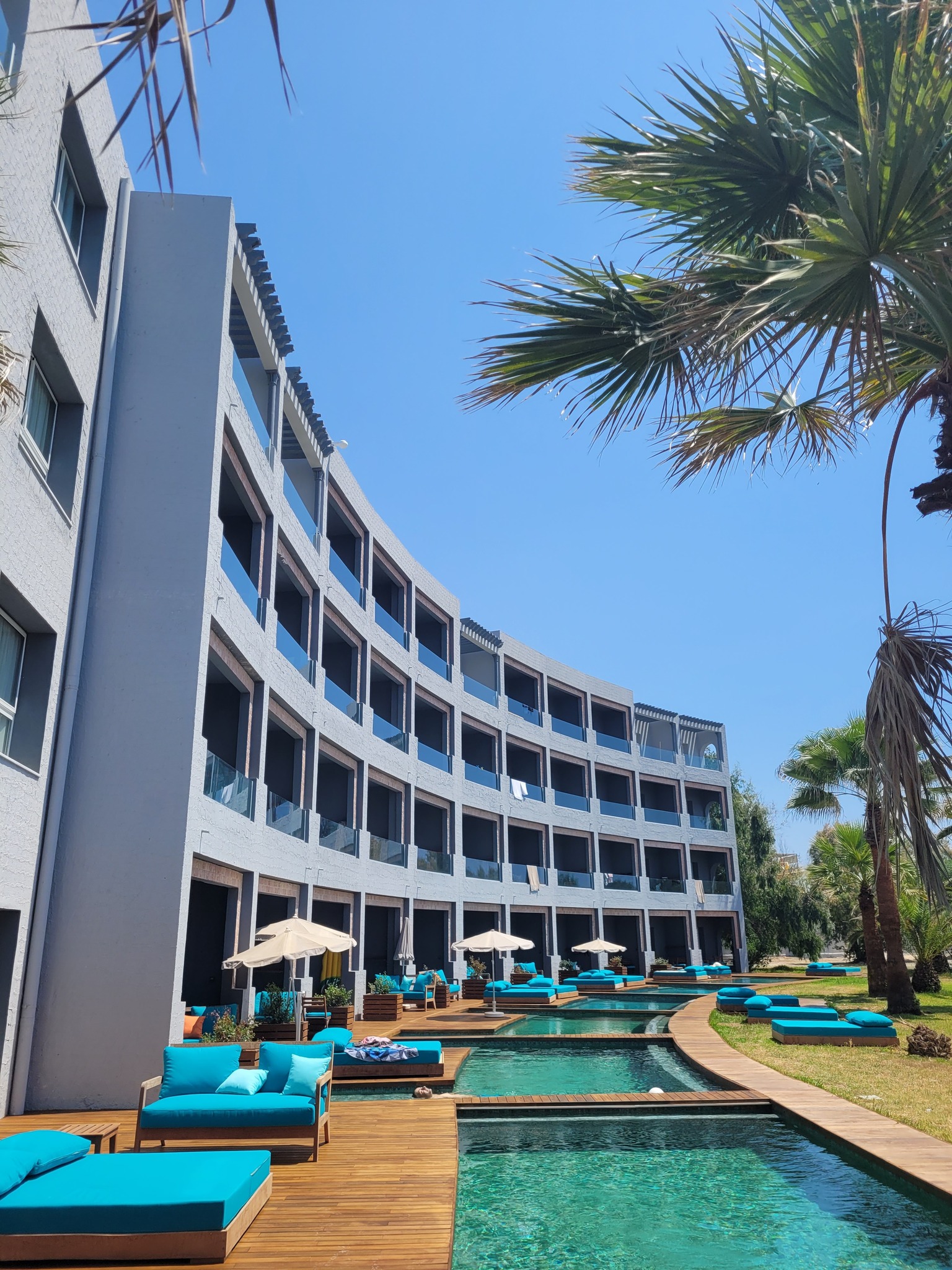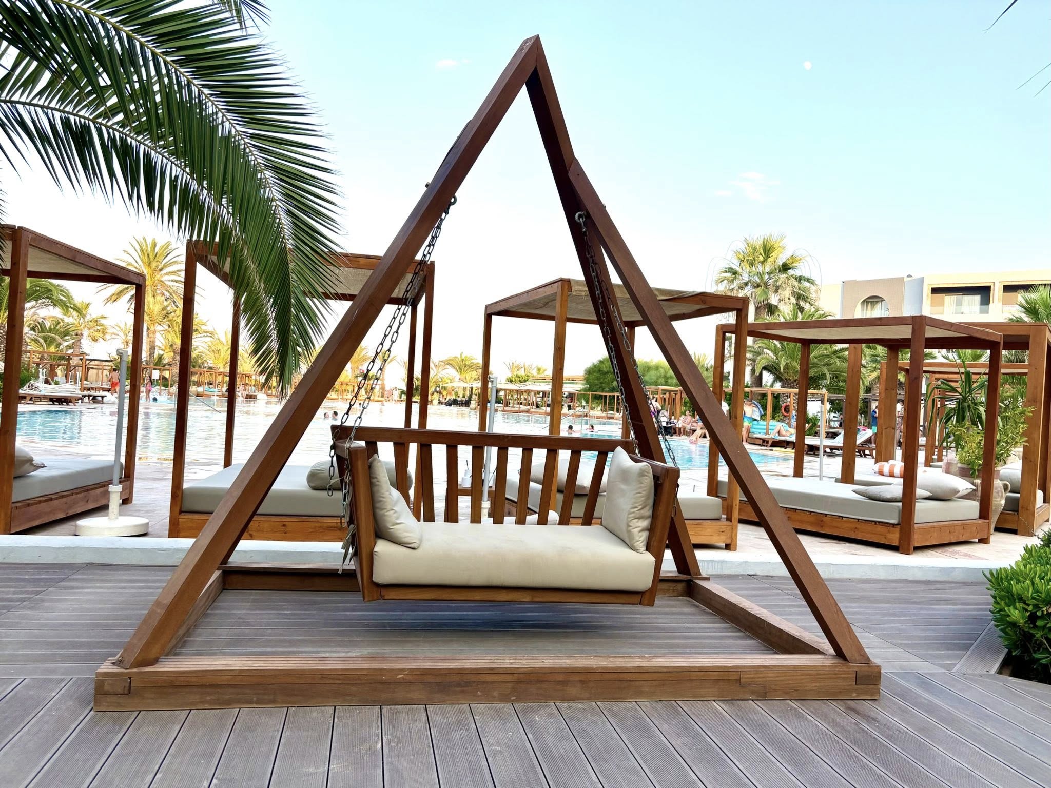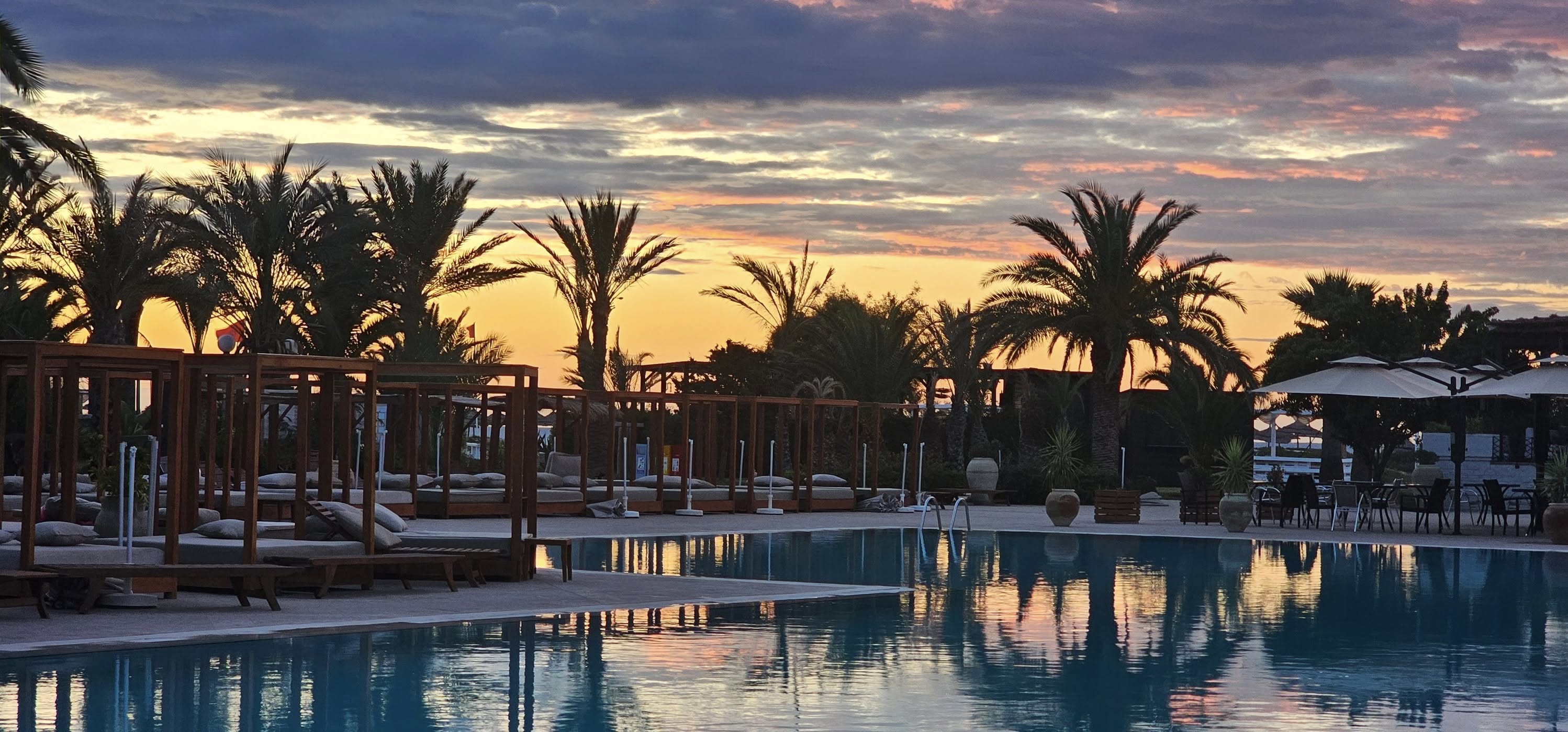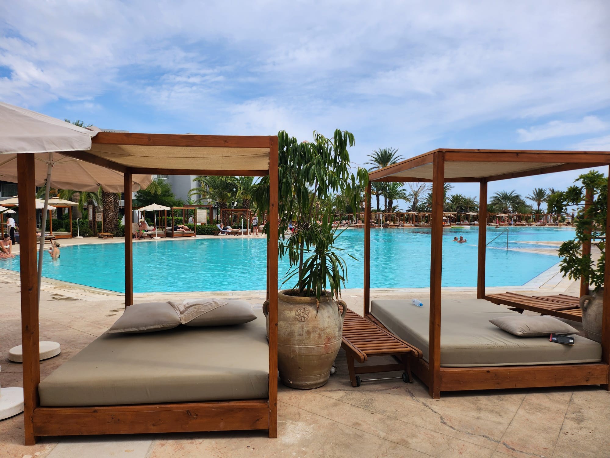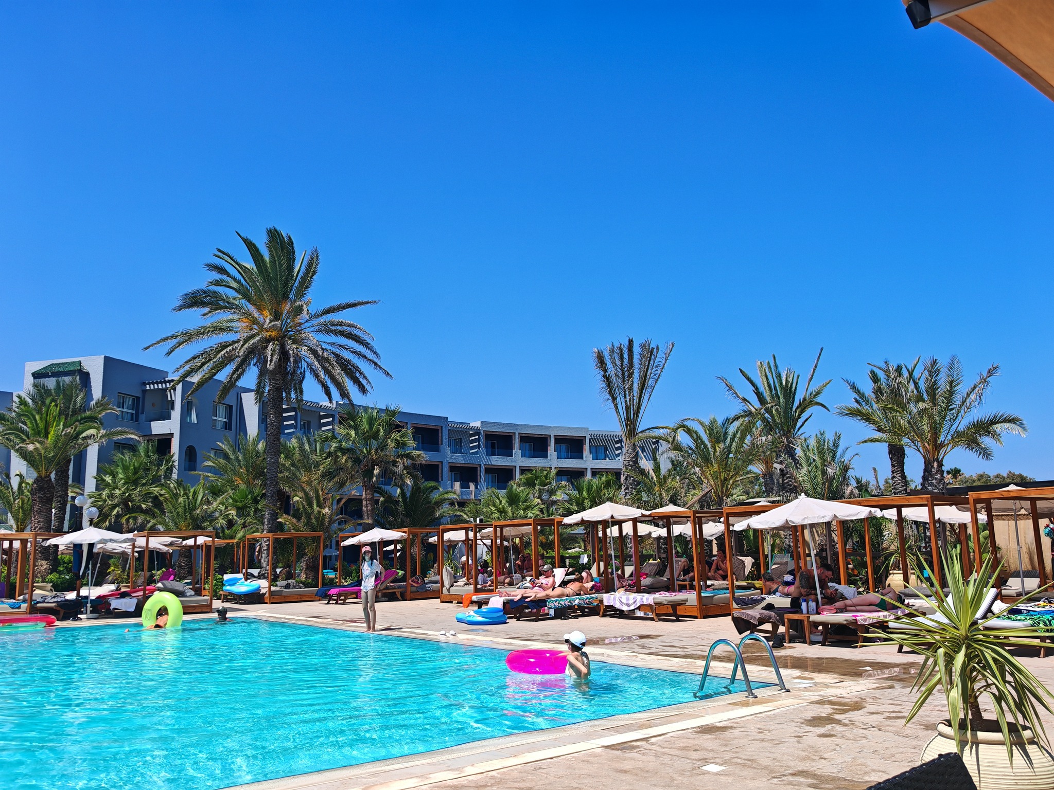Открит басейн с шезлонги и чадъри