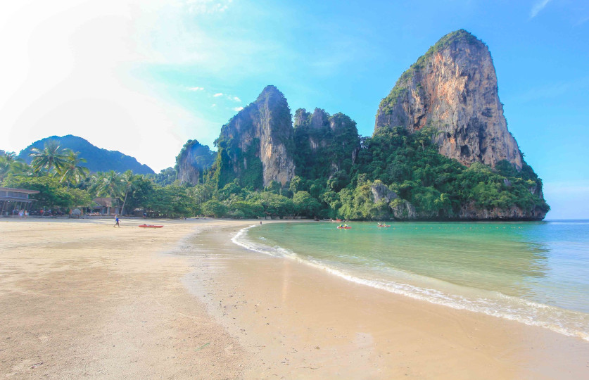- Описание: Railay Beach е известен с красивите си плажове и огромни варовикови скали, които са любимо място за катерачи от цял свят. Мястото е достъпно само с лодка и предлага релаксираща атмосфера и водни активности.