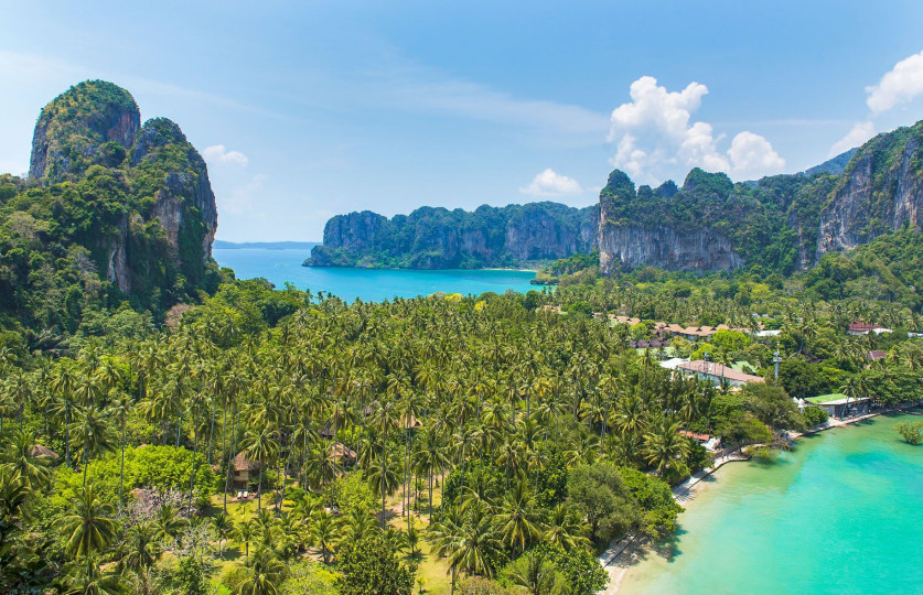 - Описание: Railay Beach е известен с красивите си плажове и огромни варовикови скали, които са любимо място за катерачи от цял свят. Мястото е достъпно само с лодка и предлага релаксираща атмосфера и водни активности.